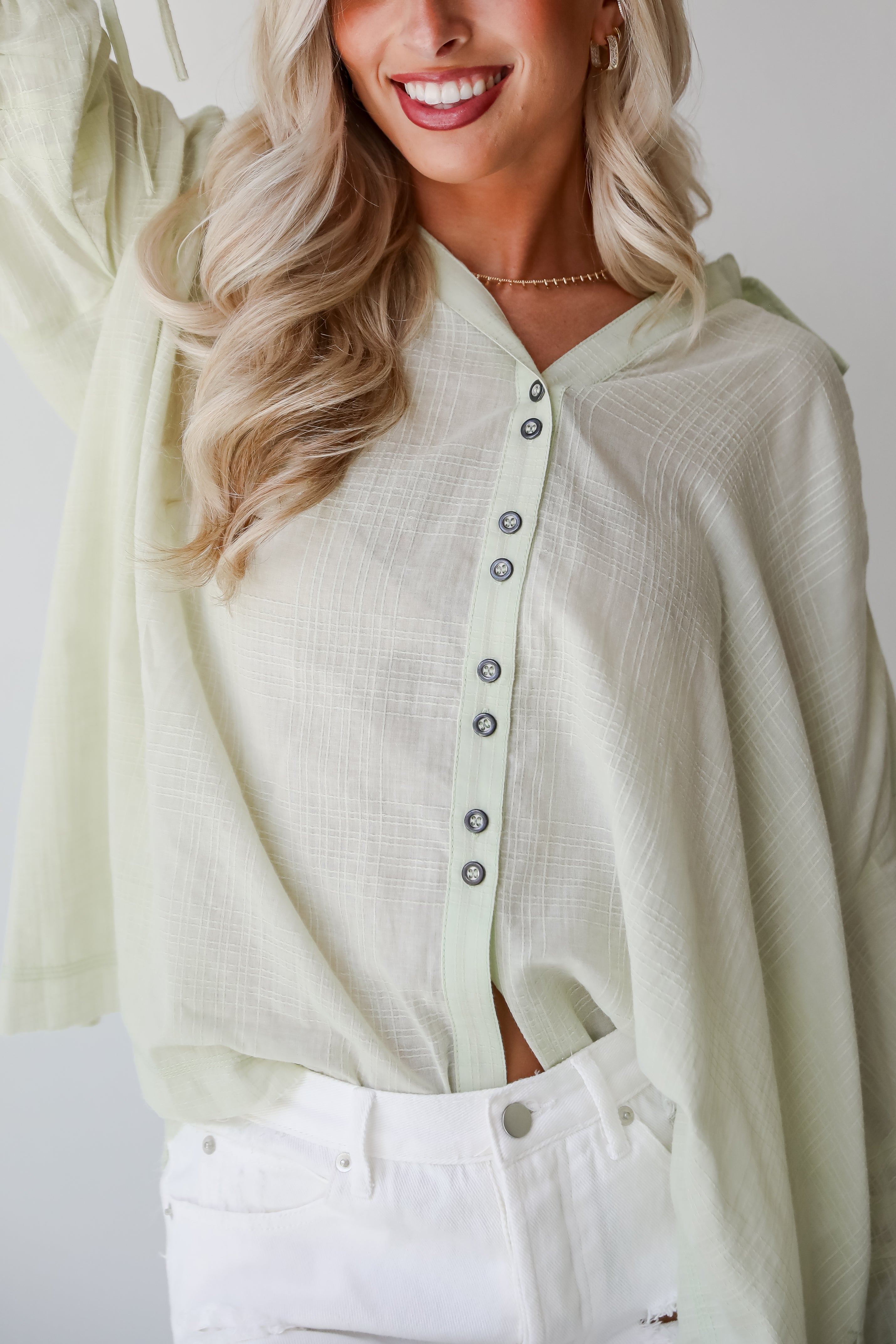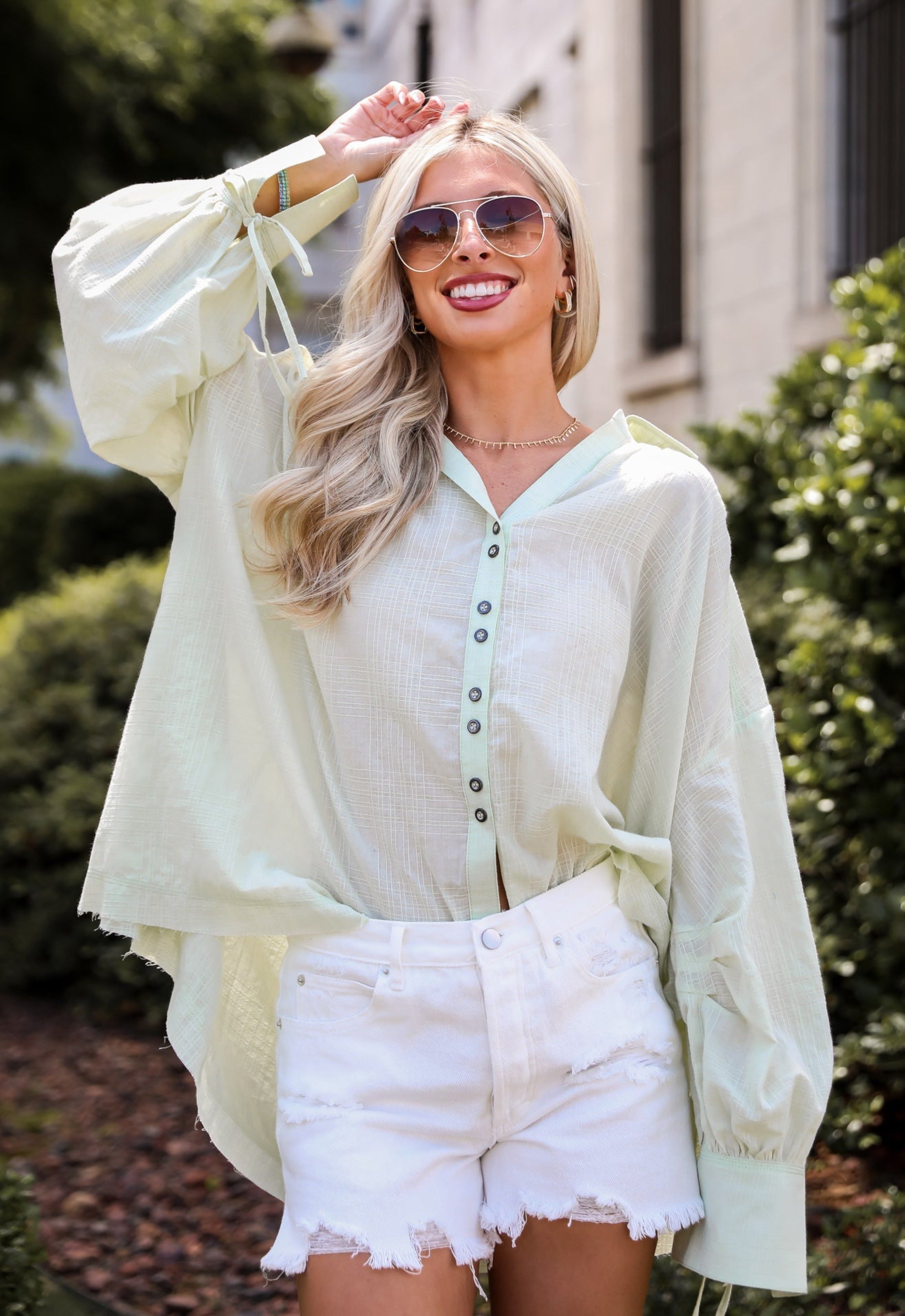Move with confidence all day long in the Stunning Demeanor Light Green Oversized Blouse! Crafted with comfort and style in mind, this blouse offers a relaxed yet polished look that's perfect for any occasion. Made from lightweight and breathable fabric, this blouse ensures all-day comfort and ease of wear. The soft, light green hue adds a touch of freshness and sophistication to your ensemble, while the oversized fit provides a modern and relaxed silhouette. Pair it with tailored pants and heels for a polished office look, or dress it down with jeans and sneakers for a casual weekend outfit!