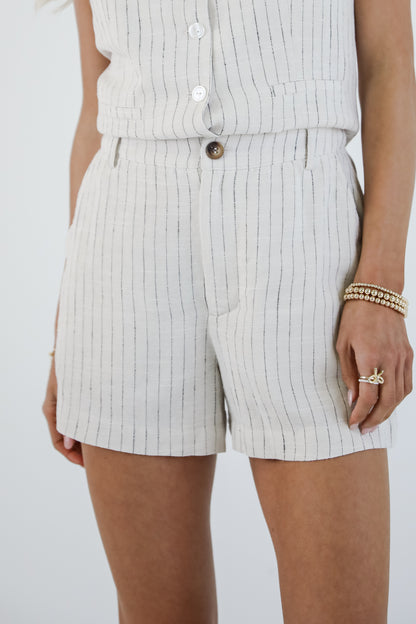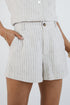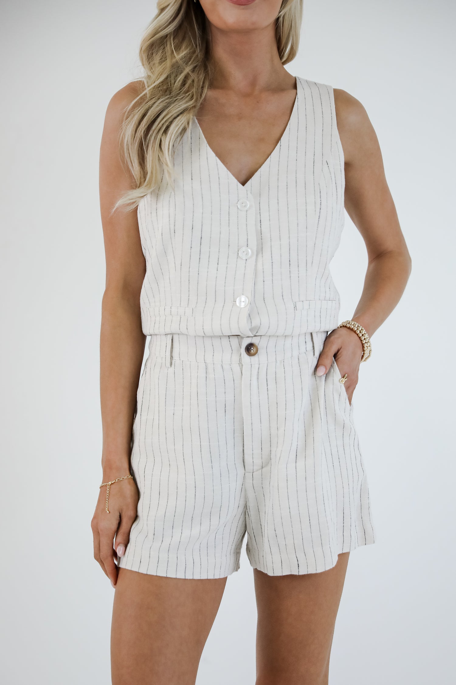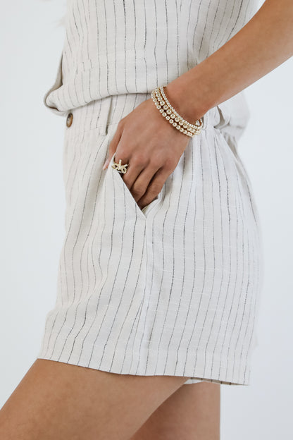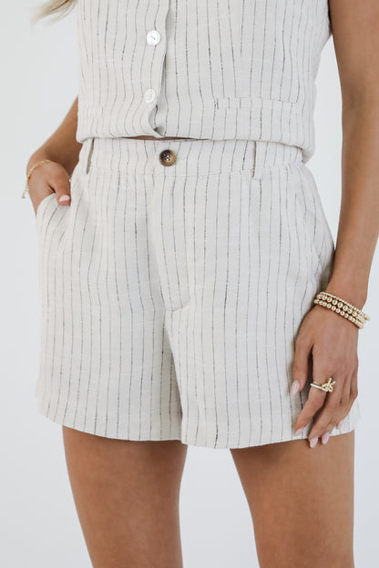 Add some "prep" to your step whenever you head out wearing the All For It Natural Striped Shorts! Designed with a flattering high-rise fit and sleek trouser-inspired details, these shorts feature vertical black stripes on a tan background for a timeless, elongating look. The structured waistband, subtle pleats, and polished silhouette make them perfect for dressing up or down. Style them with a tucked-in blouse and loafers for a refined daytime look or pair with a tank and sandals for effortless cool!