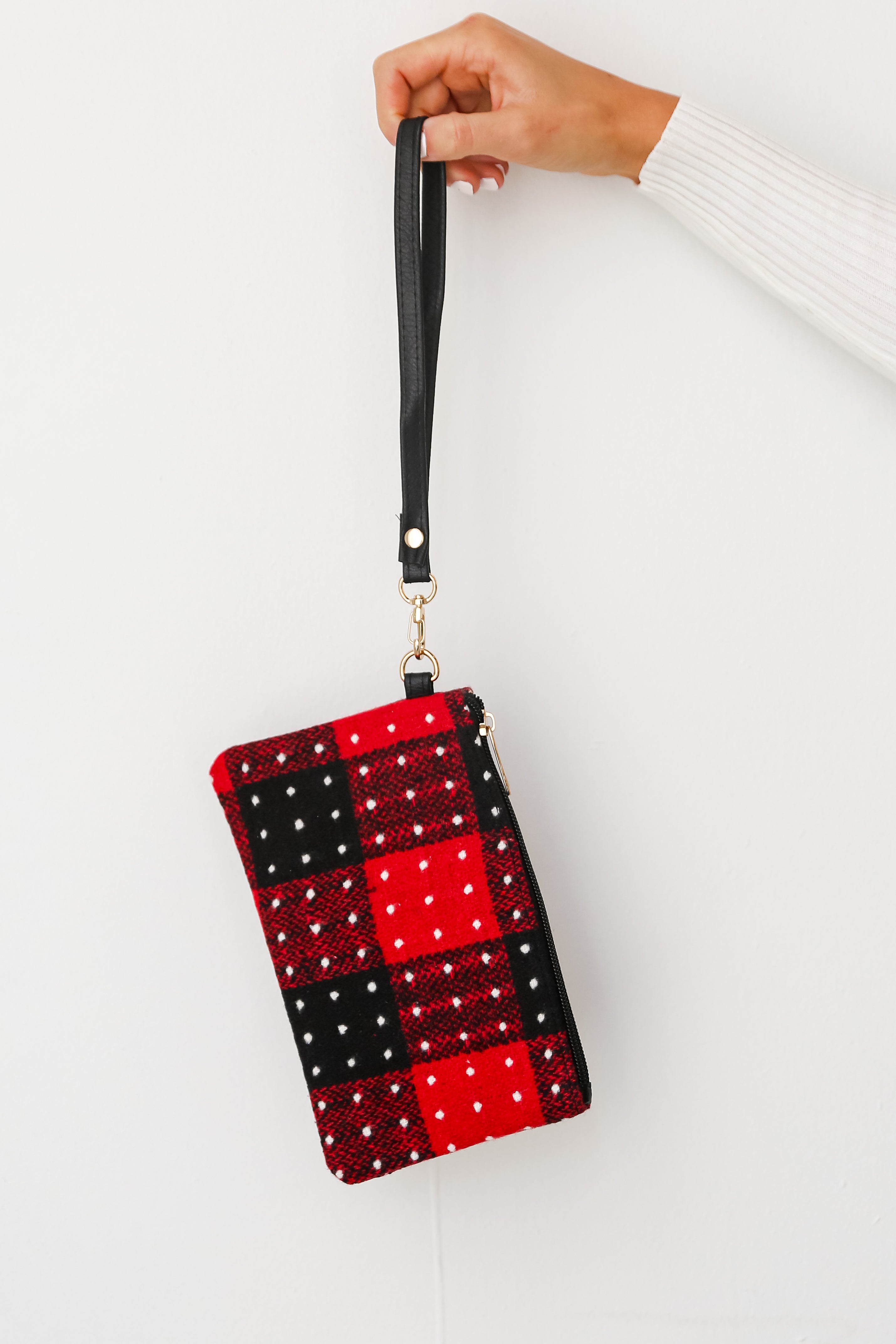 If you're into chic accessories, then you'll definitely want to add the All The Feels Red Plaid Wristlet! This chic handbag is designed with a soft knit material in a plaid polka dot print. It features a functional zipper closure and a faux leather removable wristlet strap. Pair the All The Feels Red Plaid Wristlet with any look to add a trendy touch!