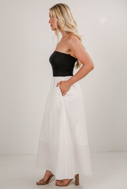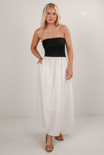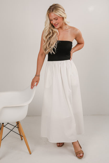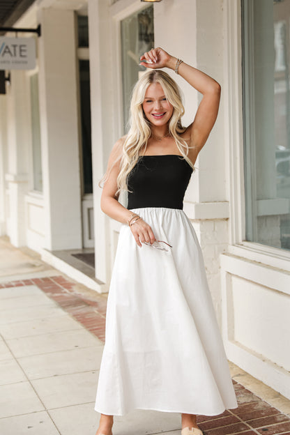 Shining the brightest is an easy feat with a chic number like the Always Been You Black Contrast Strapless Maxi Dress! This beautifully balanced piece features a soft, stretchy black jersey bodice that hugs comfortably and stays in place, paired with a lightweight white cotton skirt that flows effortlessly with every step. The contrast creates a sleek and timeless look, perfect for everything from casual outings to summer events. Just add sandals and statement earrings for an effortlessly chic ensemble!