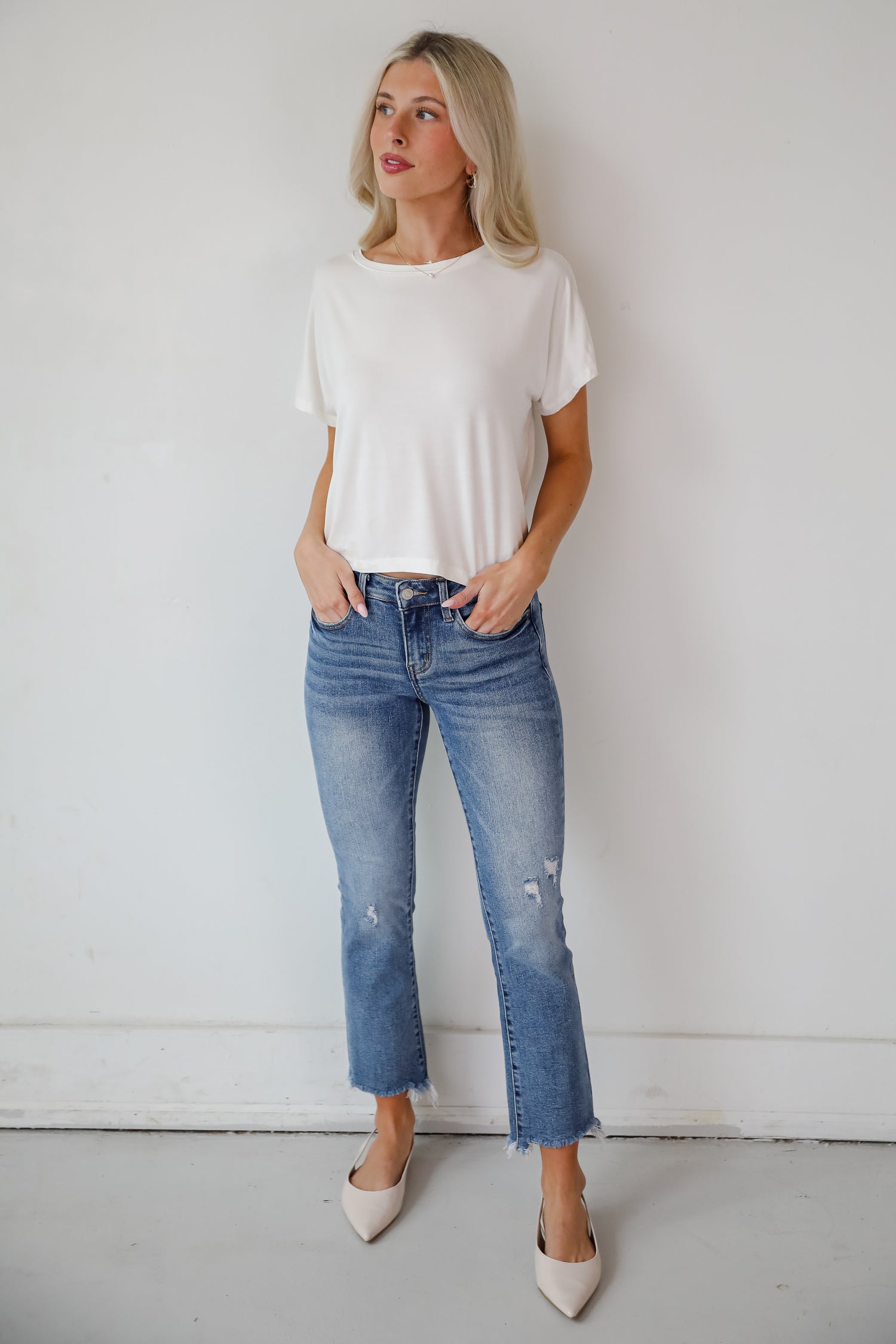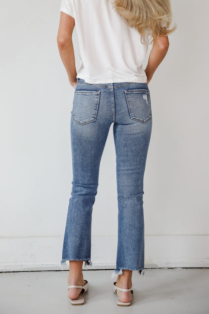 Upgrade your denim collection with the Amber Medium Wash Mid-Rise Ankle Bootcut Jeans, the perfect balance of classic and modern style! Designed with a flattering mid-rise fit, these jeans hug your curves in all the right places while offering all-day comfort. The bootcut silhouette creates a sleek, elongated look, and the ankle-length cut makes them perfect for showing off your favorite footwear. Finished with edgy frayed hems, these jeans add a touch of effortless cool to any outfit. Pair them with a blouse and heels for a dressy vibe or sneakers and a tee for a laid-back feel—either way, these jeans are a must-have staple!