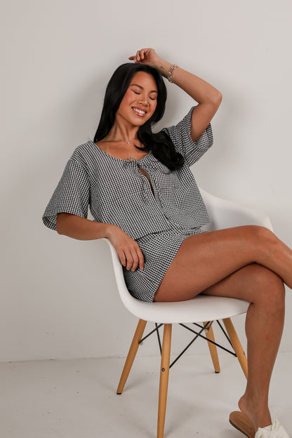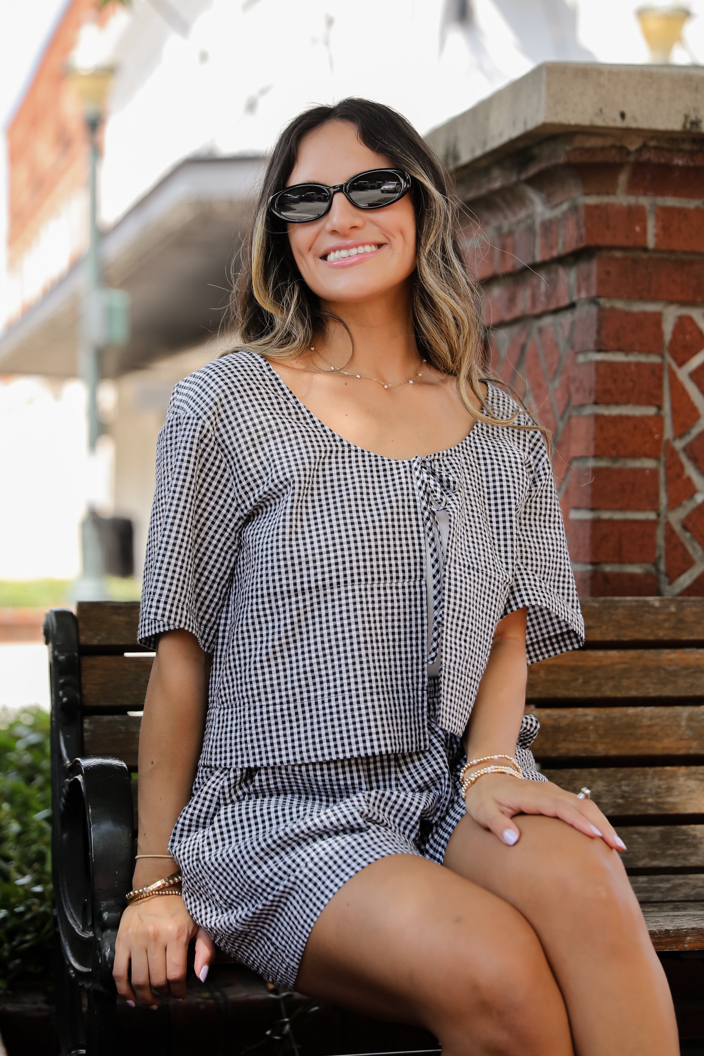 The perfect summer season needs a look to match, and the Be My Muse Black Gingham Tie Top is ready to charm everyone you meet! This playful top features a classic gingham print, short sleeves, and a flattering round neckline. The tie front detail adds a flirty, feminine touch while allowing for a customizable fit. Lightweight and breezy, it pairs perfectly with high-waisted shorts, jeans, or the matching gingham bottoms for a cute and coordinated outfit!