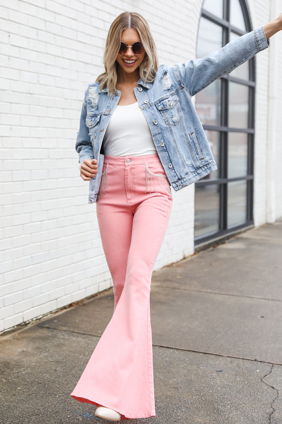 pink Rhinestone Fringe Flare Jeans on dress up model