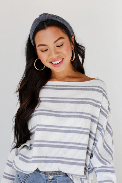Lounge around in the Cabin Cozies Ivory Striped Knit Top and land yourself right at the top of the "best rest" list! This top is designed to provide a perfect balance of simplicity and sophistication. Crafted from a high-quality knit fabric, this top offers a soft and comfortable feel against your skin. The white and grey stripes create a timeless and elegant pattern, adding a touch of visual interest to your ensemble while maintaining a sense of versatility. The classic design features a relaxed fit with a round neckline and long sleeves, offering timeless appeal and endless styling possibilities. Whether you pair it with jeans for a casual weekend look or layer it under a jacket for a more polished outfit, this top effortlessly adapts to your personal style!