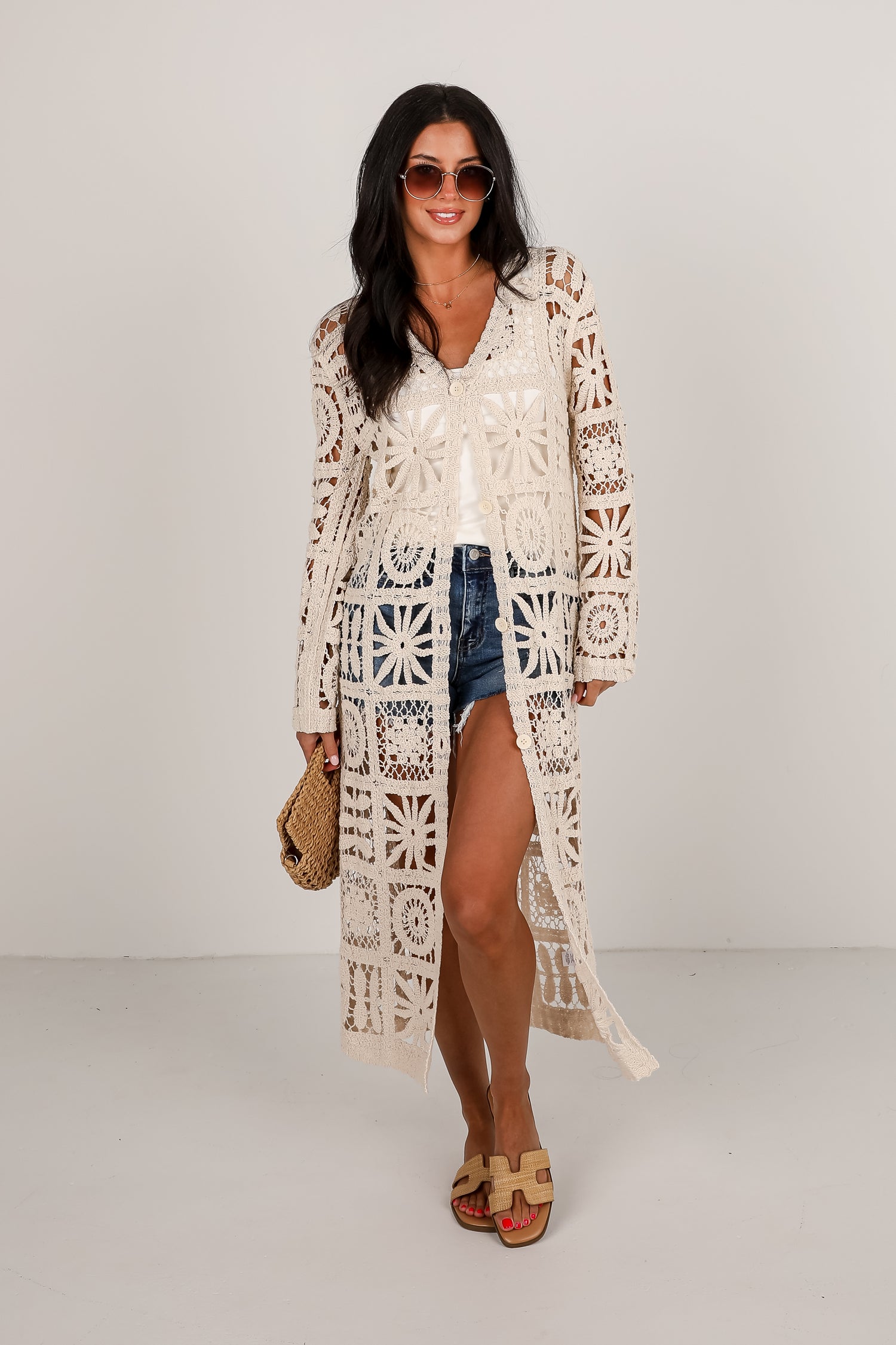 You'll find that it is effortlessly easy to strut your stuff in the California Dreamin' Natural Crochet Longline Kimono! This lightweight layering piece features intricate crochet detailing throughout, long sleeves, and a flowy longline silhouette for an effortlessly chic vibe. Perfect for adding texture to any outfit, it’s ideal over swimsuits, dresses, or a simple tank and jeans combo. The natural hue makes it a versatile staple you'll reach for all season long!