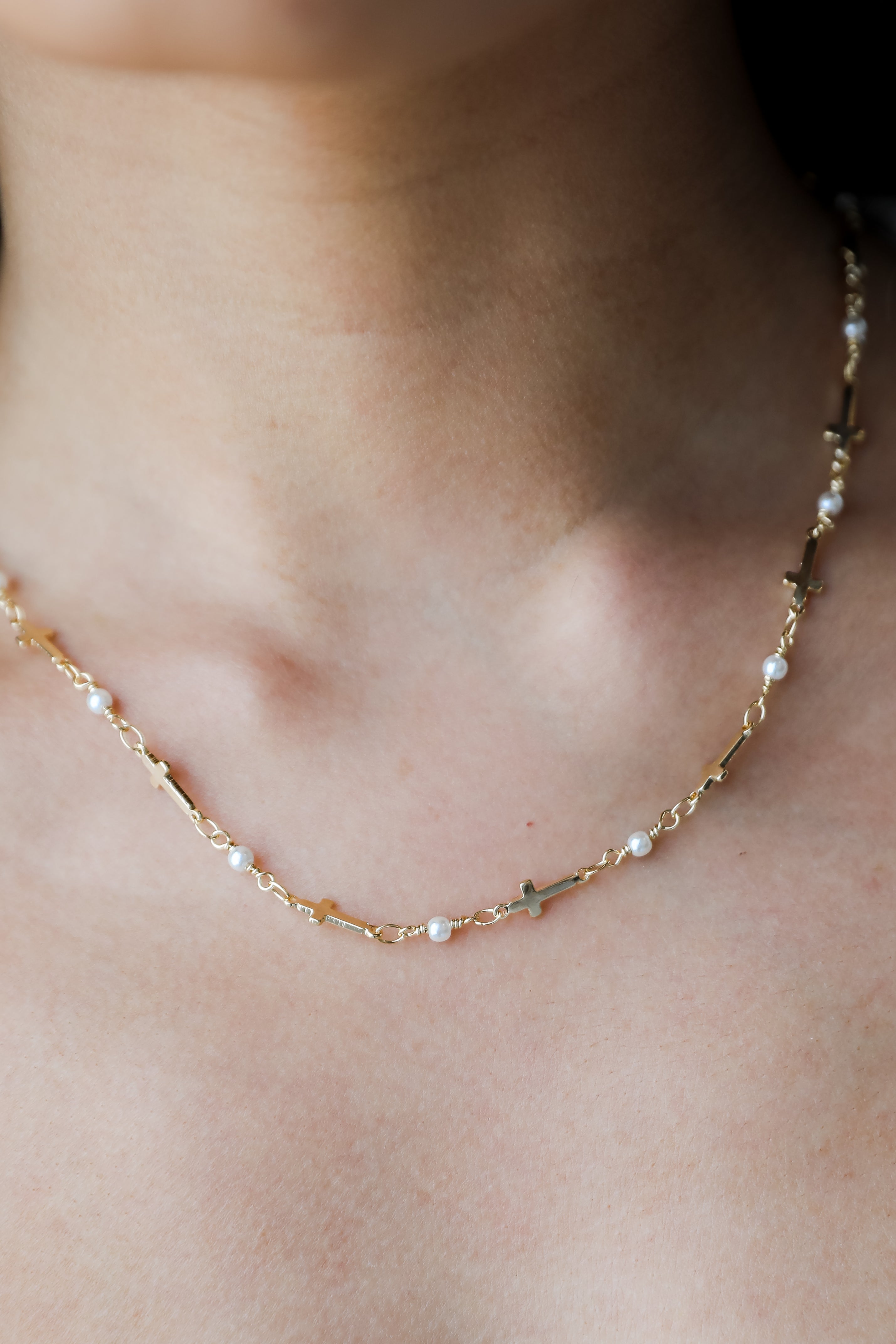 The chic connection between you and the Charlotte Gold Cross + Pearl Chain Necklace will be undeniable! This cute necklace features a simple gold chain with pearls and cross charms. Style the Charlotte Necklace with any outfit to instantly upgrade your look!