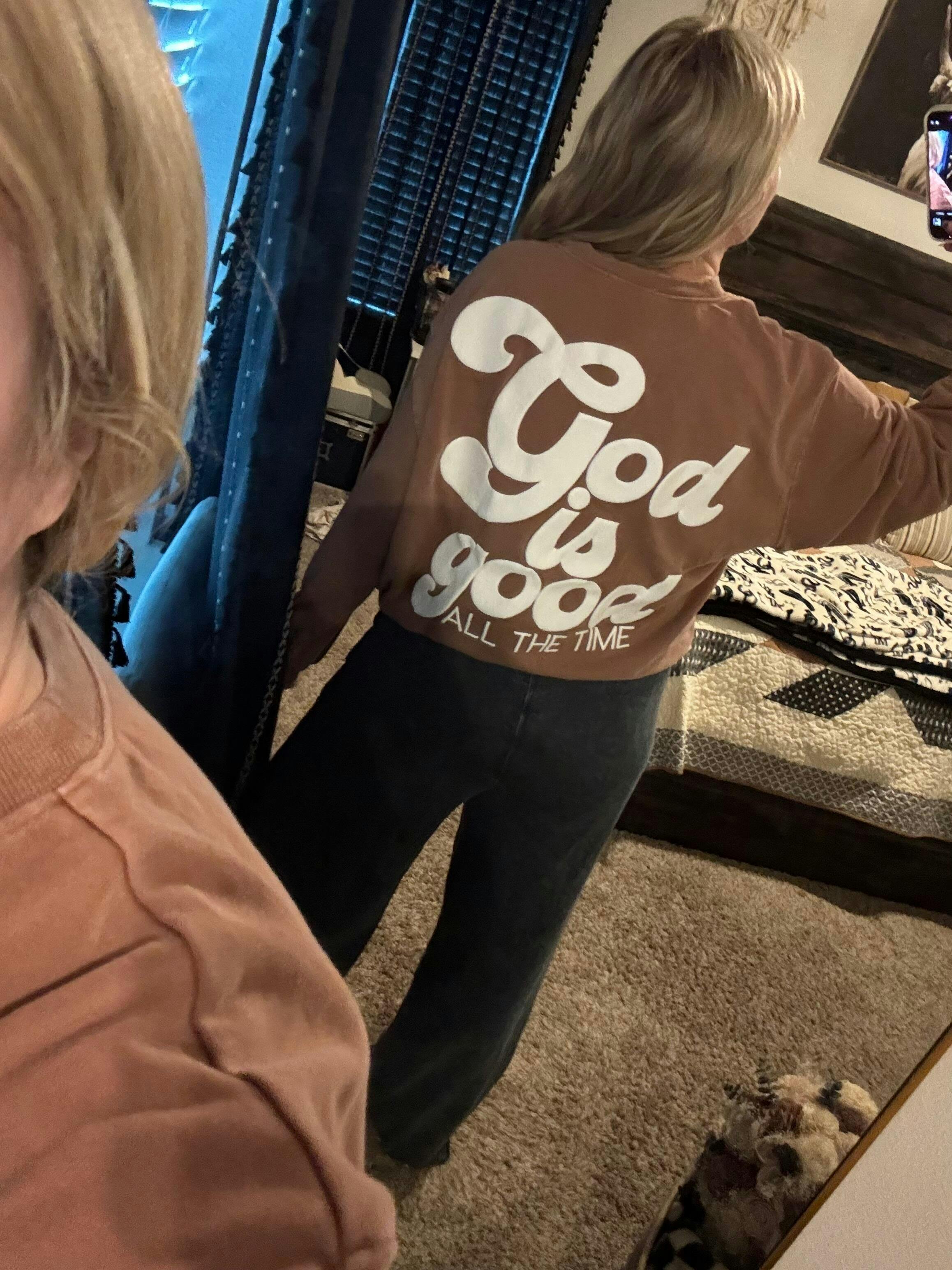 We love the message on the Chestnut God Is Good All The Time Sweatshirt! This comfy sweatshirt is designed with a soft and stretchy knit with a fleece interior. It features a crew neckline, long sleeves, a relaxed fit, a cross on the front, and the words "God Is Good All The Time" on the back. Style the Chestnut God Is Good All The Time Sweatshirt with your favorite denim and sneakers for a casual look!