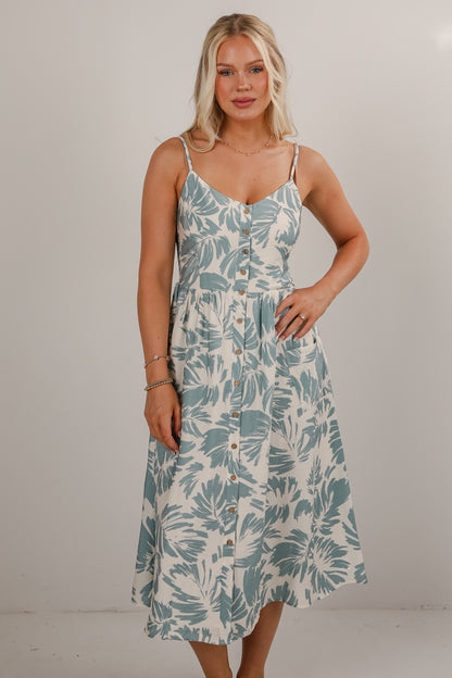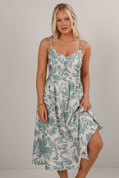 FINAL SALE - Coastal Days Light Blue Leaf Print Midi Dress