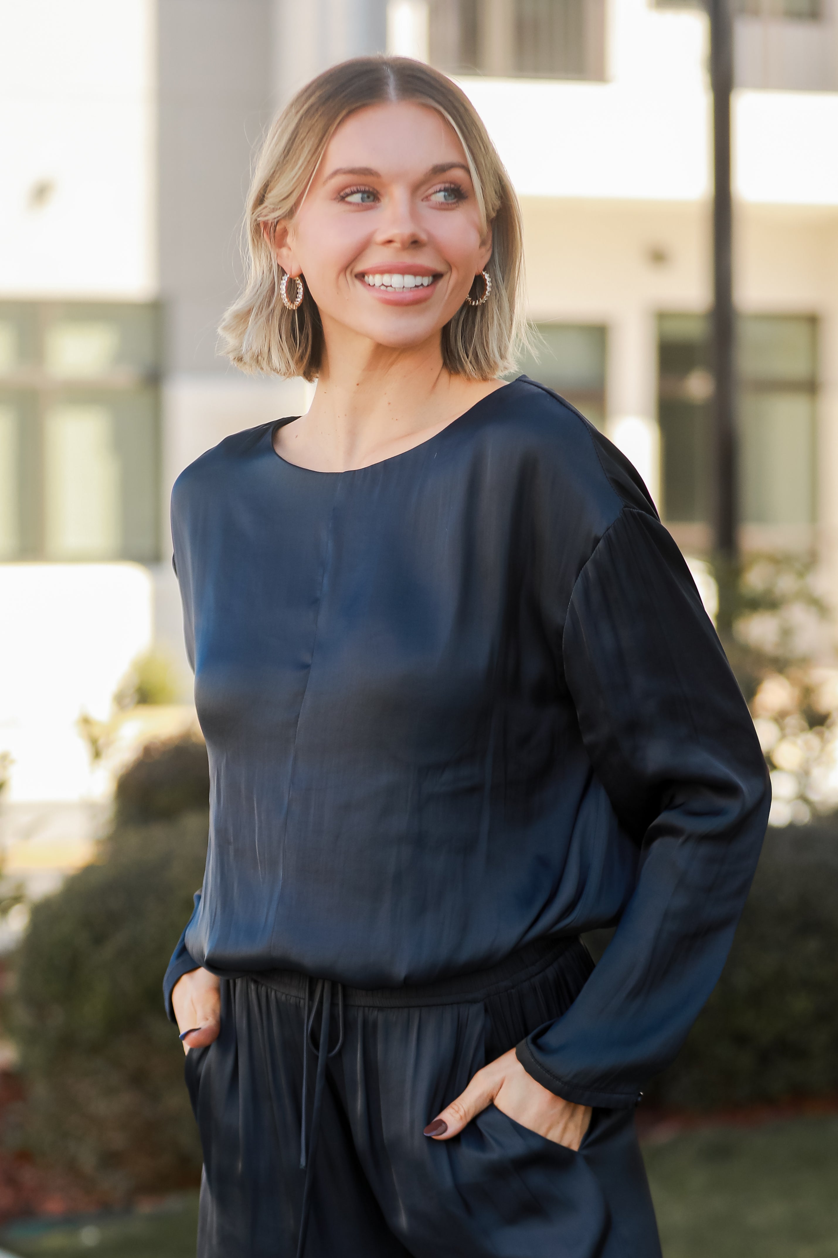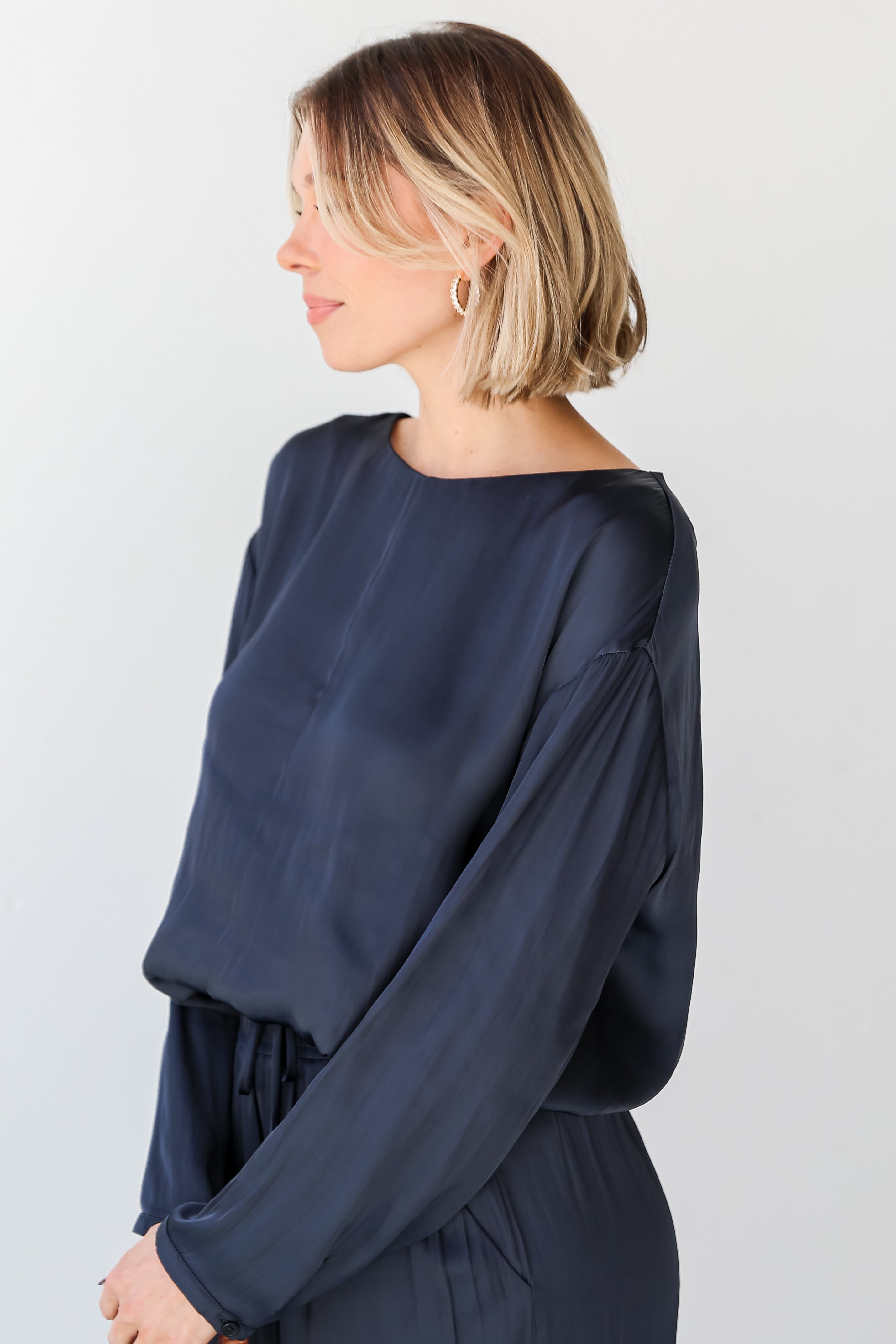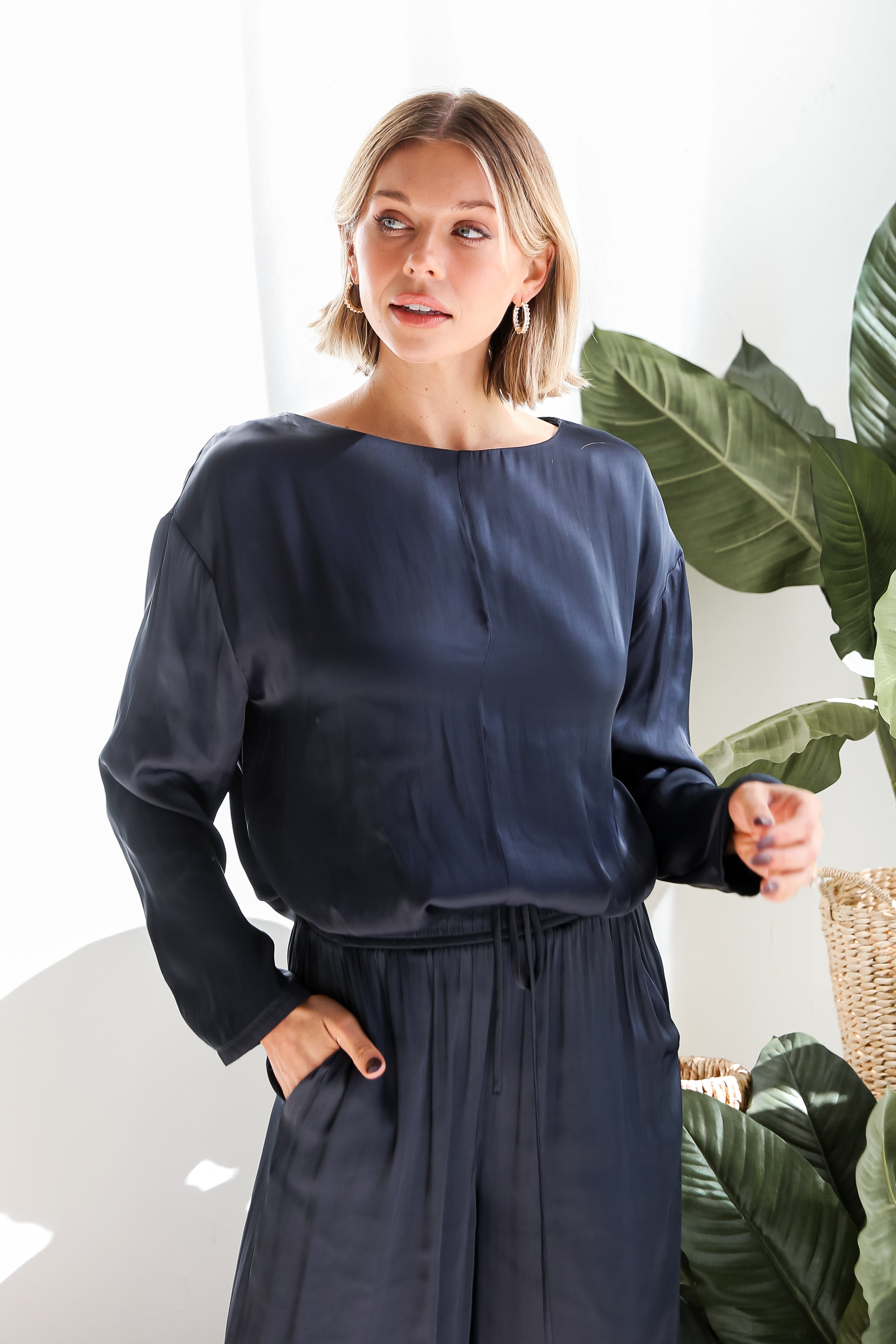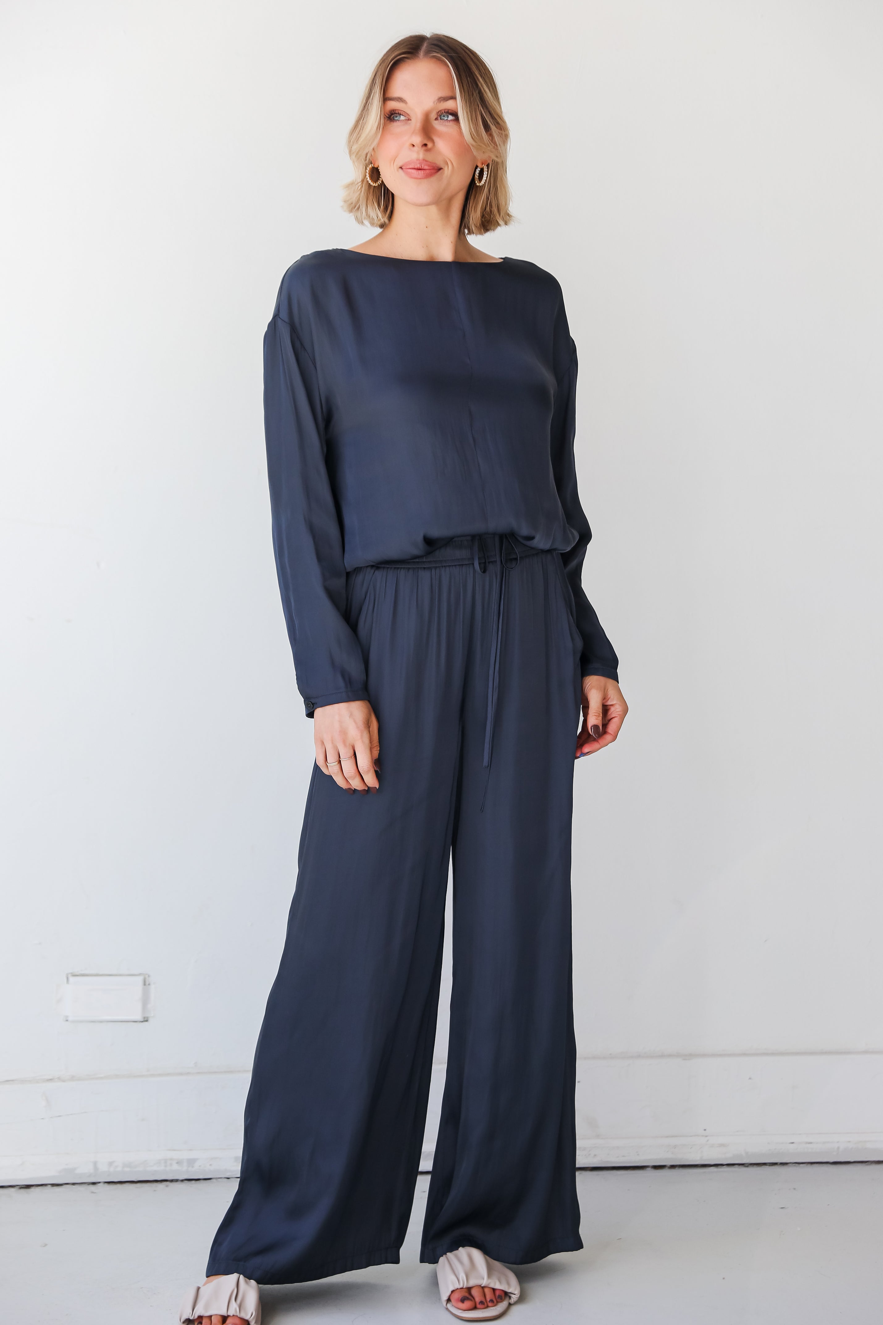 From casual outings to chic occasions, the Covetable Charm Navy Satin Blouse can do it all! Elevate your wardrobe with this coordinated set, where luxurious satin meets timeless design for a look that's both chic and comfortable. The navy satin blouse exudes an opulent sheen, adding a touch of glamour to your ensemble. The matching wide-leg pants mirror the elegance of the blouse, crafted from the same navy satin for a cohesive and refined appearance. Whether worn on its own or paired with the matching pants, this blouse is a versatile piece that effortlessly transitions from day to night!