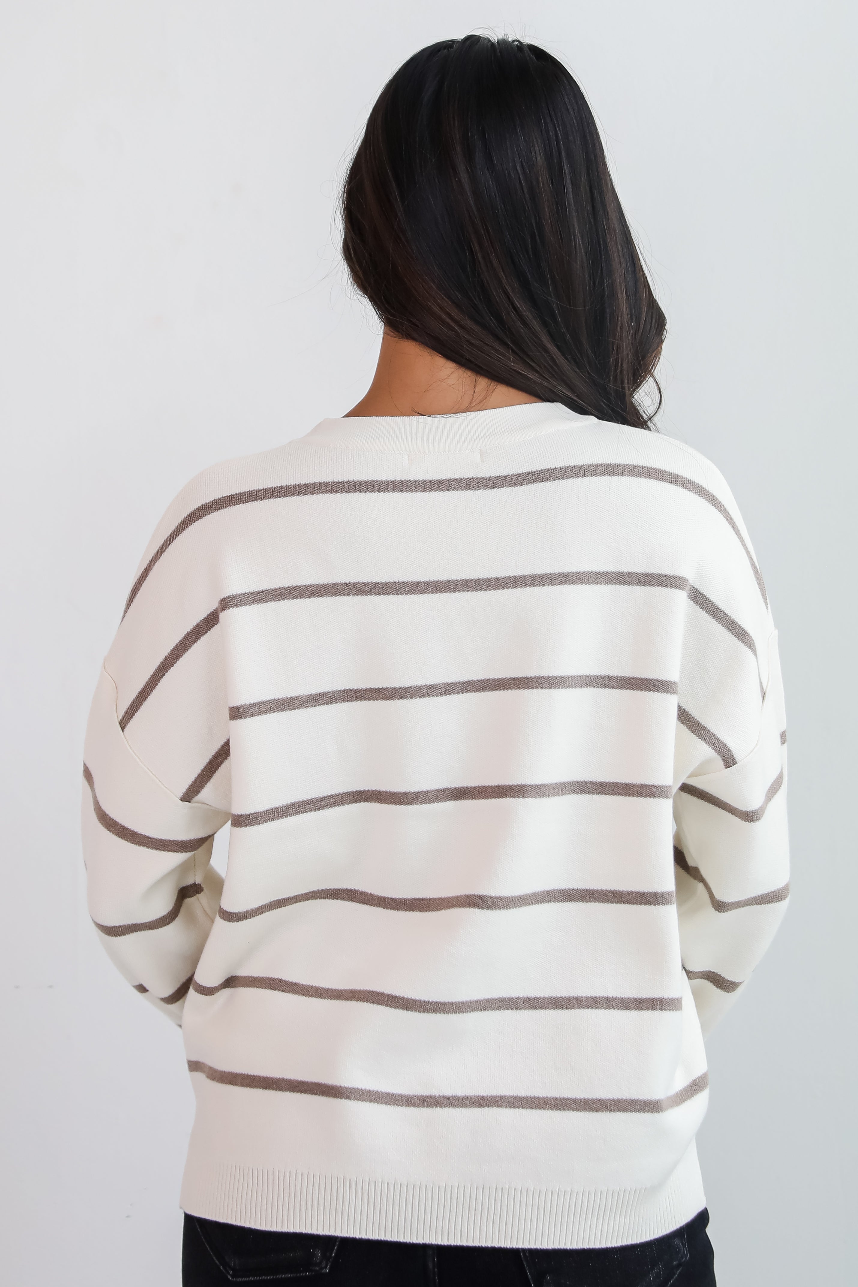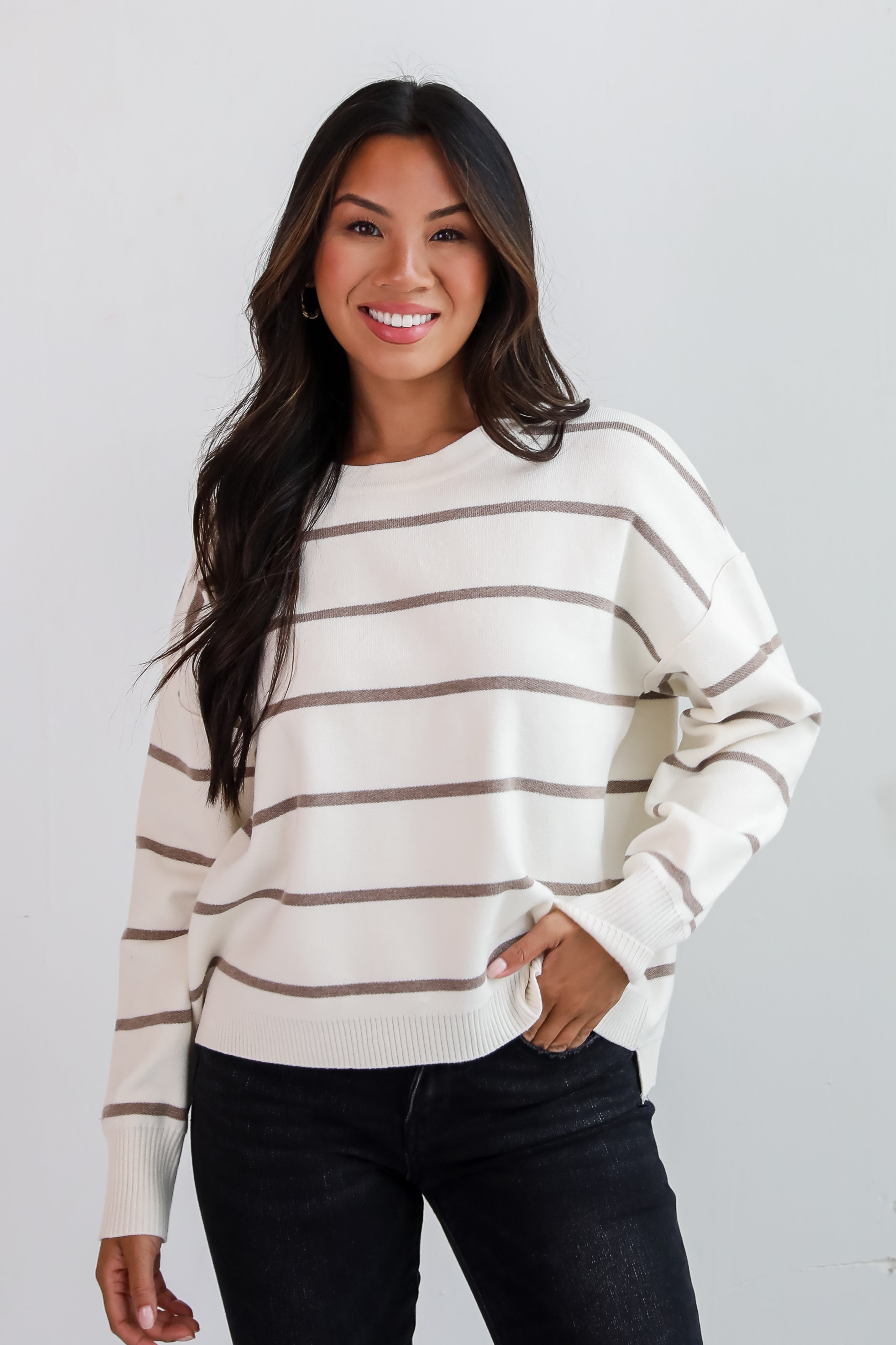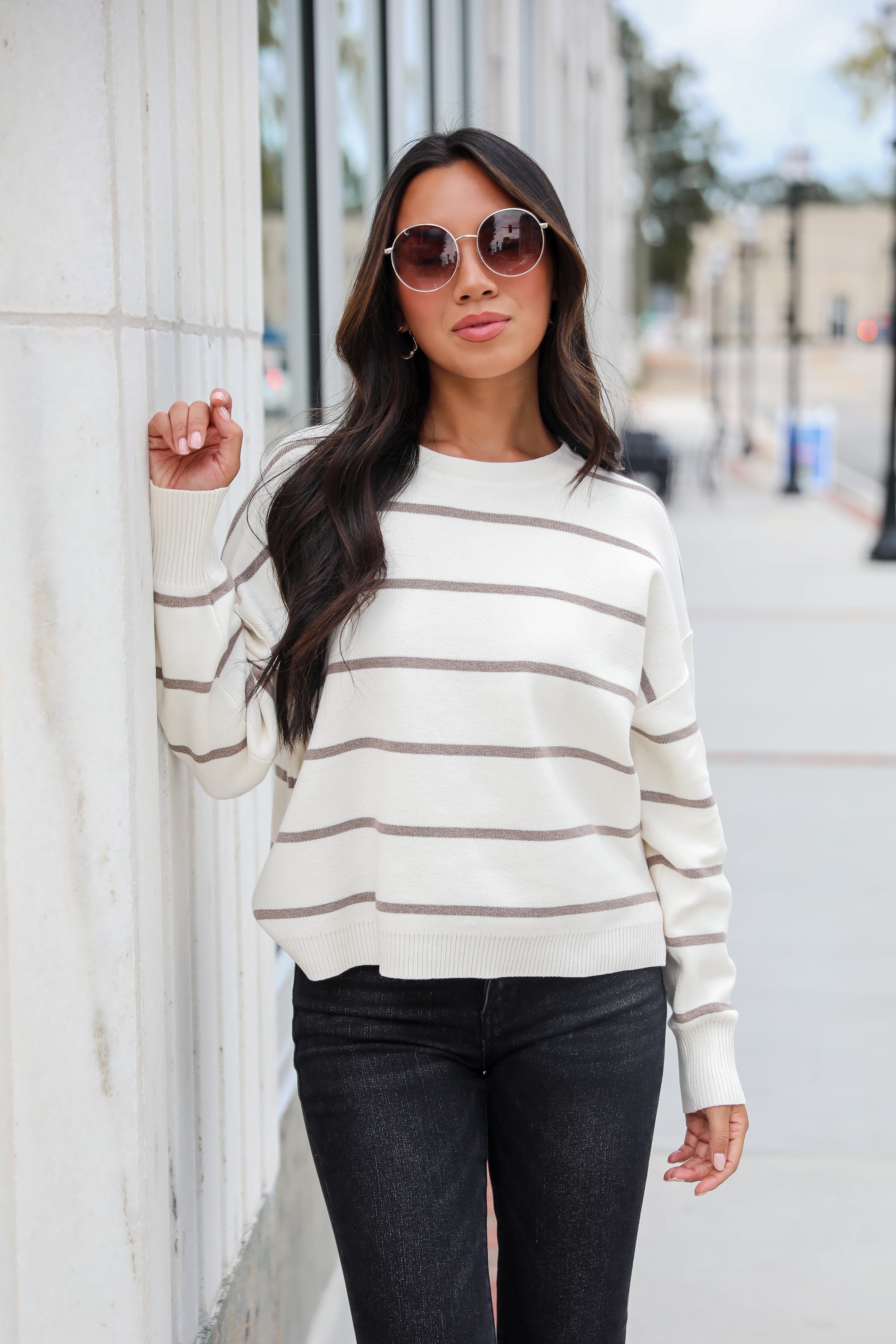 Fall dates are always cuter in the Coziest Poise Ivory Striped Sweater! Crafted from a soft, cozy knit, this sweater features a classic ivory base adorned with elegant taupe stripes for a subtle yet stylish contrast. The relaxed fit offers comfort and ease, making it perfect for layering over jeans, skirts, or leggings. With its timeless design and chic color palette, this sweater is ideal for both casual and dressed-up looks. Elevate your everyday style with this sophisticated, go-to piece that combines comfort with a touch of modern elegance!