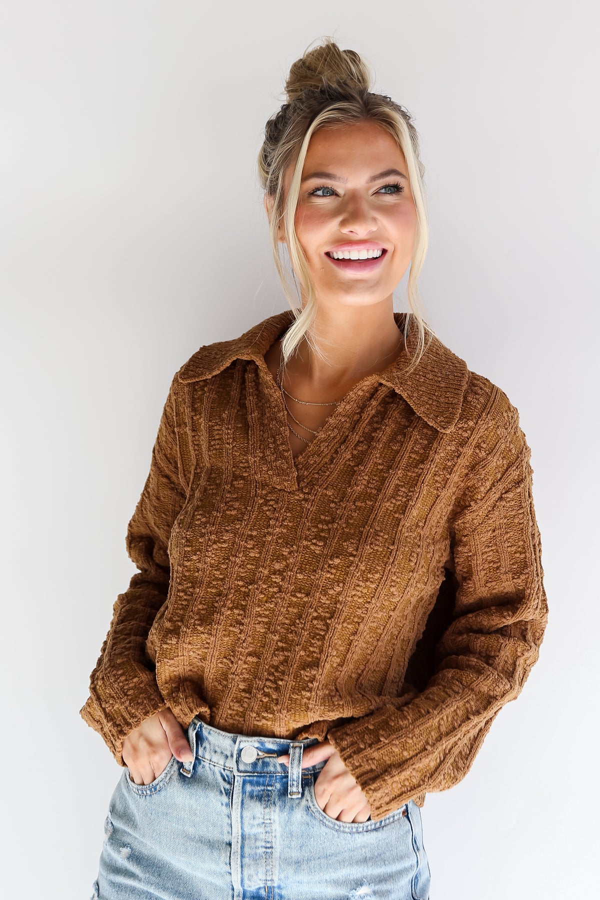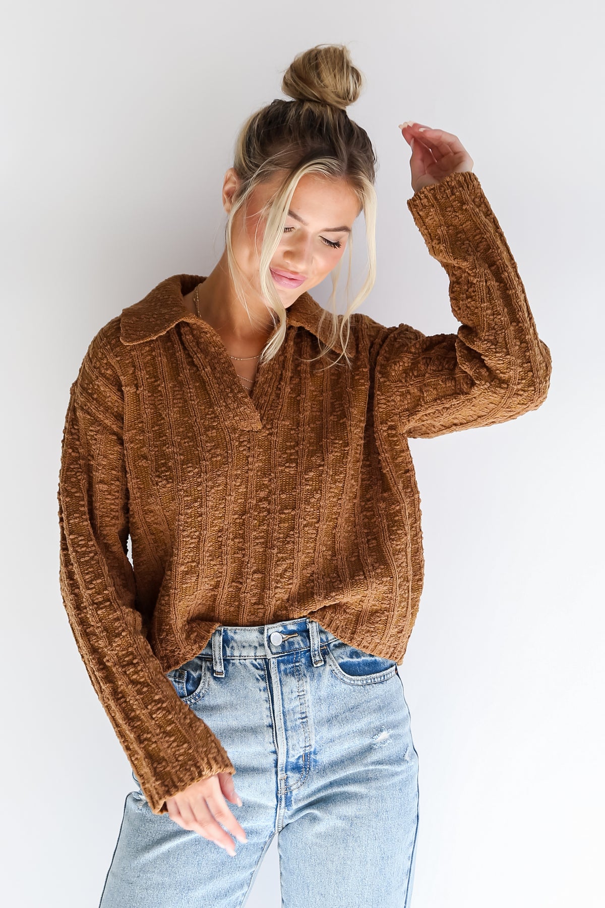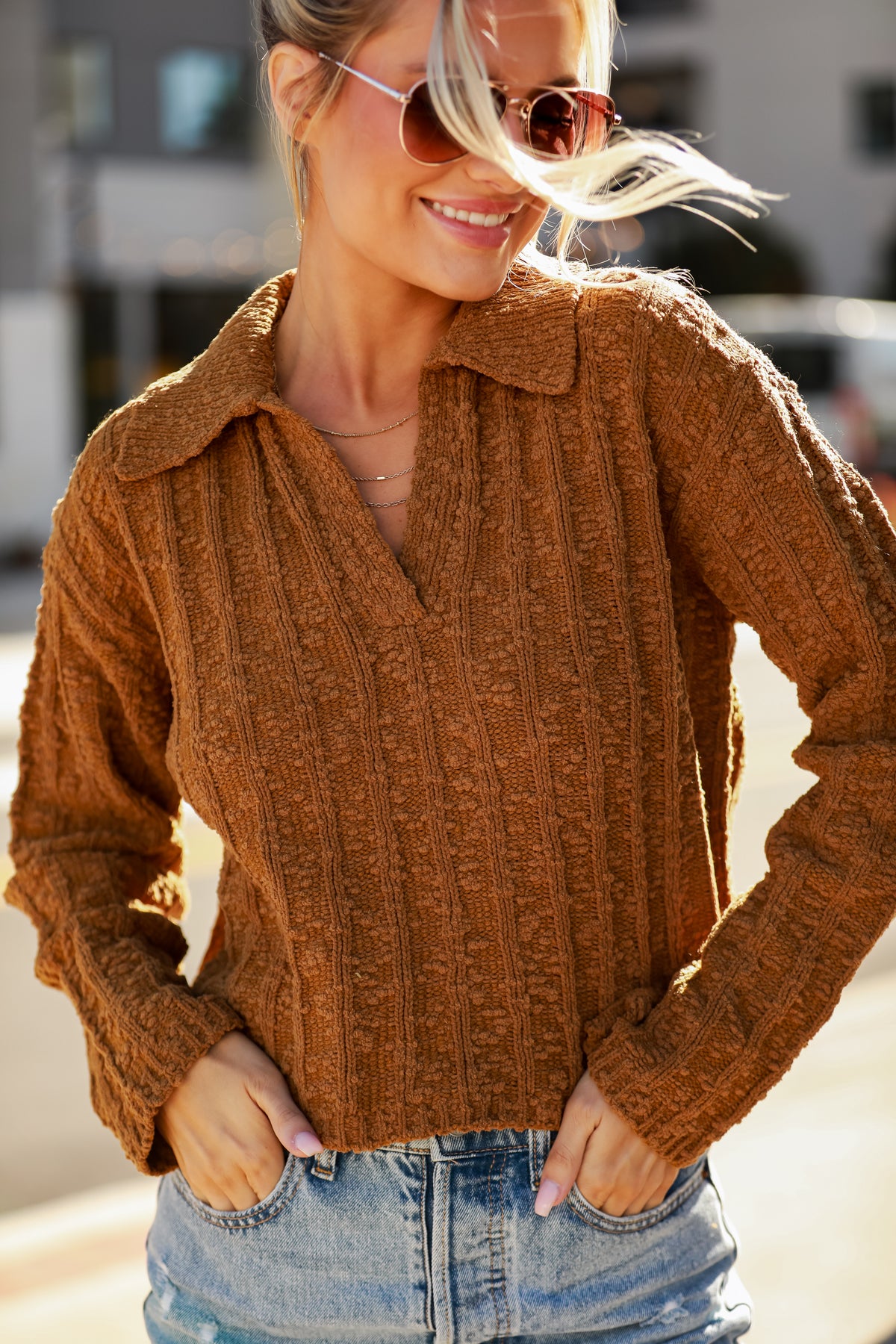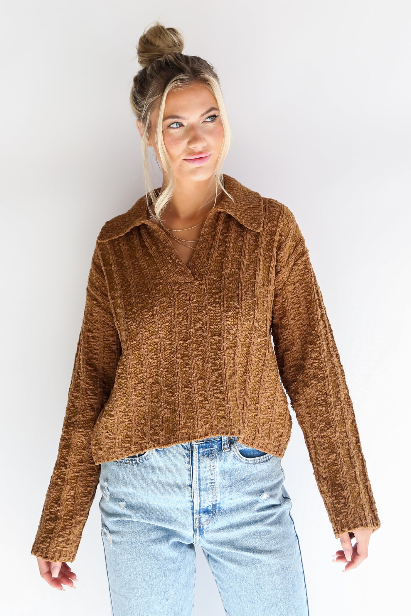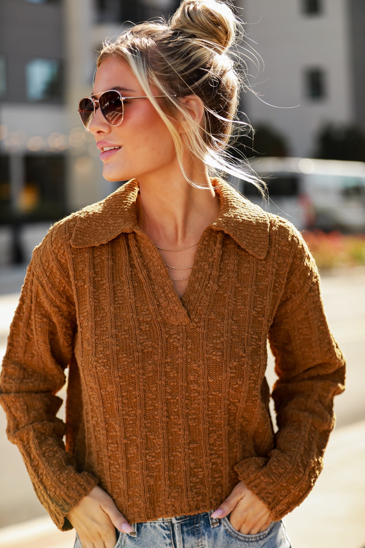The Cozy Addition Camel Collared Sweater is an essential top for staying stylish + warm this season! This sweater effortlessly combines classic design with a touch of modern elegance, making it a versatile and stylish addition to your wardrobe. The rich camel color exudes an air of refinement and a warm, earthy charm. This versatile hue pairs seamlessly with a variety of outfits and accessories, allowing you to create a range of looks, from casual to formal. The classic collar adds an element of polished style, making it suitable for both everyday wear and more dressy occasions. The soft and cozy knit material envelops you in warmth and comfort, ensuring you stay snug and stylish throughout the cooler seasons. This sweater's timeless design allows for versatile layering, making it ideal for pairing with jeans, slacks, or a skirt!