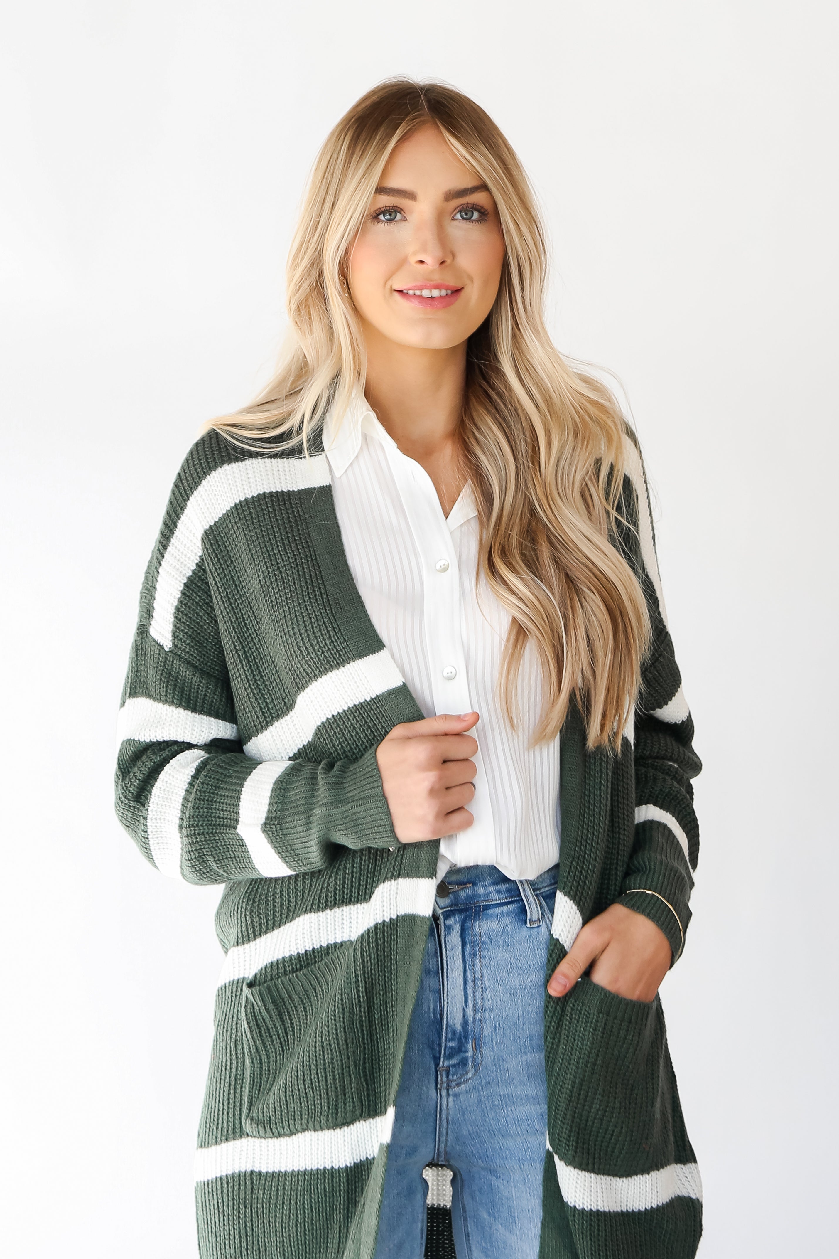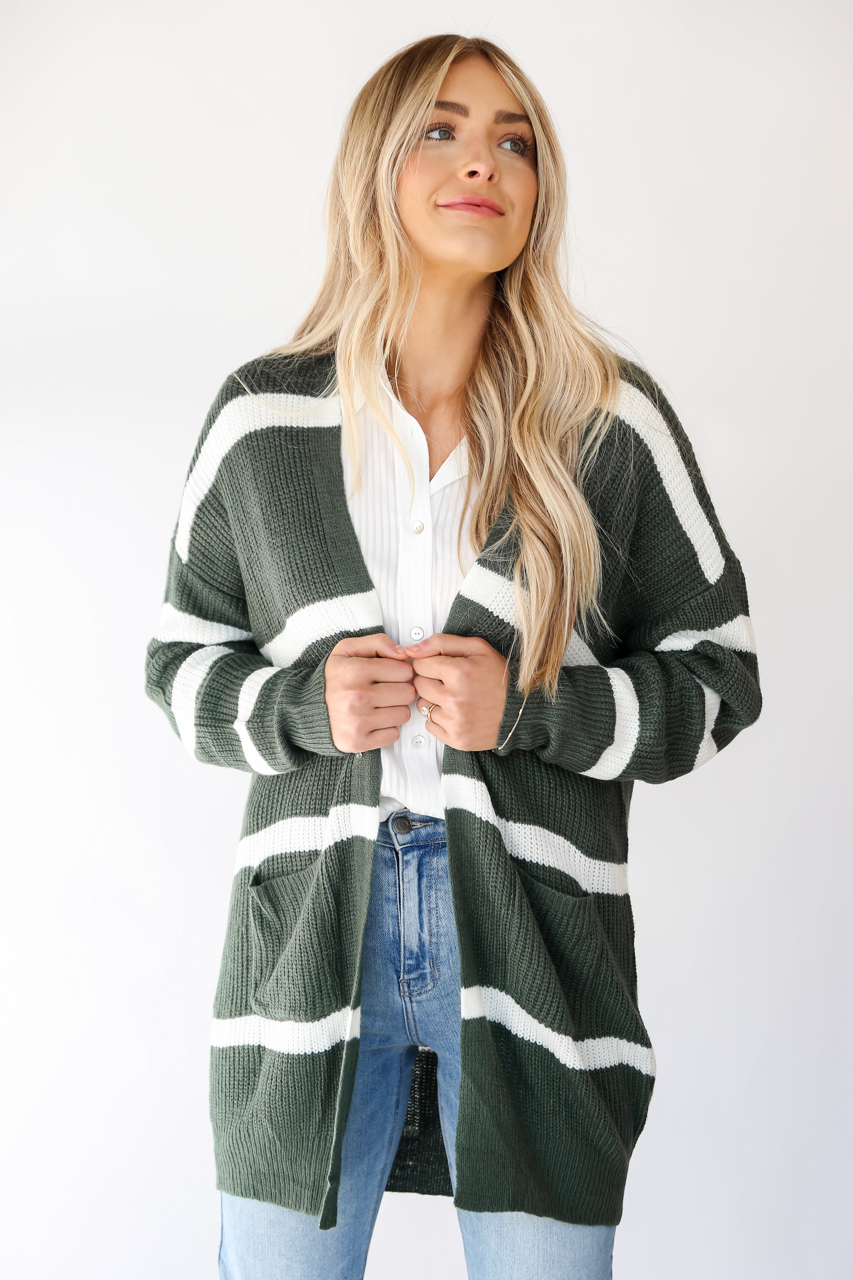 Whether you spend your season in the city or upstate, the Cozy Circumstance Green Striped Longline Cardigan will keep you cute and comfortable all season long! This cardigan is the epitome of contemporary design, designed to make a statement while keeping you warm and chic throughout the seasons. The green and striped pattern of this cardigan offers a refreshing and visually appealing look. The alternating hues create a timeless and sophisticated aesthetic, adding a touch of color and character to your outfit. The knit material is soft and cozy, enveloping you in warmth, making it perfect for layering during cooler seasons. Whether worn over jeans and a tee for a casual day out or draped over a dress for a more polished ensemble, this cardigan adapts effortlessly to your unique style!