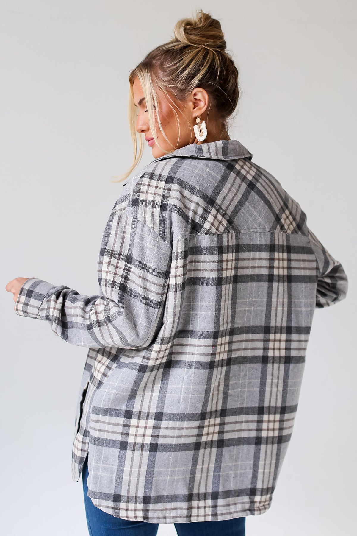 The Cozy Contender Grey Sherpa Shacket was made to keep you looking chic on the chilliest of days! This cozy jacket is made of a soft knit exterior in a plaid print and a sherpa body lining. It features a collared neckline, a functional button front, long sleeves with functional button cuffs, and an oversized fit with a split hem. It also has front + side pockets! Style the Cozy Contender Grey Sherpa Shacket with graphic tees and denim for a trendy look!