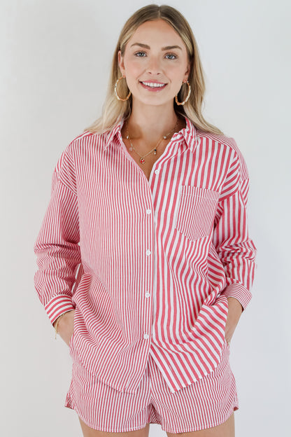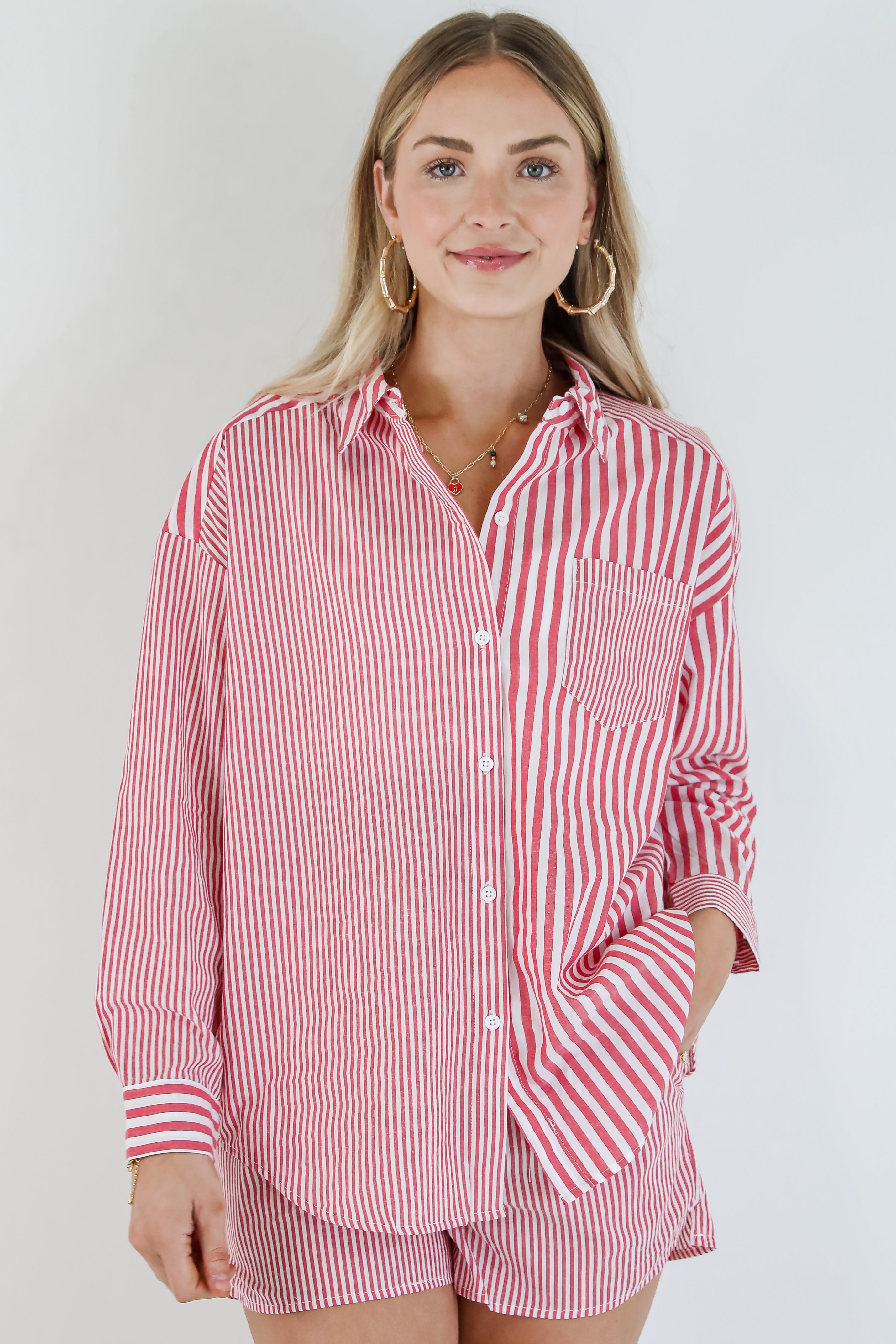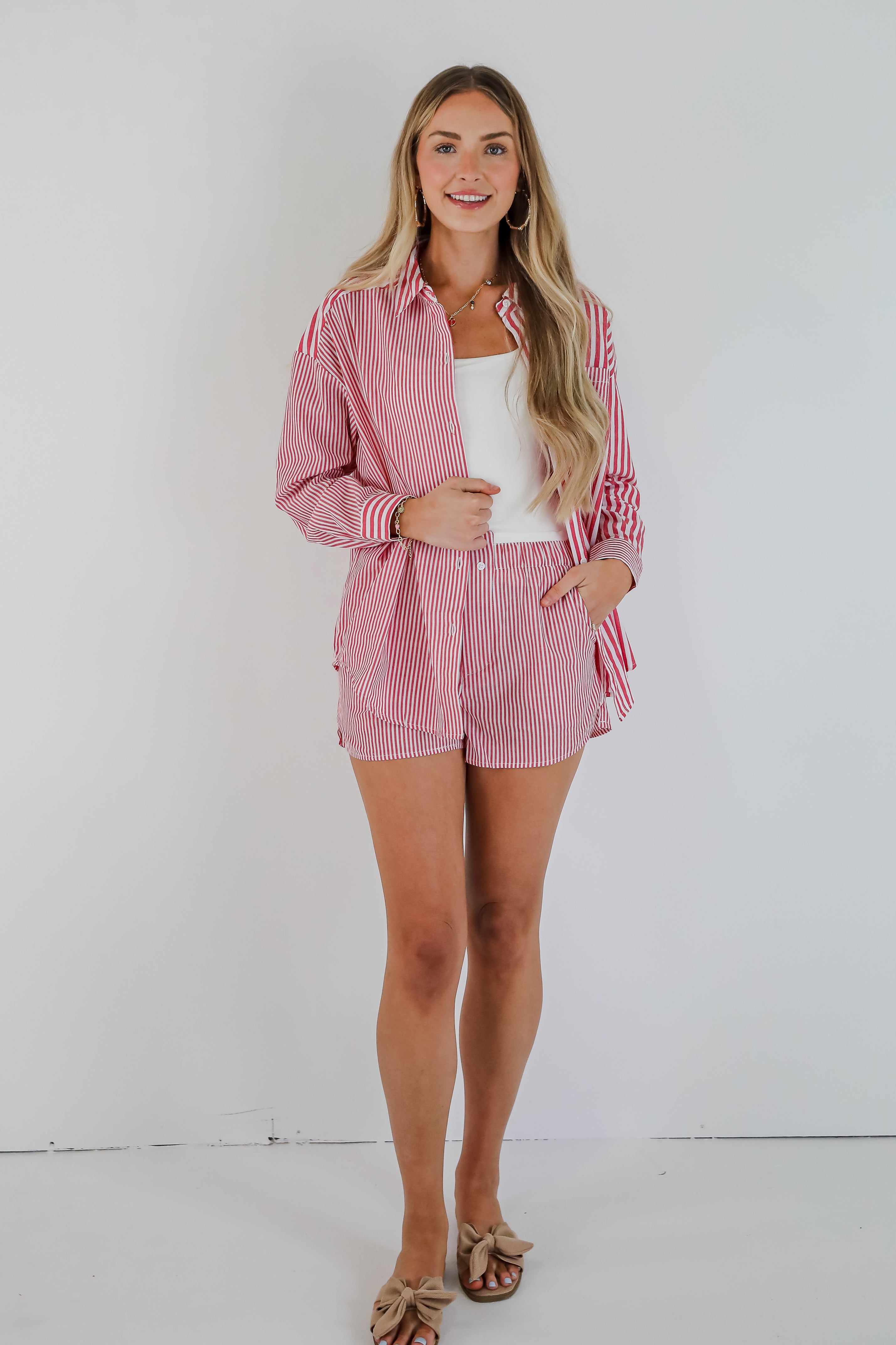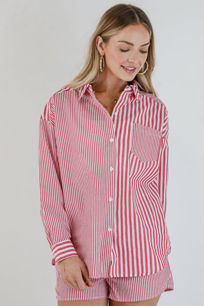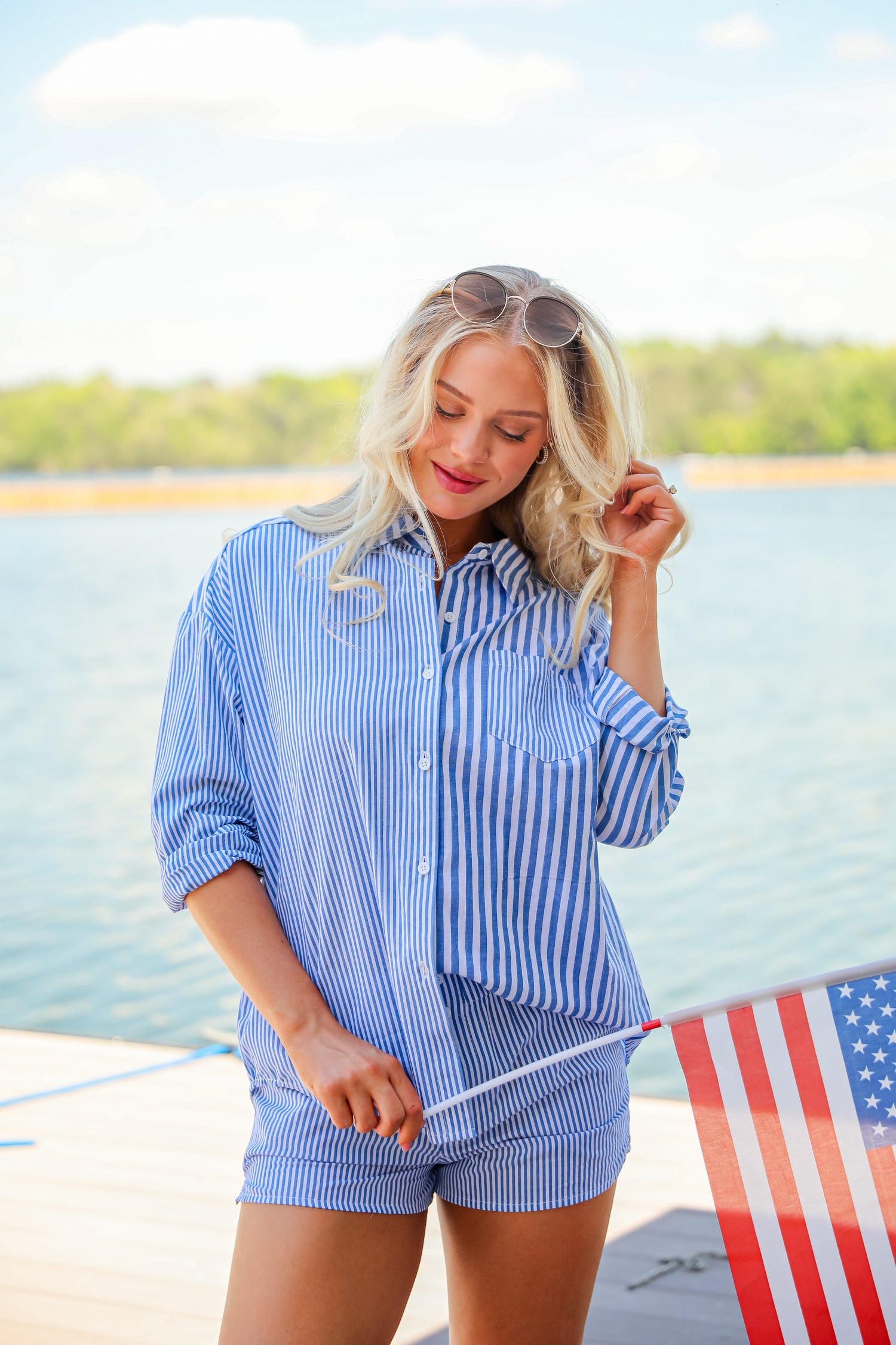 A summer with the Do Not Disturb Striped Button-Up Blouse will be a time full of stylish convenience! Designed with a relaxed, oversized fit and classic vertical stripes, this blouse gives off that perfect blend of polished and laid-back. The lightweight fabric drapes beautifully, while the button-front and collared neckline keep it chic and structured. Style it tucked, tied, or worn open over a tank for that cool, undone vibe! Available in 2 colors.