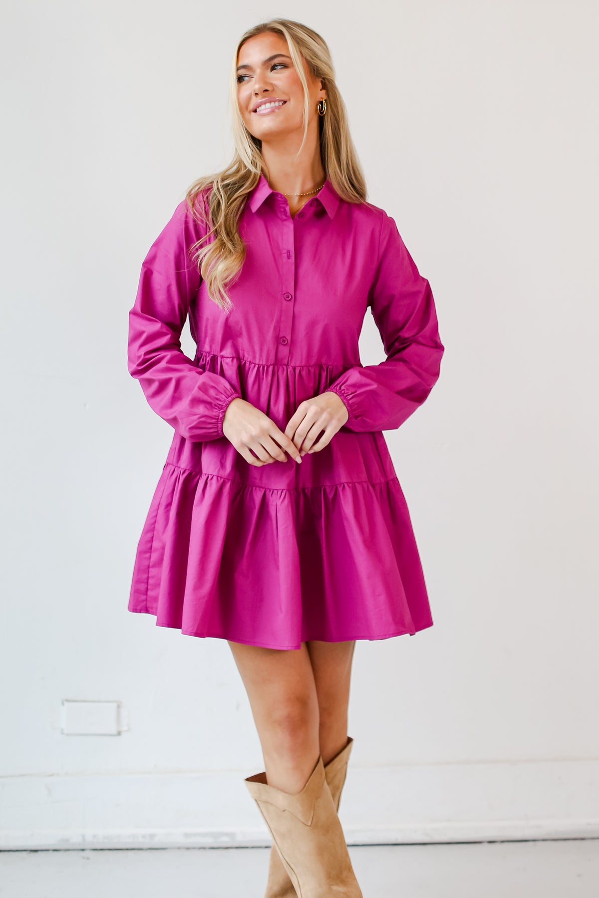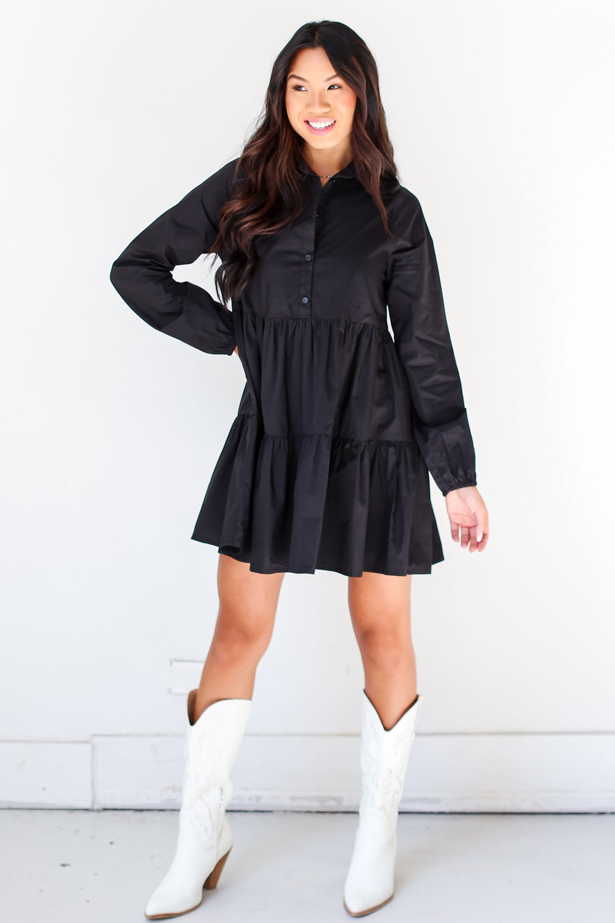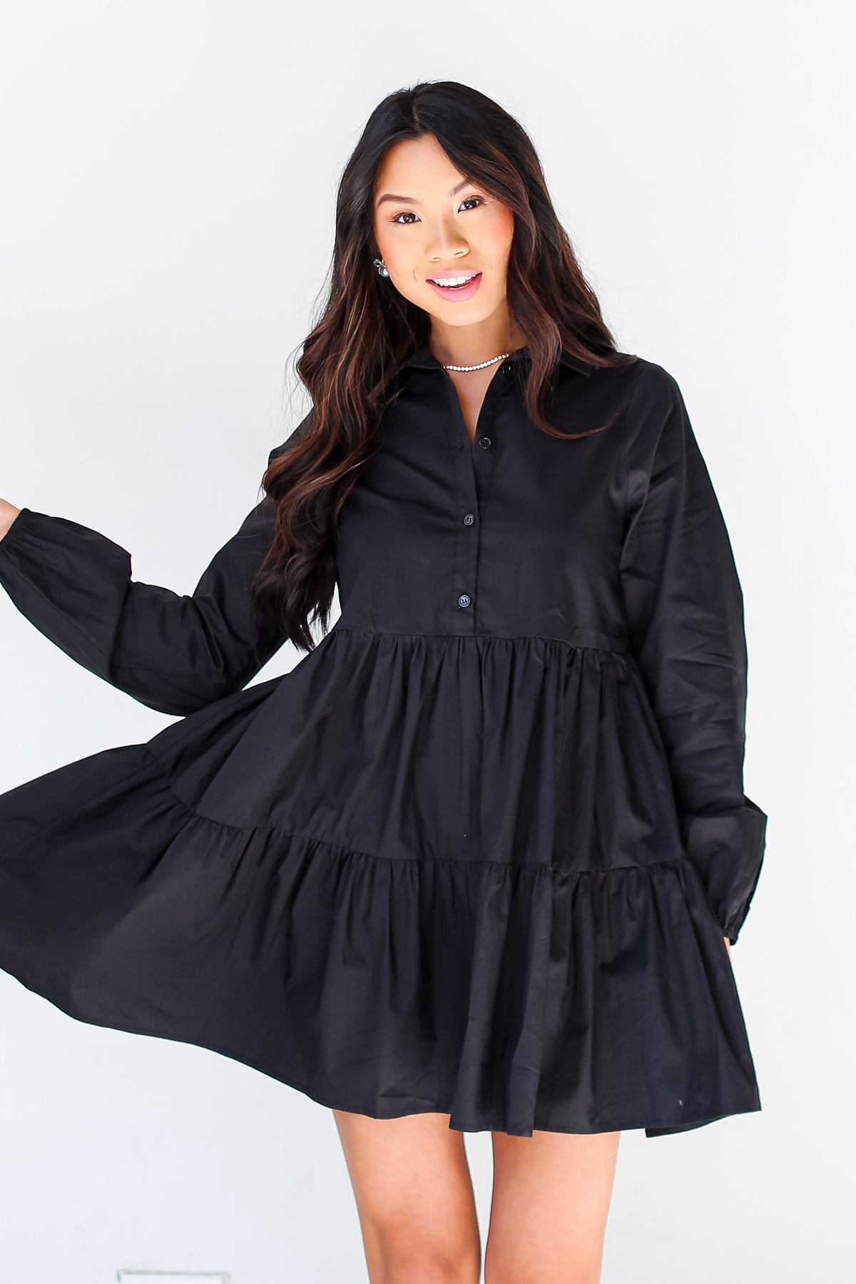 It's all about you when you enter the room in the Effortlessly Intriguing Tiered Mini Dress! This dress combines classic elements with a contemporary twist, creating a look that's both chic and versatile. Its tailored silhouette features a refined collared neckline, adding a touch of understated elegance to the design. The tiered structure of the skirt brings a playful and trendy element to this mini dress, providing movement and flair that sets it apart. The mini length adds a flirty and youthful charm, while the tailored fit highlights your curves, making you feel both confident and fashionable. Pair it with your favorite heels and statement jewelry for a glamorous look or dress it down with stylish sneakers for a more casual yet chic ensemble! Available in 2 colors.