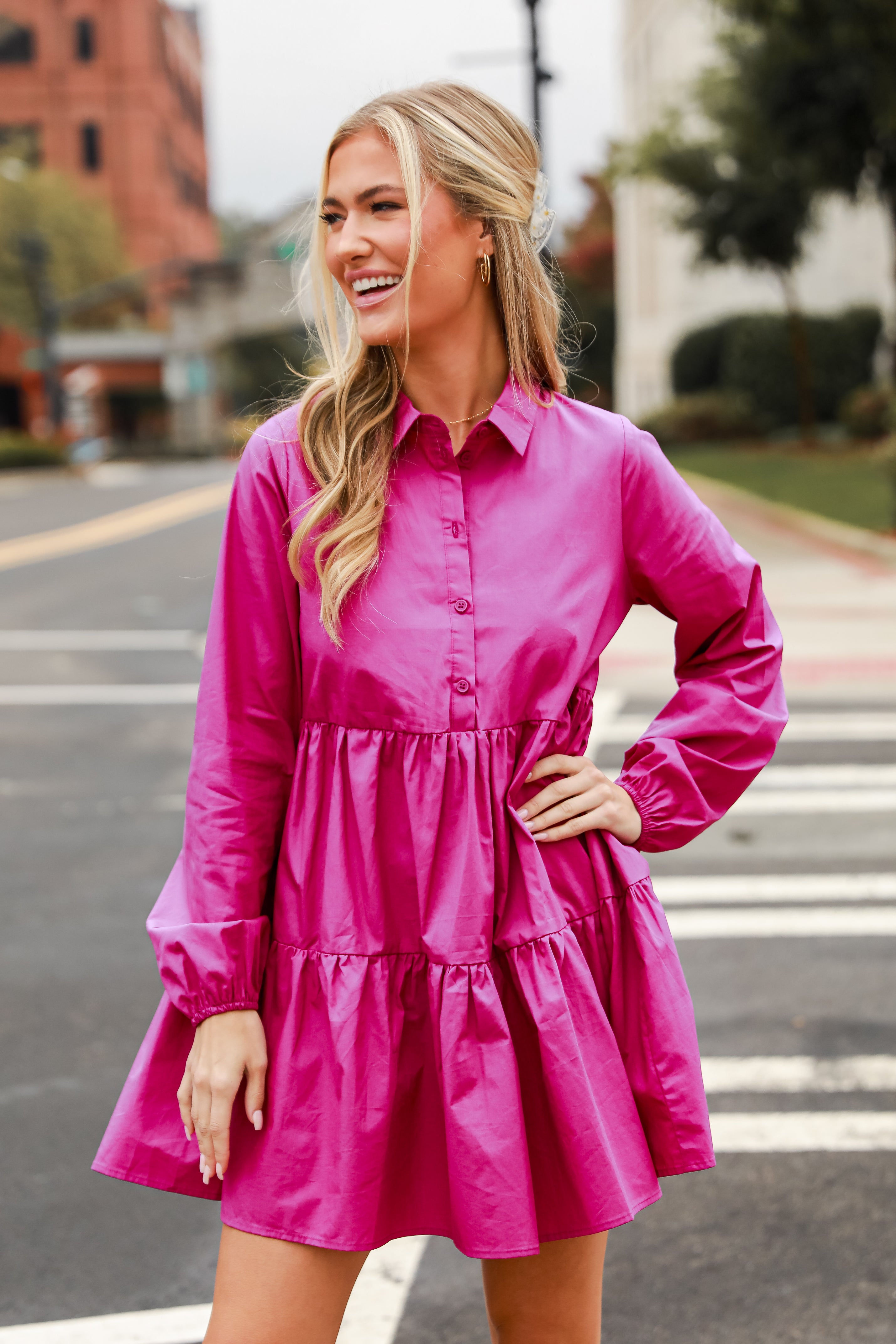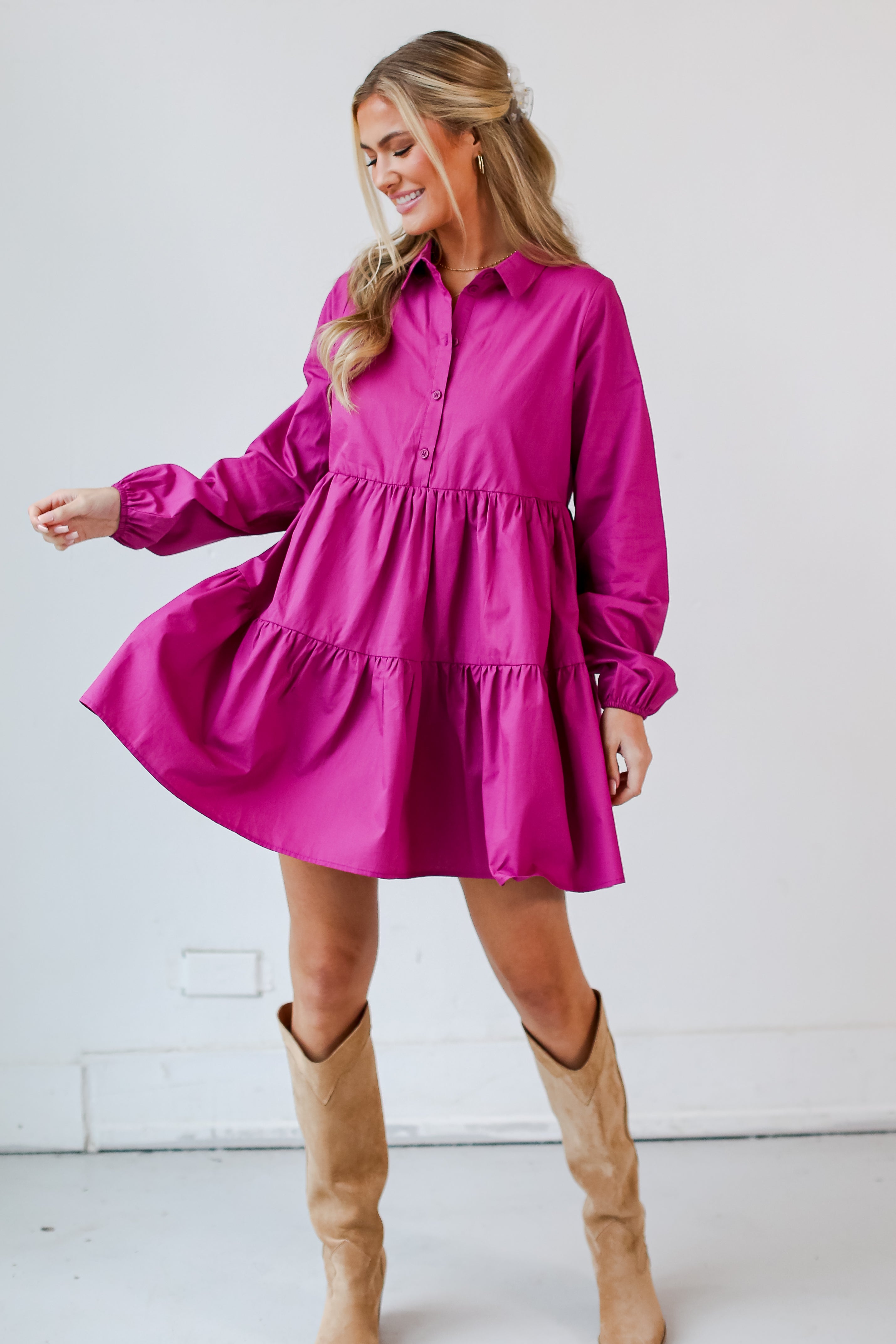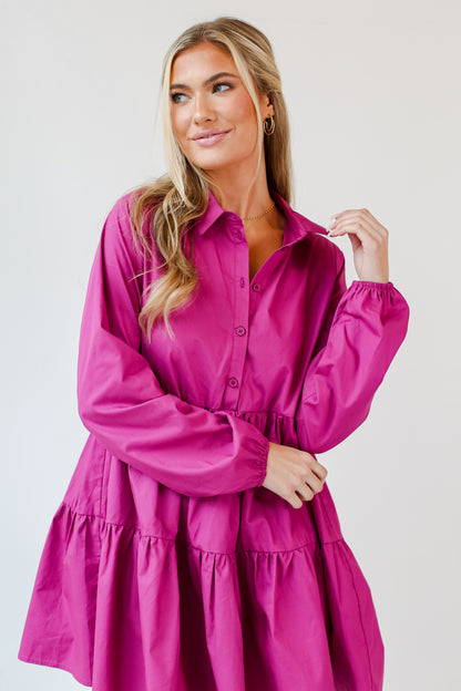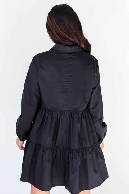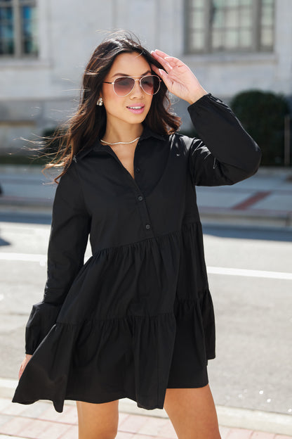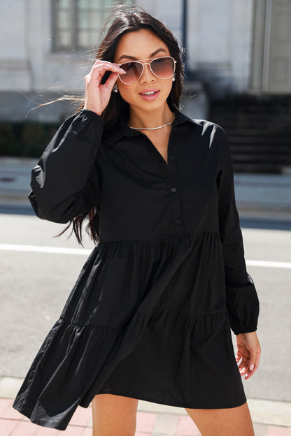 It's all about you when you enter the room in the Effortlessly Intriguing Tiered Mini Dress! This dress combines classic elements with a contemporary twist, creating a look that's both chic and versatile. Its tailored silhouette features a refined collared neckline, adding a touch of understated elegance to the design. The tiered structure of the skirt brings a playful and trendy element to this mini dress, providing movement and flair that sets it apart. The mini length adds a flirty and youthful charm, while the tailored fit highlights your curves, making you feel both confident and fashionable. Pair it with your favorite heels and statement jewelry for a glamorous look or dress it down with stylish sneakers for a more casual yet chic ensemble! Available in 2 colors.