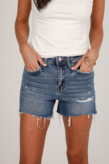 Keep it cool and classic in the Elena Medium Wash High-Rise Distressed Denim Shorts! Designed in a versatile medium wash, these shorts feature a flattering high-rise fit that hugs your waist while offering a relaxed silhouette through the leg. The distressed details and raw frayed hem give them a lived-in, edgy look—perfect for laid-back days, music festivals, or sunny weekend getaways. Pair them with your favorite crop top or oversized tee for an effortlessly cool vibe!