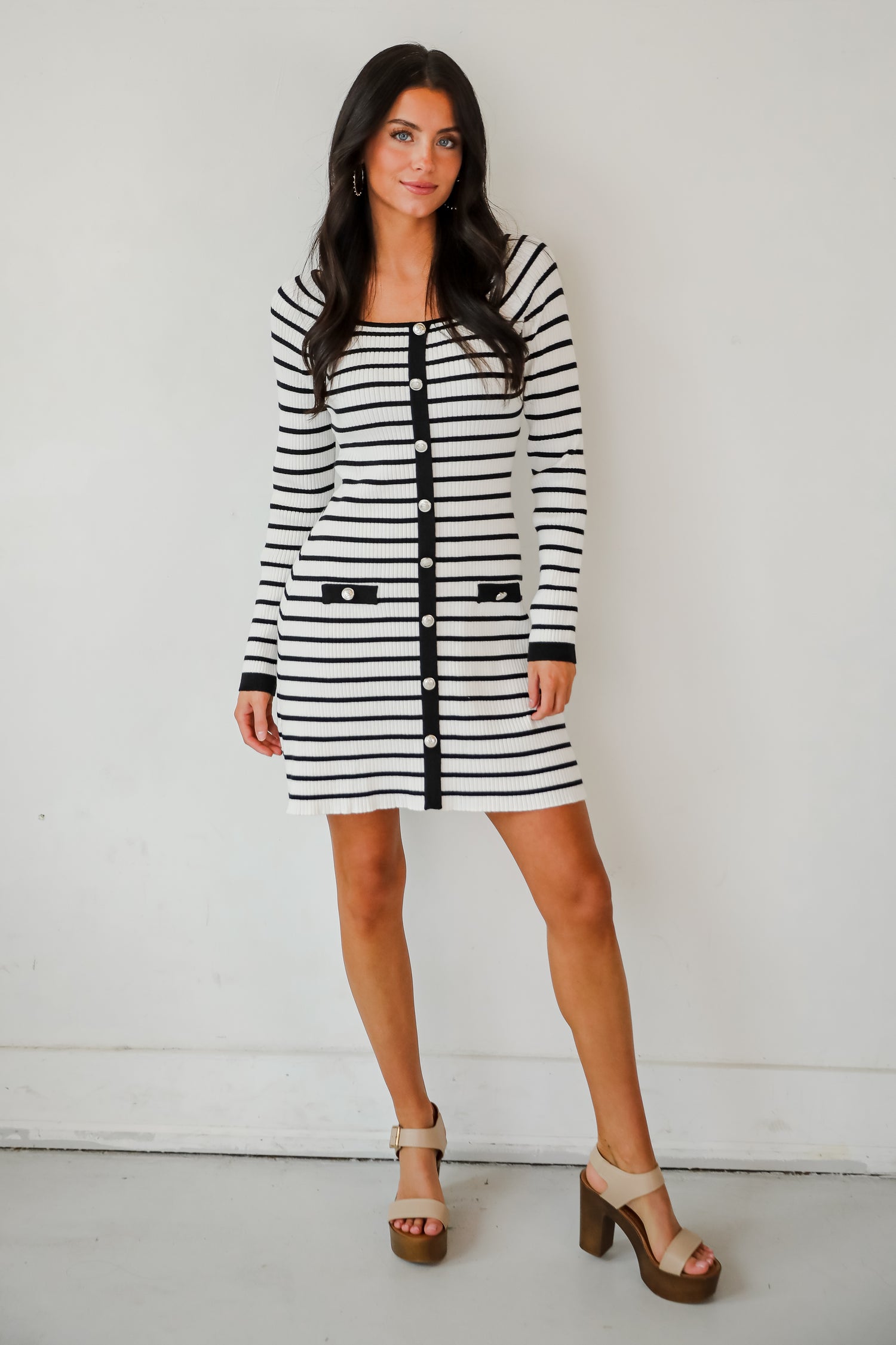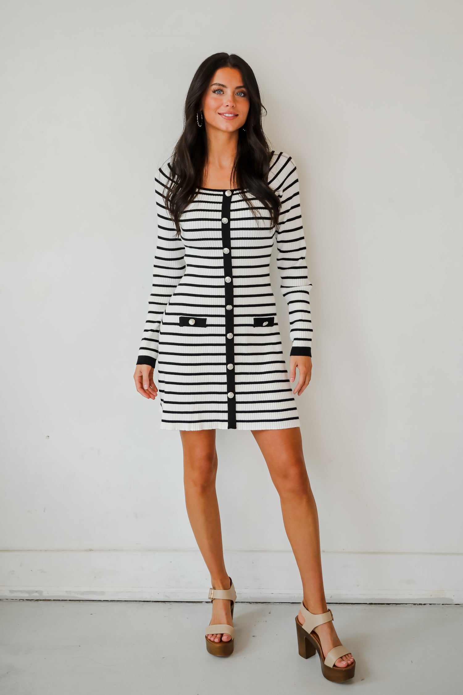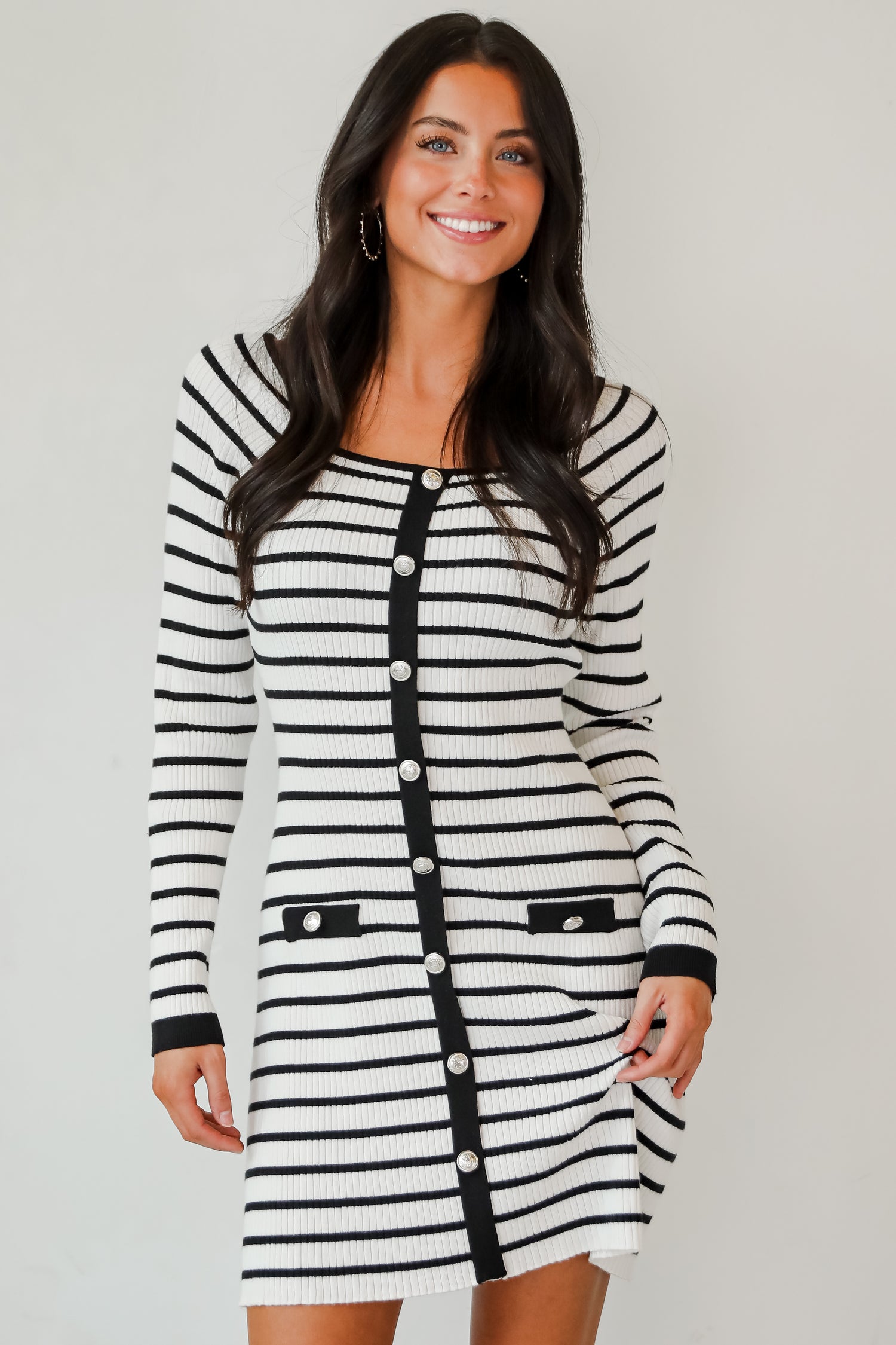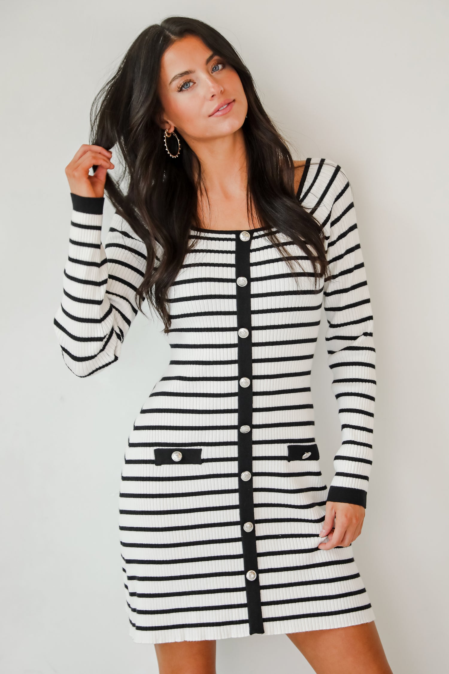 The way you look in the Enchanting Edge Ivory Striped Ribbed Knit Mini Dress will be on everyone's minds! Designed with a figure-flattering ribbed knit fabric, this dress hugs in all the right places while offering a comfortable stretch. The timeless white and black striped pattern adds a chic, versatile touch, while the faux statement buttons on the front bring a stylish, polished detail. The long sleeves make it perfect for transitional seasons, and the mini length adds a flirty finish. Pair it with ankle boots for an effortlessly cool vibe or dress it up with heels for a sophisticated look!