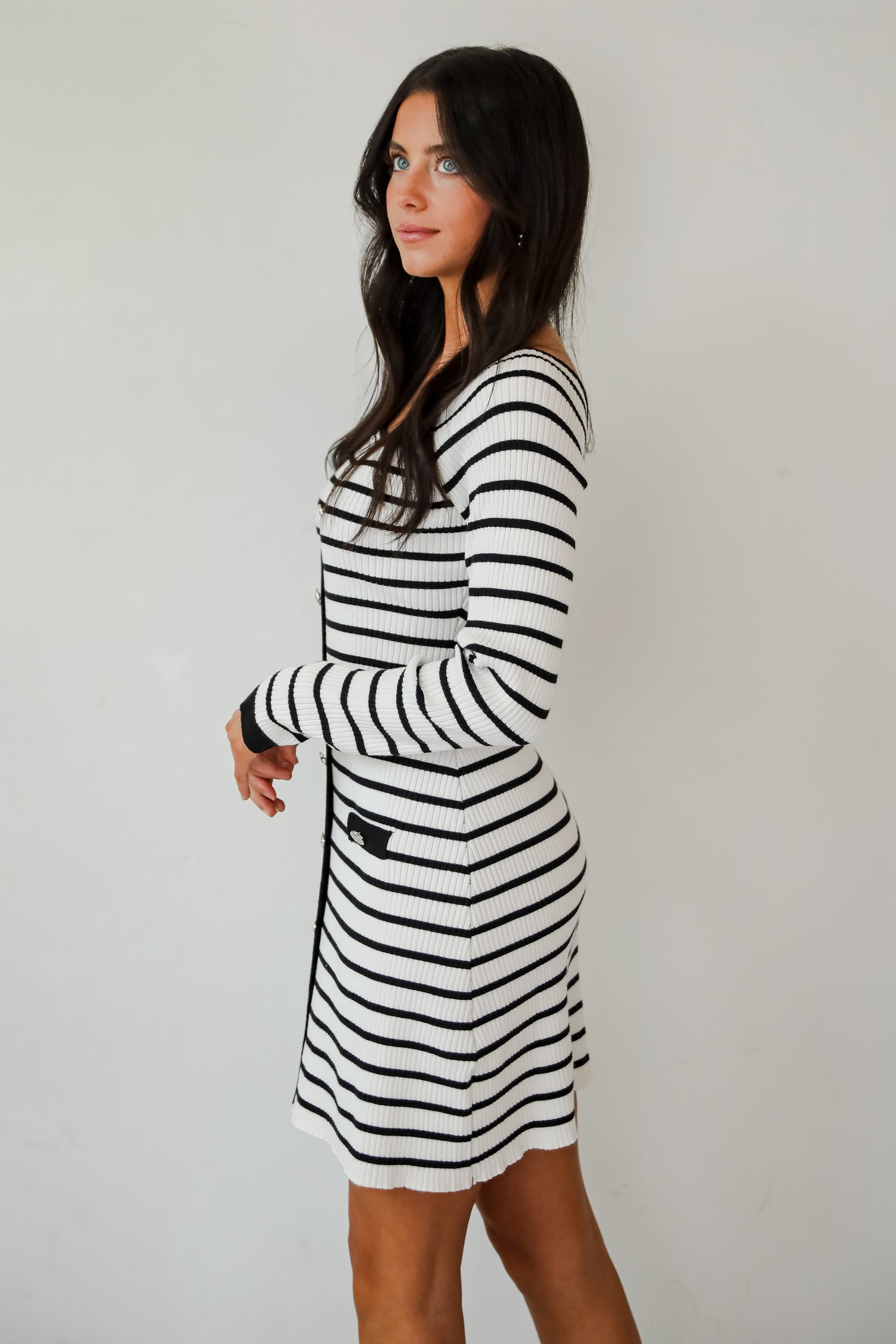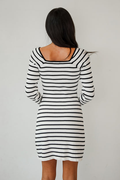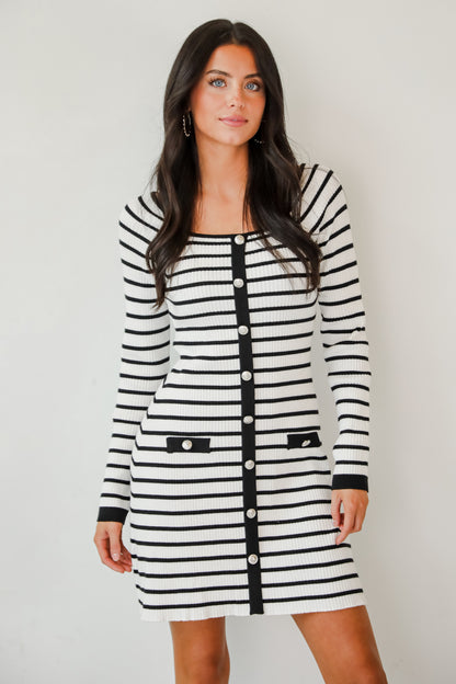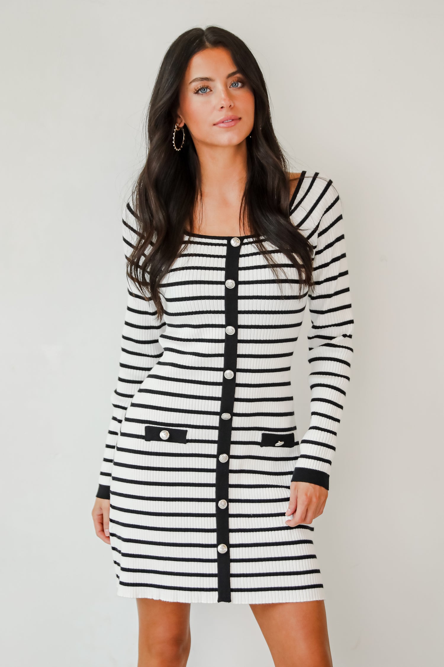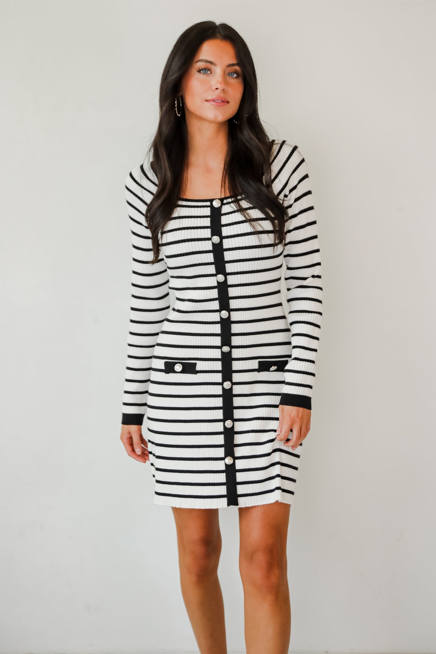 The way you look in the Enchanting Edge Ivory Striped Ribbed Knit Mini Dress will be on everyone's minds! Designed with a figure-flattering ribbed knit fabric, this dress hugs in all the right places while offering a comfortable stretch. The timeless white and black striped pattern adds a chic, versatile touch, while the faux statement buttons on the front bring a stylish, polished detail. The long sleeves make it perfect for transitional seasons, and the mini length adds a flirty finish. Pair it with ankle boots for an effortlessly cool vibe or dress it up with heels for a sophisticated look!