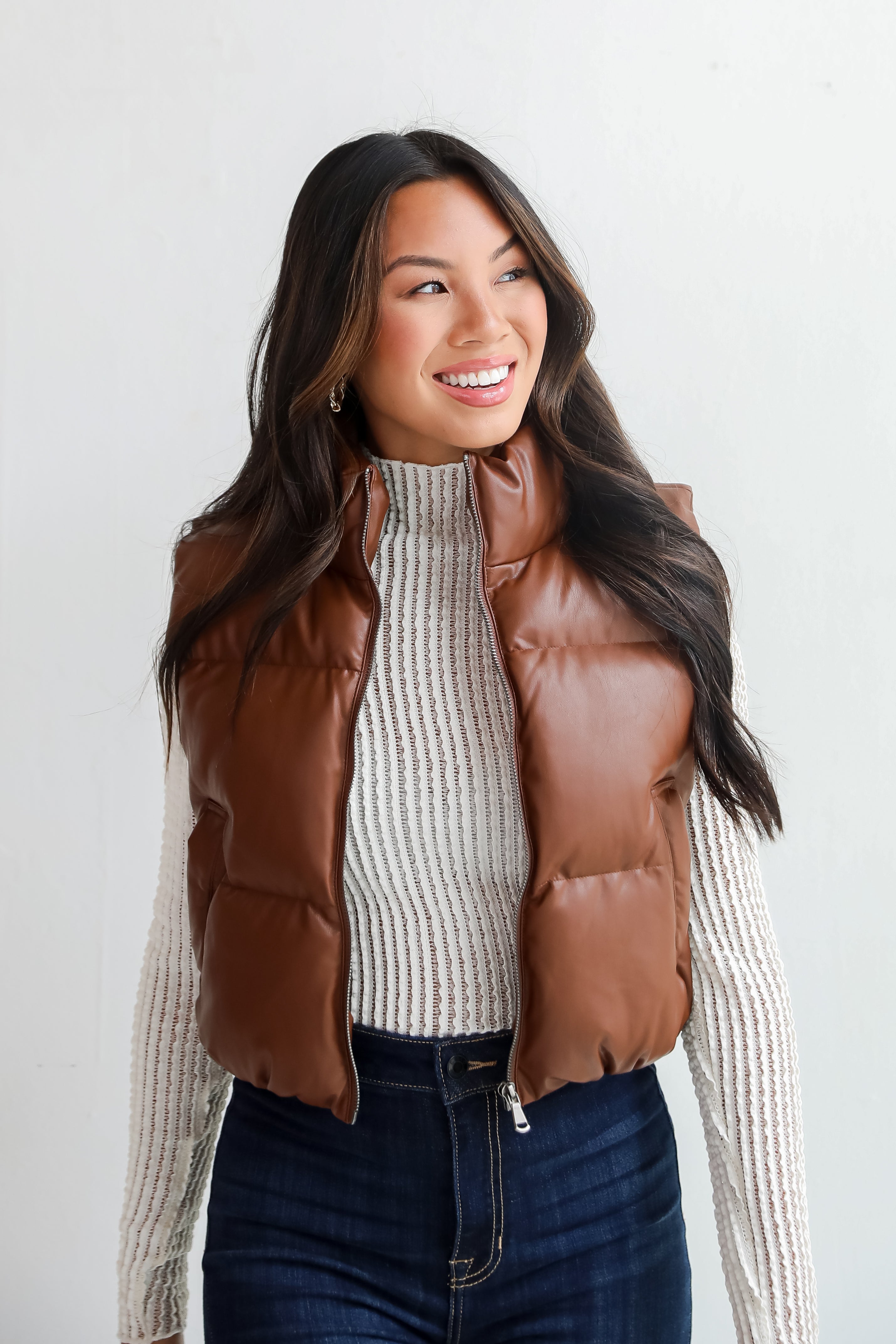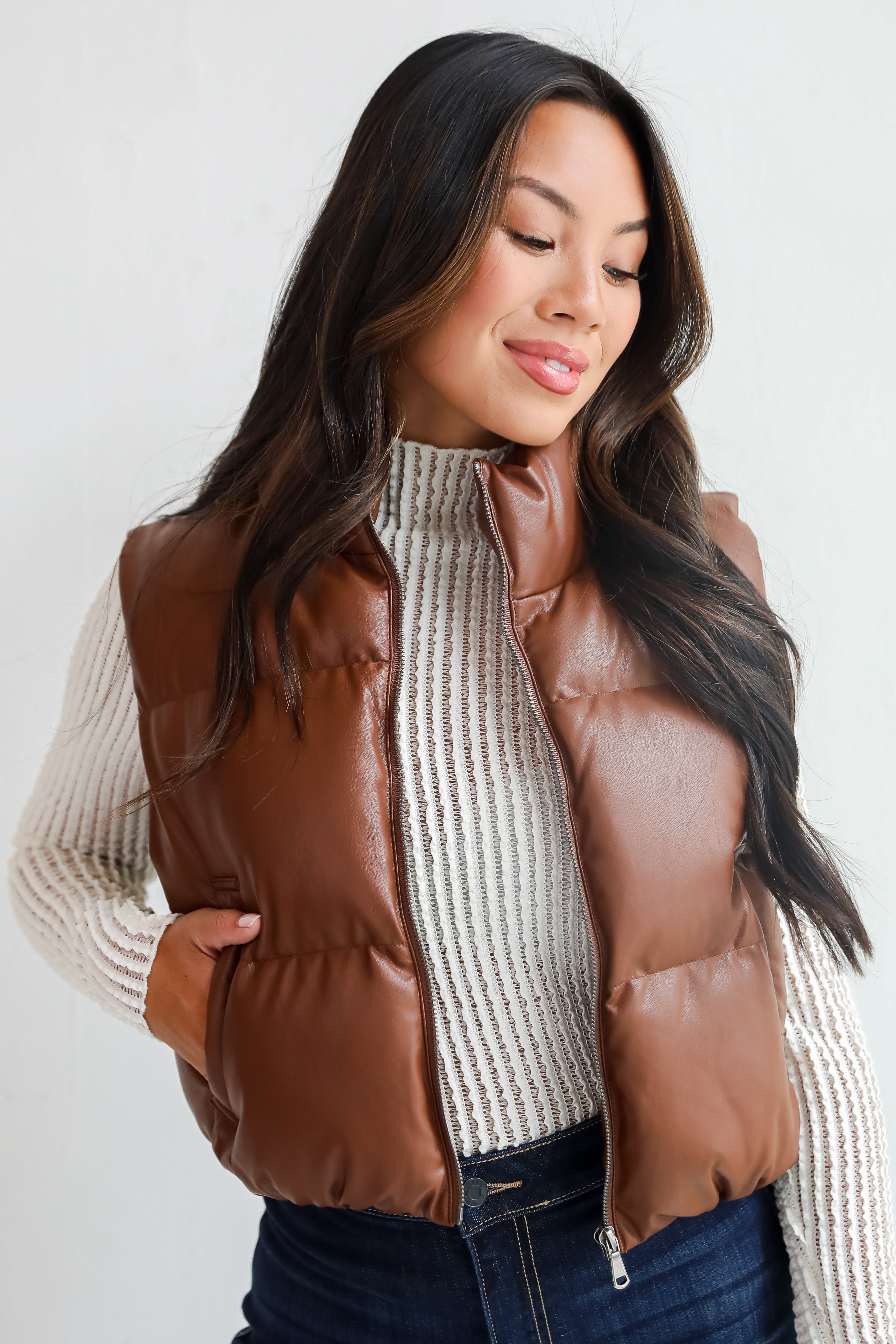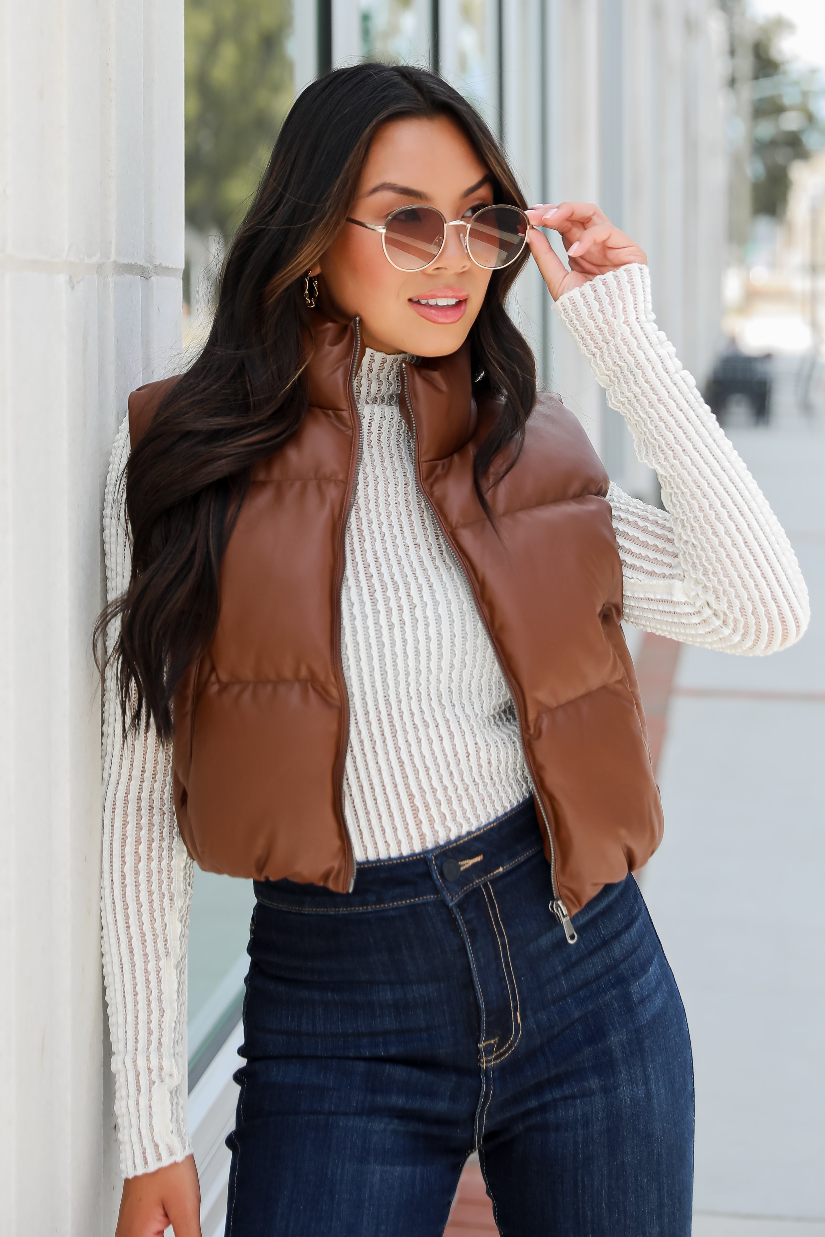 Our favorite weather is whenever we can style the Fave Forecast Chestnut Leather Puffer Vest! Crafted from rich brown leather, this puffer vest combines luxe texture with functional warmth. The quilted design ensures effective insulation while maintaining a sleek, streamlined silhouette. With its high collar and zip-front closure, this vest provides added protection against the elements, making it perfect for layering over sweaters, shirts, or even dresses. The versatile brown hue complements a range of outfits, adding a touch of refined edge to both casual and dressier ensembles. Elevate your cool-weather wardrobe with this statement piece that blends contemporary style with!