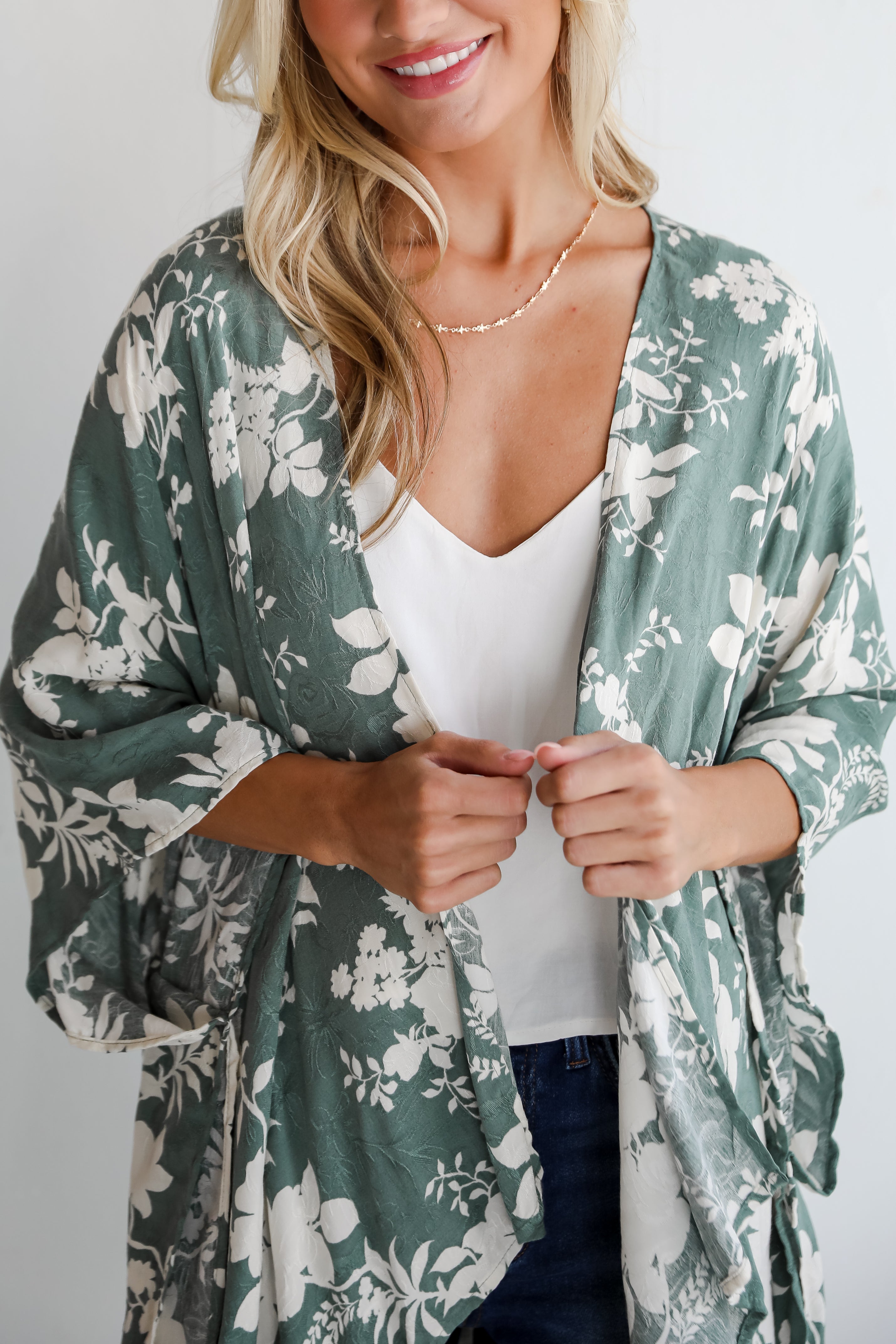 We'll be in a meadow collecting flowers until further notice thanks to the Feeling Flouncy Sage Floral Kimono! This versatile piece combines the grace of traditional design with a modern, nature-inspired twist, making it a standout addition to any wardrobe. Crafted from a lightweight, breathable fabric, this kimono features a soothing sage green backdrop adorned with delicate floral patterns, evoking a sense of tranquility and effortless style. The open-front design and loose, flowy fit ensure maximum comfort and ease of wear. Perfect for layering, this kimono can be worn over a simple tank and jeans for a casual look, or paired with a dress for a more refined ensemble!