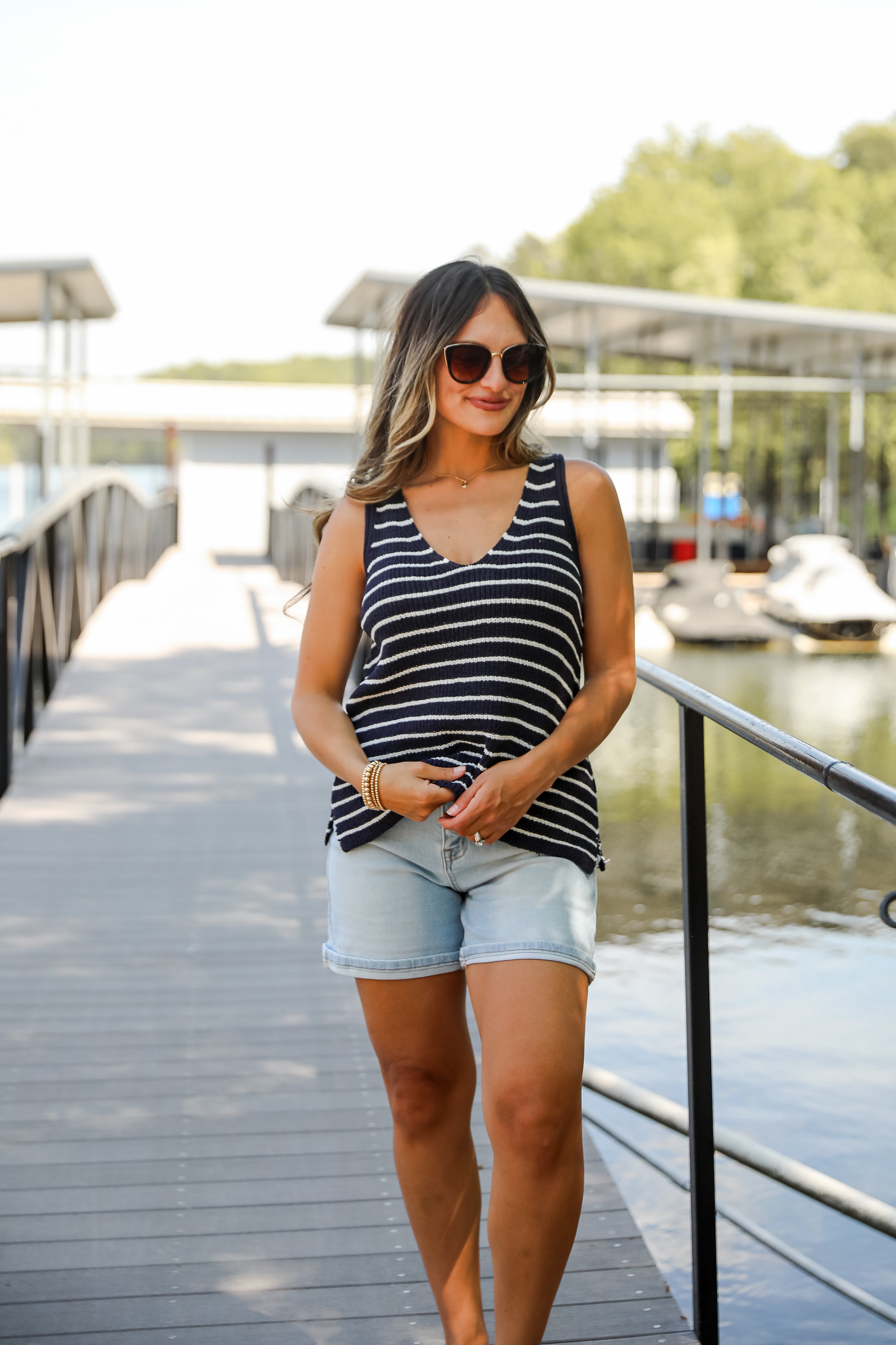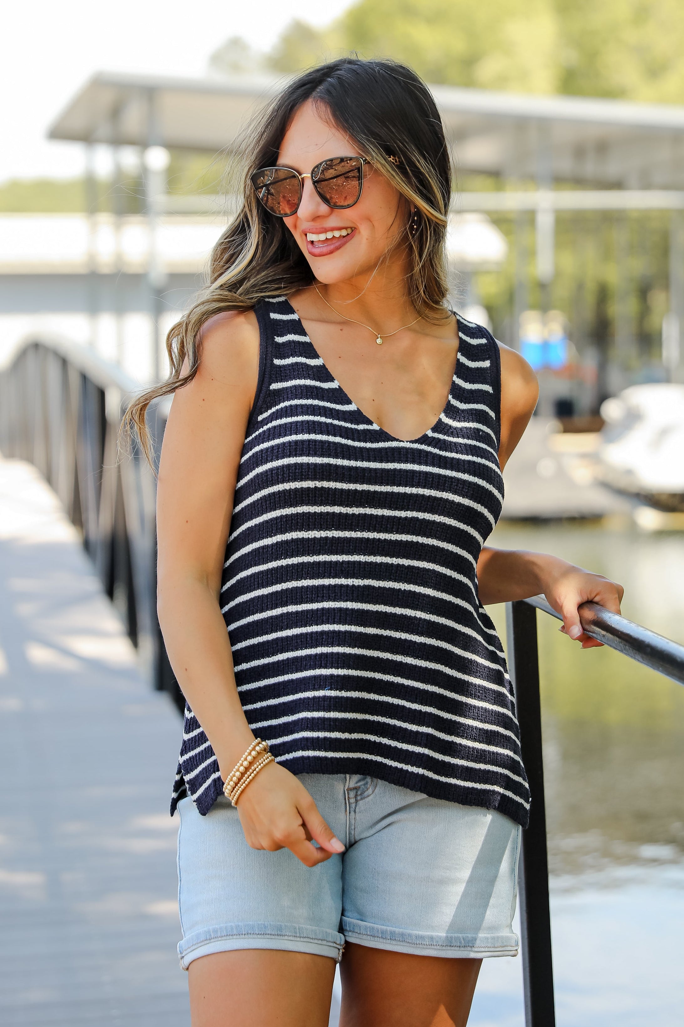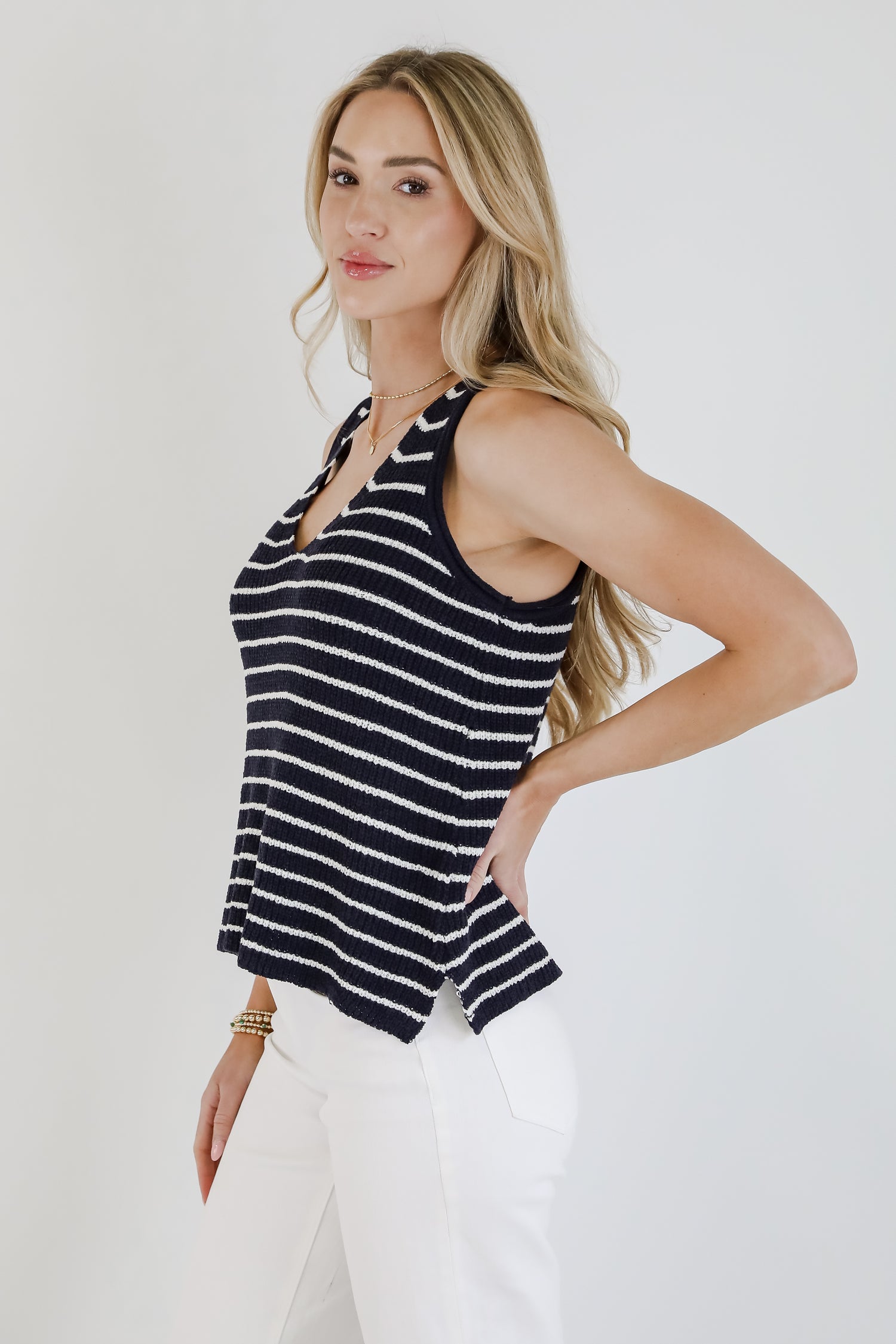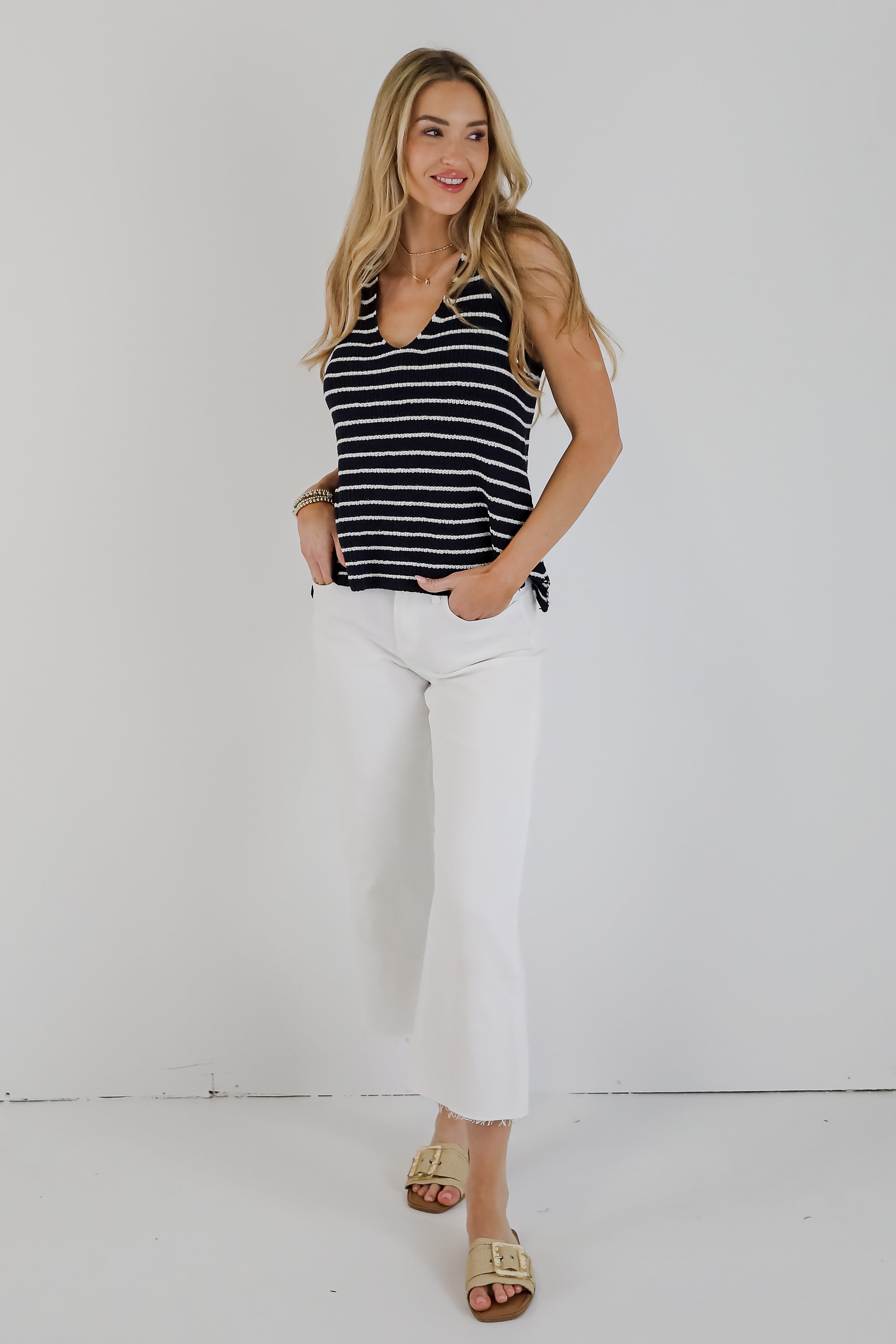 The sweet energy of the Feels Like Freedom Navy Striped Knit Tank will make it the perfect look for any summer day date! This soft, stretchy knit tank features a flattering V-neckline and a timeless navy and white stripe pattern that never goes out of style. The fitted silhouette makes it perfect for layering or wearing on its own, while the lightweight knit keeps you cool and comfy. Pair it with denim, trousers, or shorts for an effortlessly polished look—whether you're heading to brunch or a breezy day by the water!