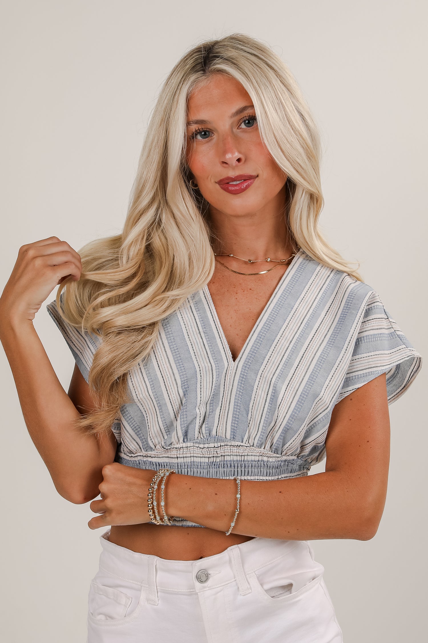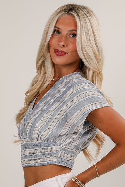 Playful yet polished, the Feels Like Love Blue Striped Blouse demands everyone's attention! This lightweight and breezy top features classic blue stripes and a flattering v-neckline for a timeless yet playful look. The cropped length pairs perfectly with high-waisted jeans, shorts, or skirts, while the relaxed fit keeps things cool and comfortable. Whether you're heading to brunch or a beach day, this blouse adds a fresh, stylish touch to any outfit!