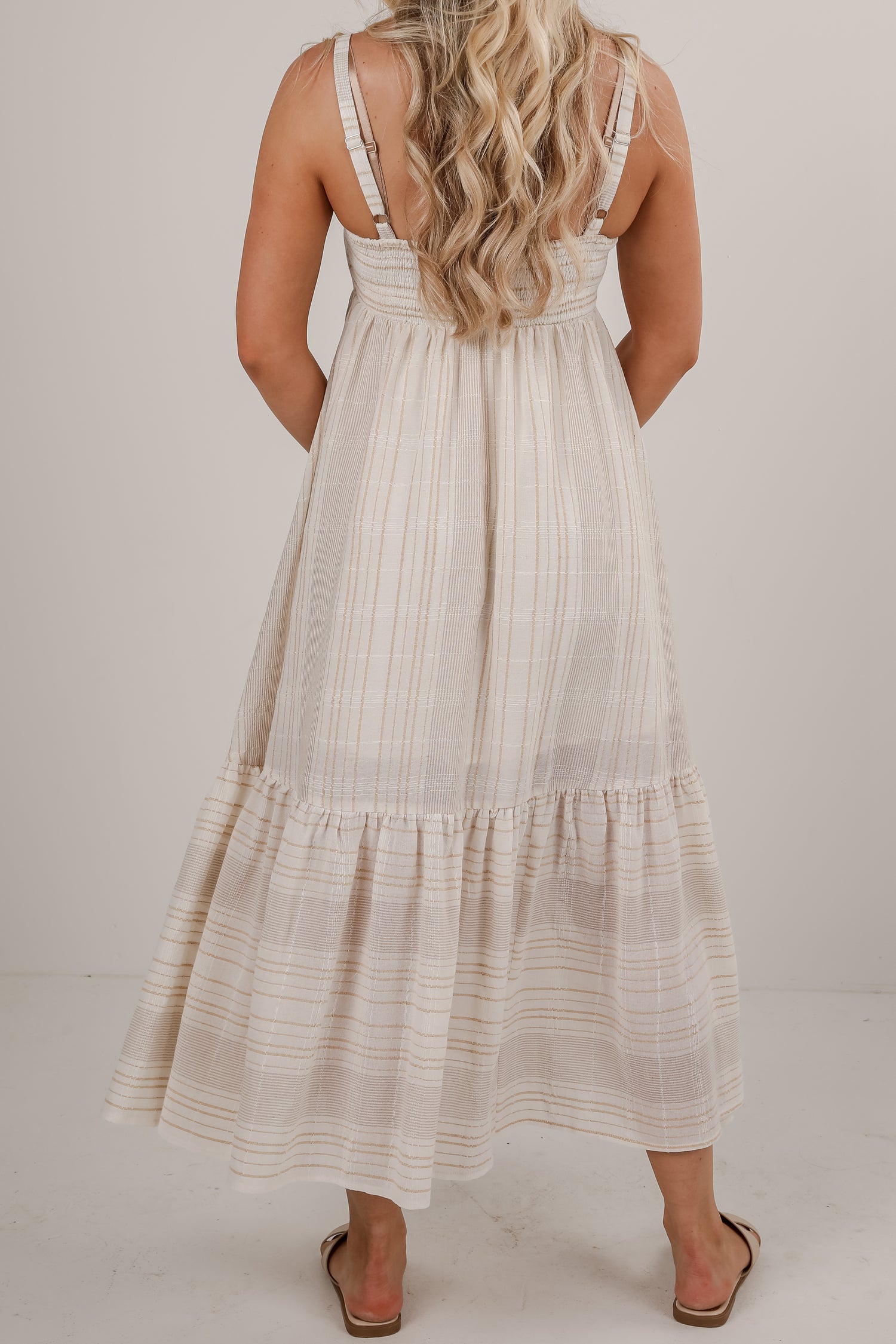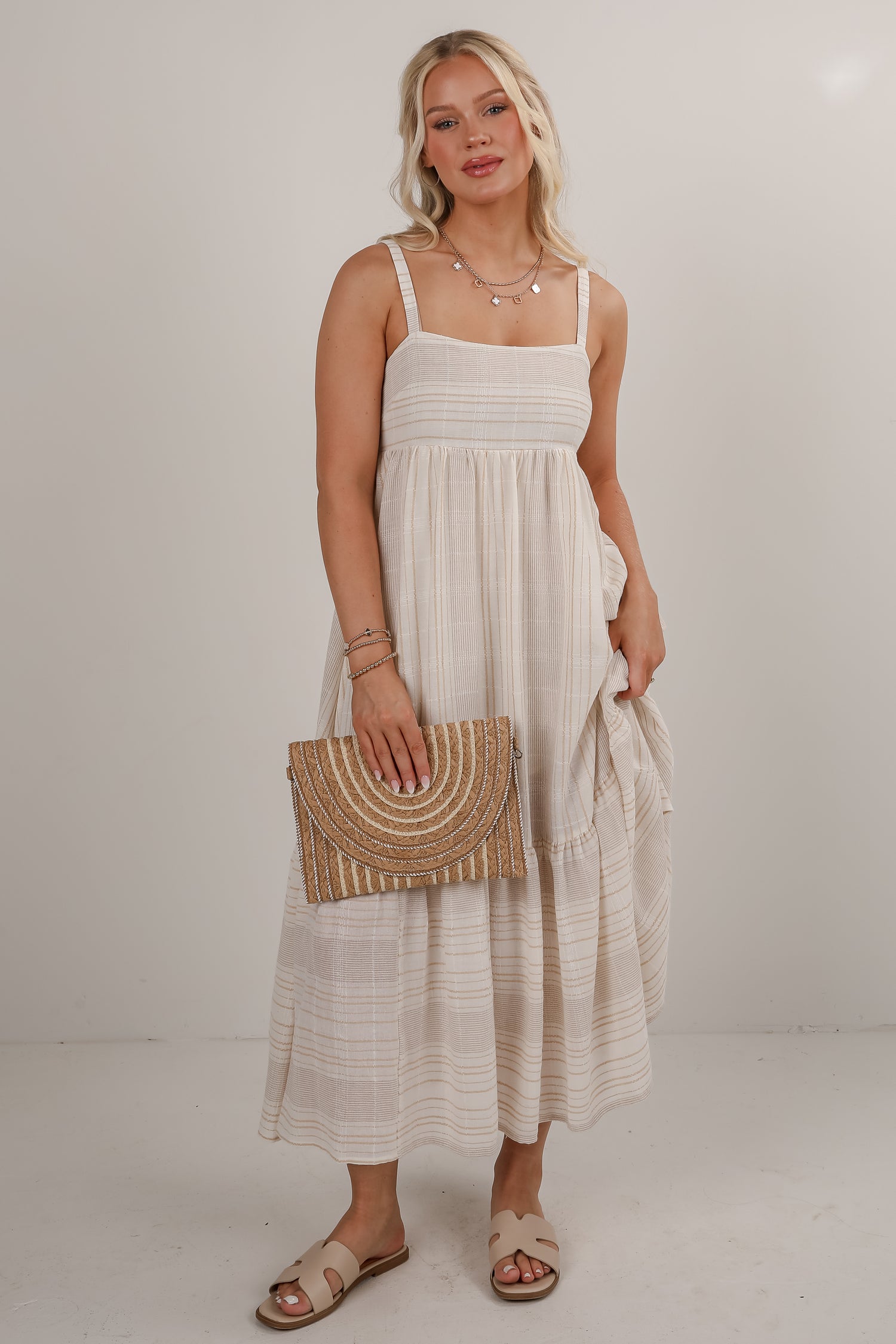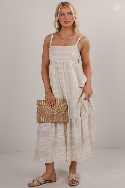 The Gather Round White Striped Maxi Dress is complete with a Boho-chic essence and a summer-ready design! This effortlessly elegant dress features soft taupe stripes on a crisp white background for a light, airy look. The sleeveless design and flowy silhouette keep things cool and comfortable, while the maxi length adds a touch of sophistication. Perfect for beach vacations, brunch dates, or casual summer gatherings, this dress is your go-to for easy, understated style!