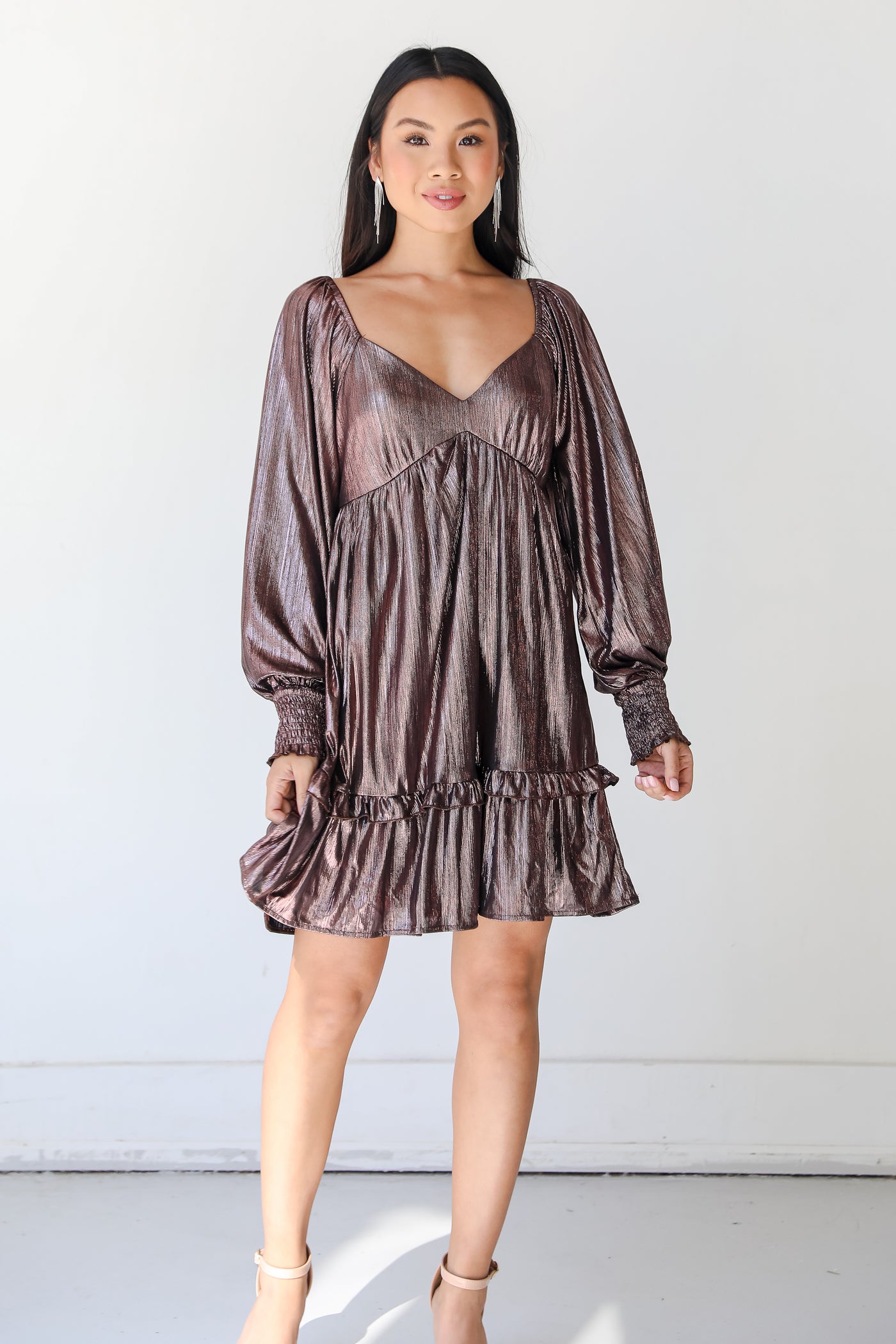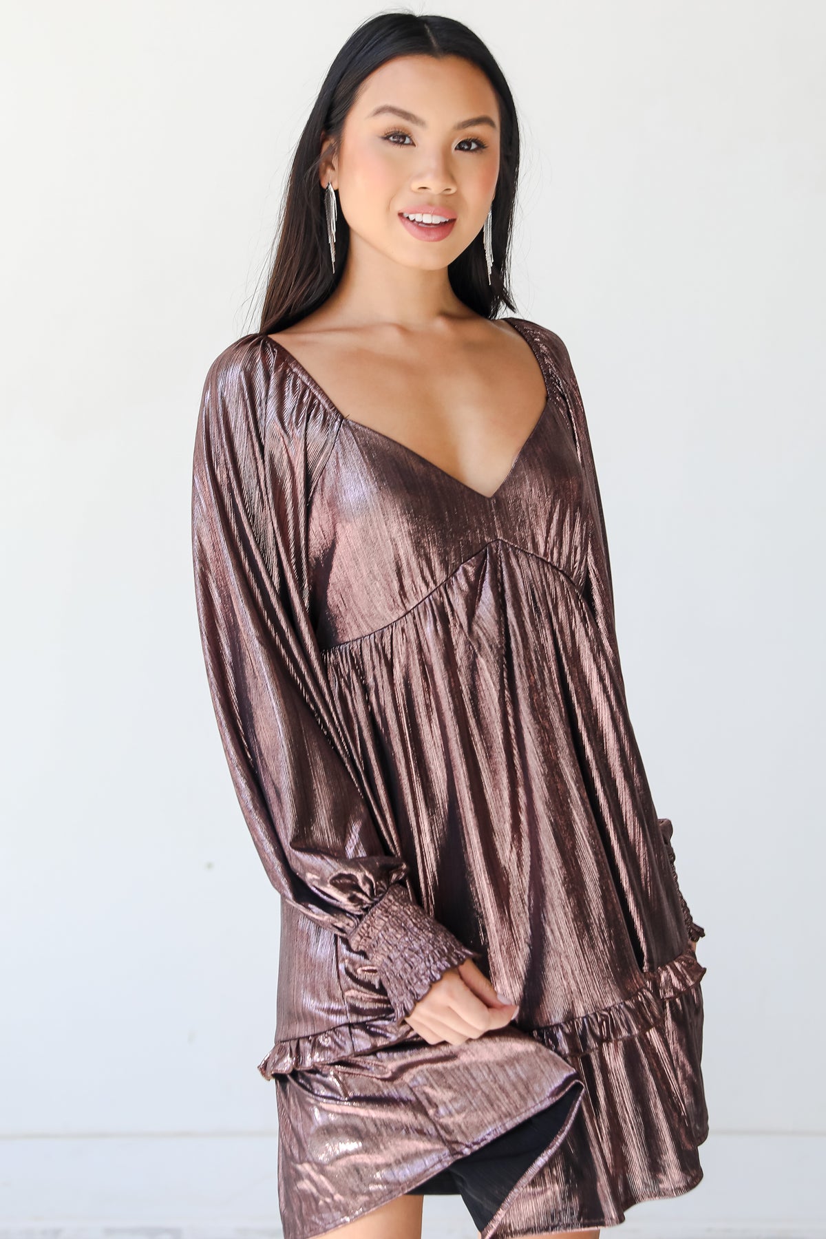We can't imagine a better way to look fabulous than with the Giving Glamour Metallic Mini Dress! This gorgeous dress is designed with a textured + stretchy lightweight woven knit in a metallic finish. It features a v-neckline, long balloon sleeves with smocked cuffs, elastic shoulders, and a flowy fit with a ruffle hem that ends at a mini length. Style the Giving Glamour Metallic Mini Dress with heels and gold jewelry for a holiday party!