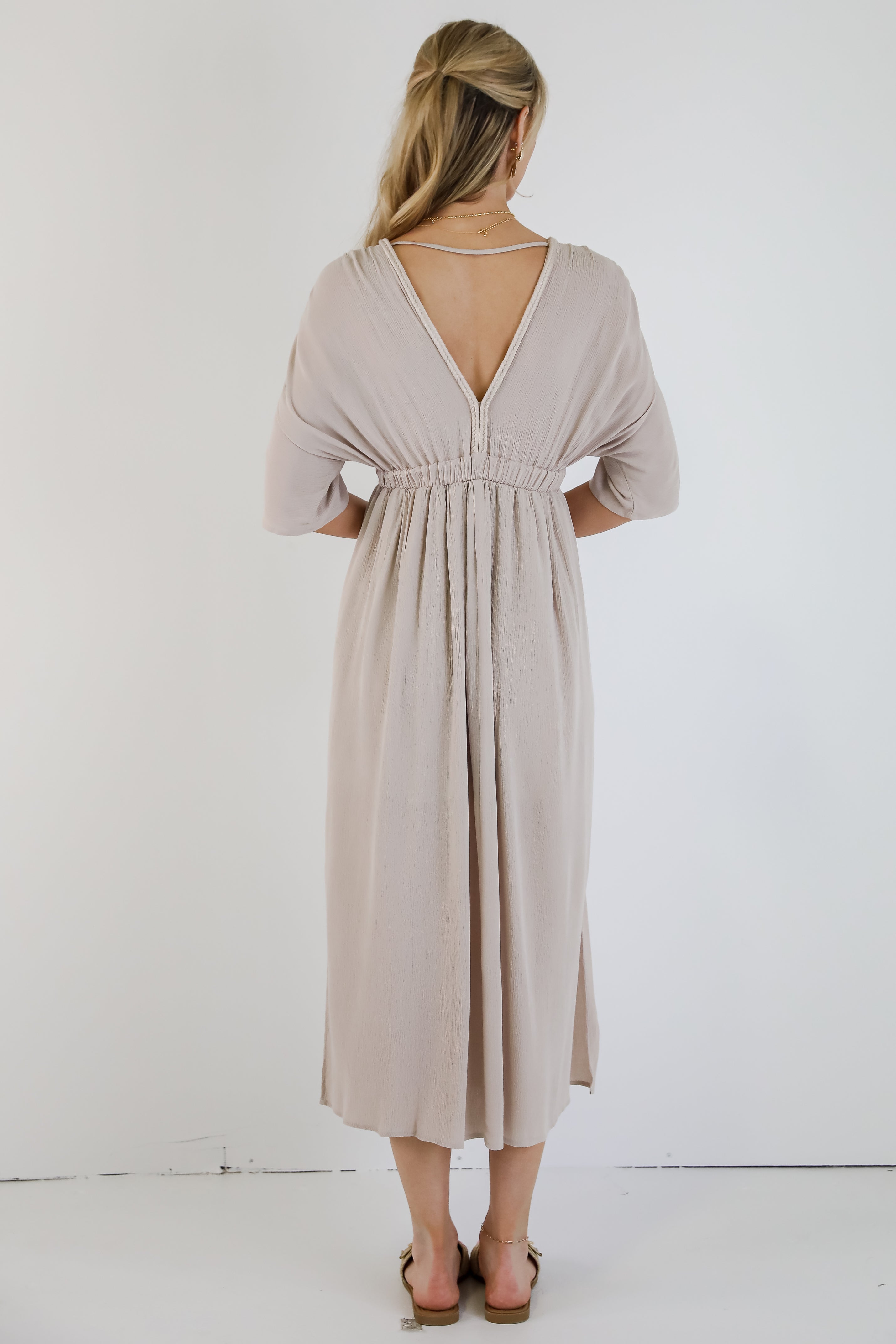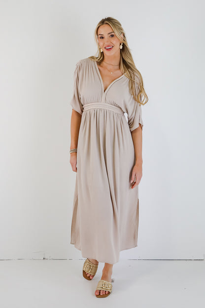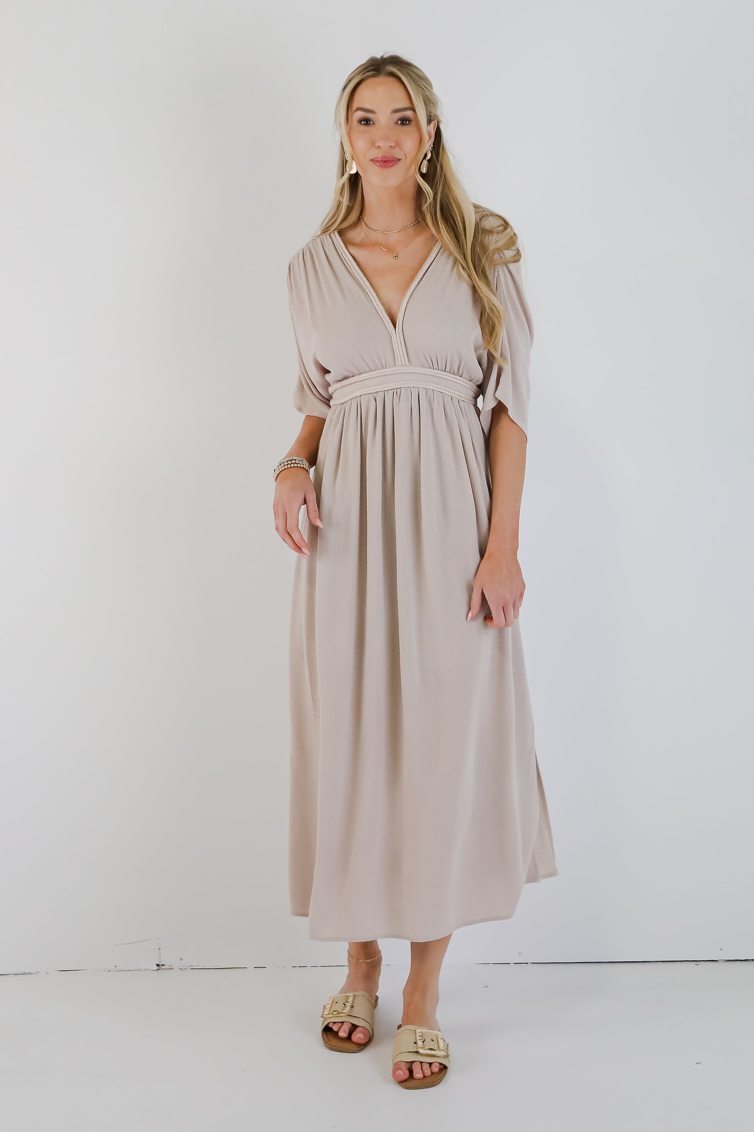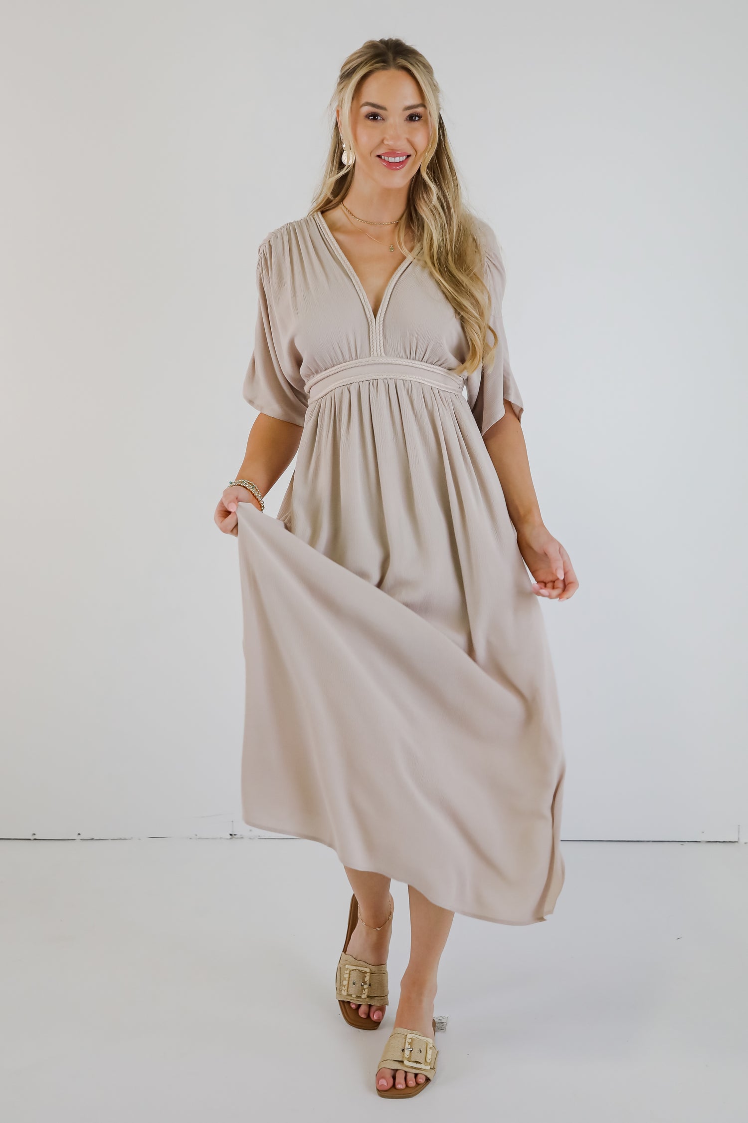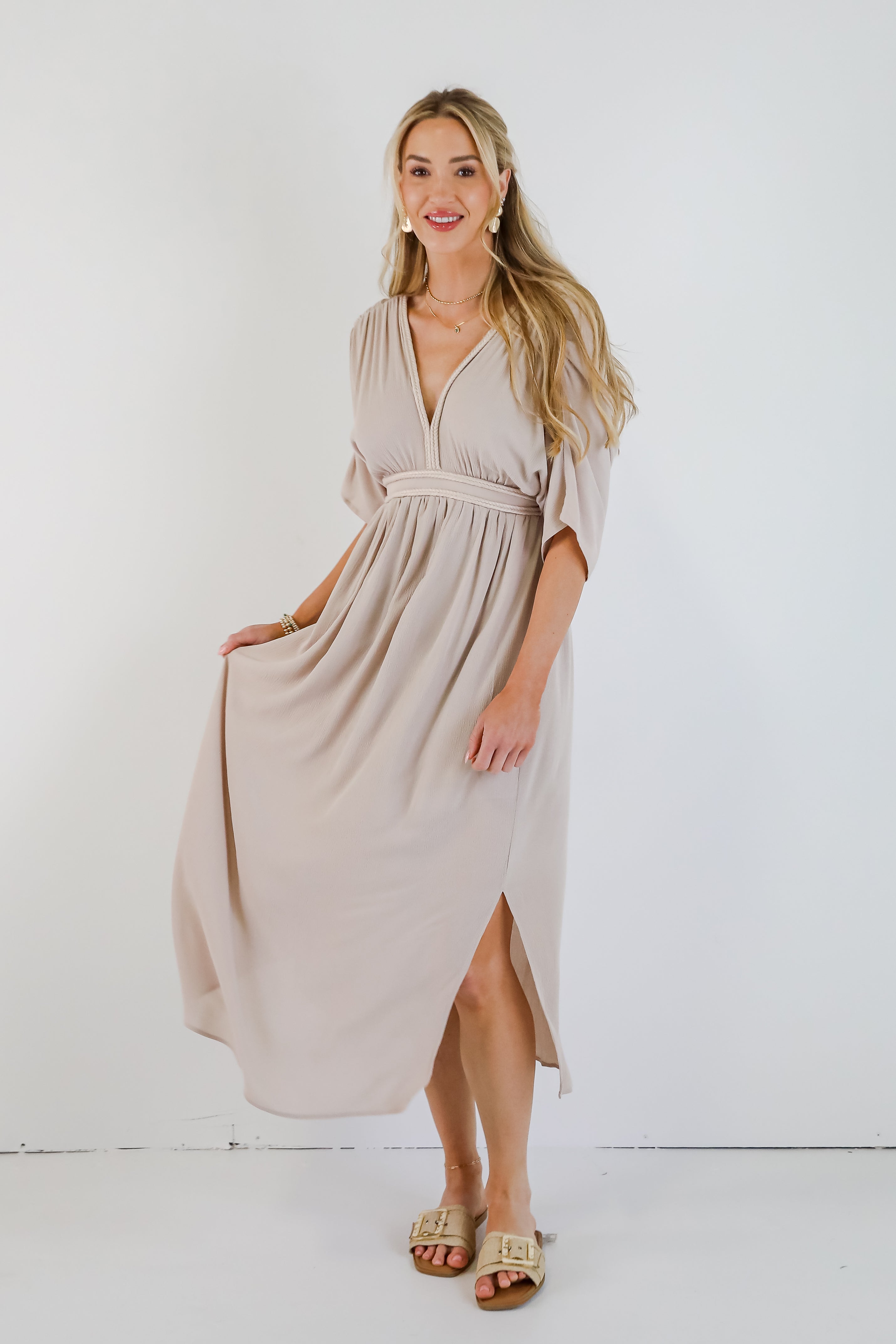 Serve an effortless glow everywhere you go in the Goddess Aura Natural Maxi Dress! Crafted in a soft, neutral taupe hue, this maxi dress features a relaxed, flowy silhouette that moves with you. The braided trim adds a beautiful bohemian touch, giving it subtle texture and artisanal charm. Whether you're headed to a festival, beach getaway, or just soaking up sunshine, this dress pairs perfectly with sandals, layered jewelry, and a wide-brim hat for that true boho goddess vibe!