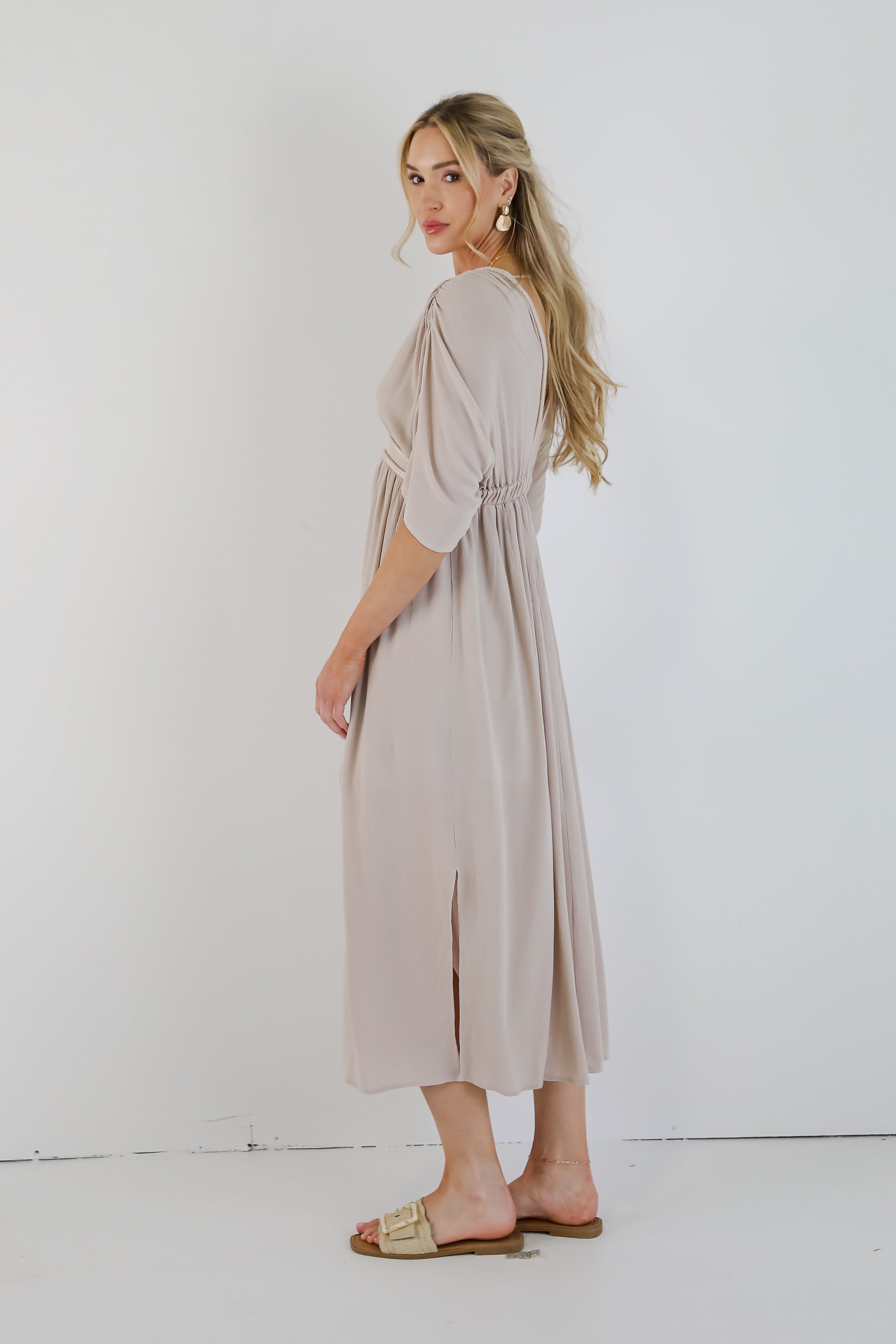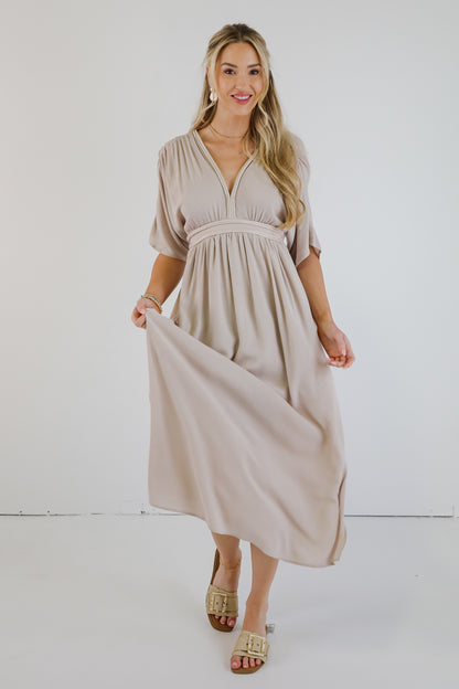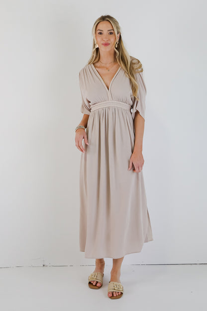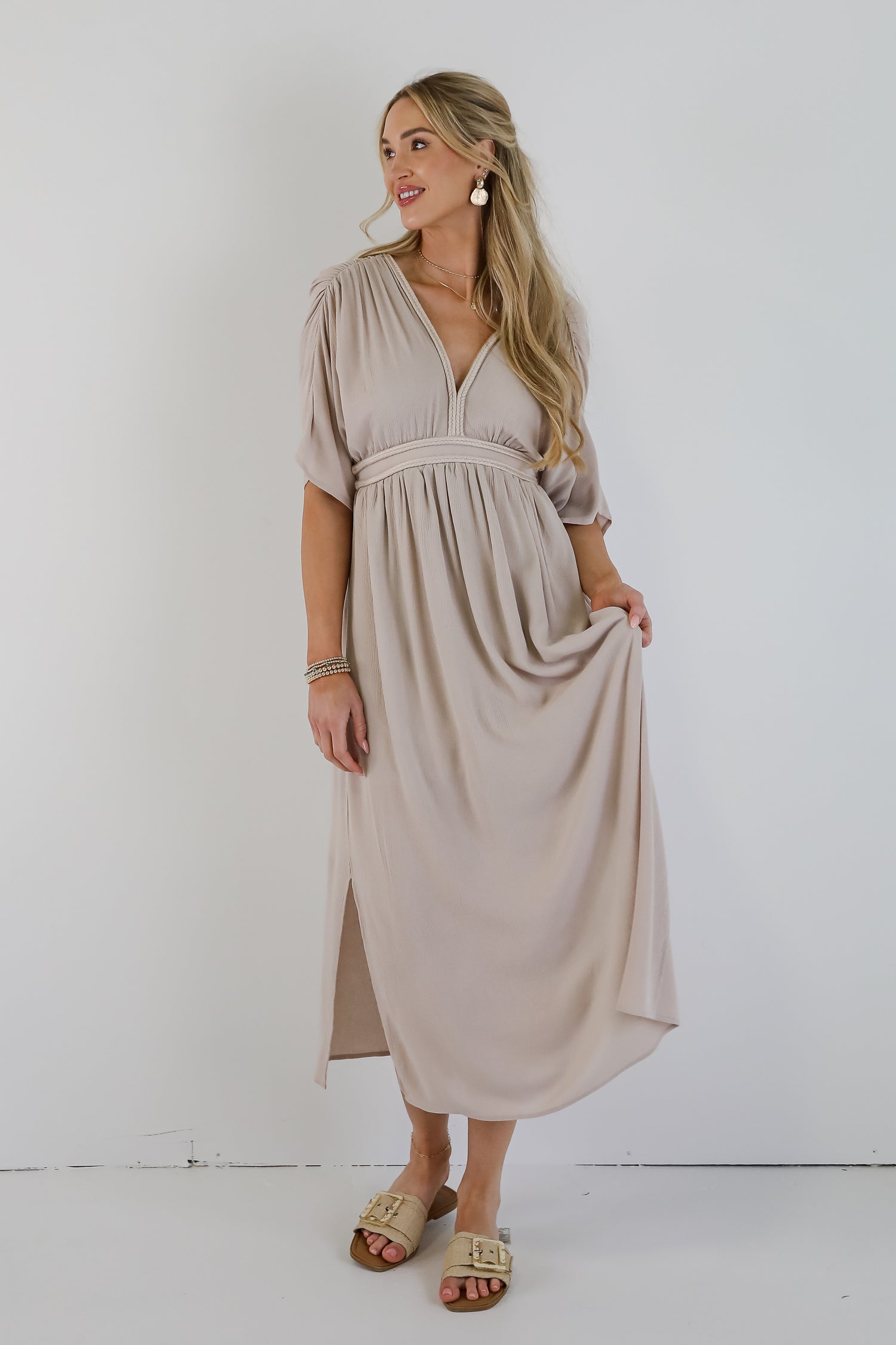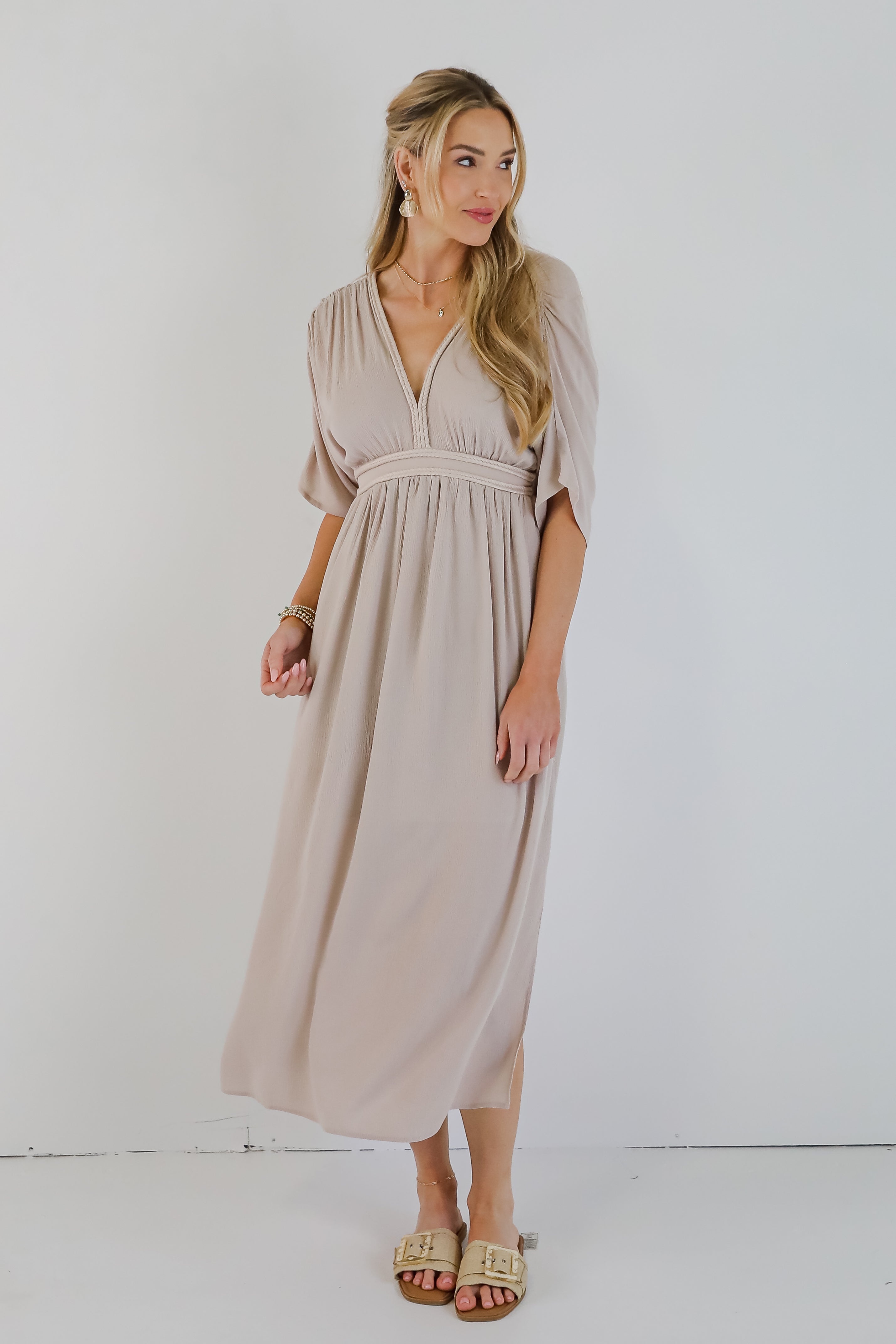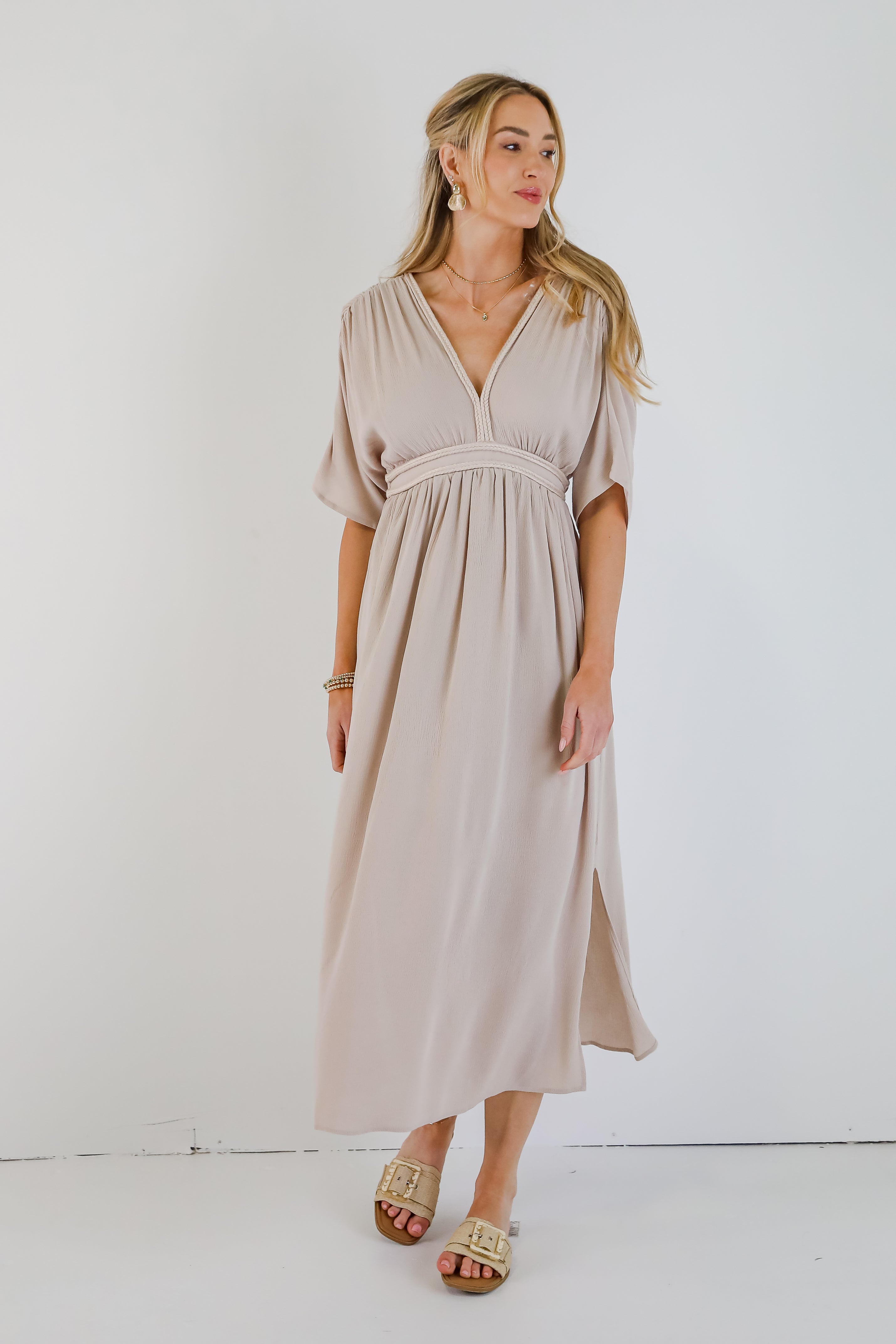 Serve an effortless glow everywhere you go in the Goddess Aura Natural Maxi Dress! Crafted in a soft, neutral taupe hue, this maxi dress features a relaxed, flowy silhouette that moves with you. The braided trim adds a beautiful bohemian touch, giving it subtle texture and artisanal charm. Whether you're headed to a festival, beach getaway, or just soaking up sunshine, this dress pairs perfectly with sandals, layered jewelry, and a wide-brim hat for that true boho goddess vibe!