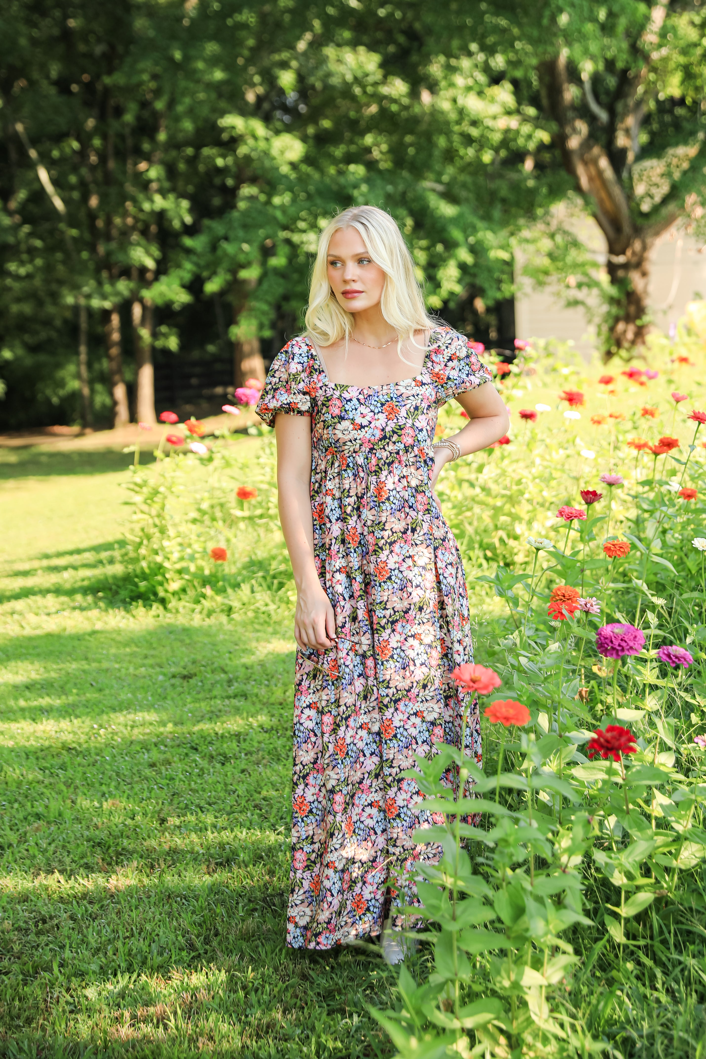 Prepare for everyone to shower you with compliments when you arrive in the Graceful Perfection Navy Floral Maxi Dress! Featuring a rich navy base adorned with a delicate floral print, this maxi dress is designed with soft puff sleeves for a touch of feminine charm and a flattering square neckline that frames the face beautifully. The flowy, tiered skirt creates graceful movement, while the lightweight fabric keeps it comfortable for all-day wear. Perfect for weddings, garden parties, or date nights, just add your favorite heels or sandals for an effortlessly chic look!