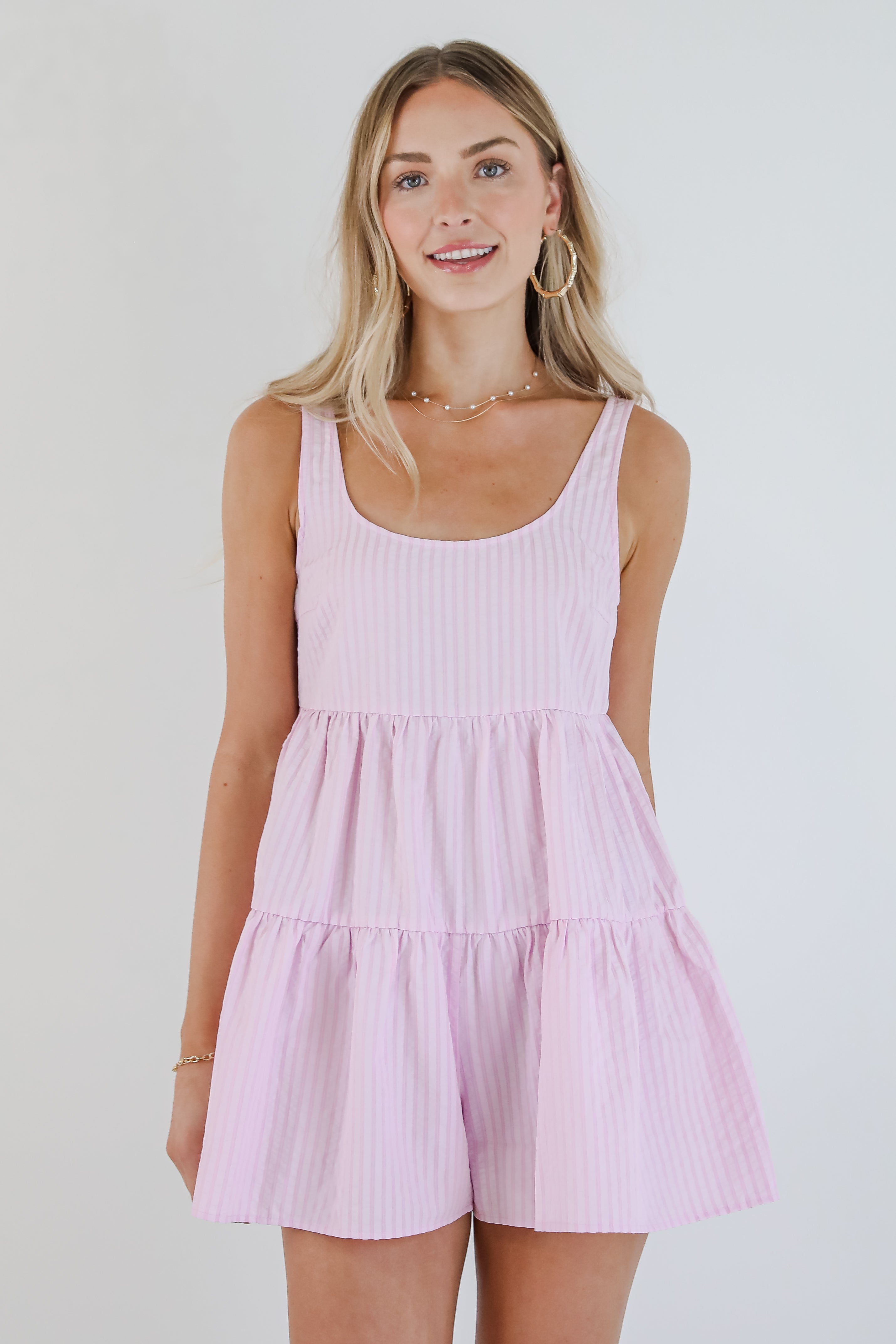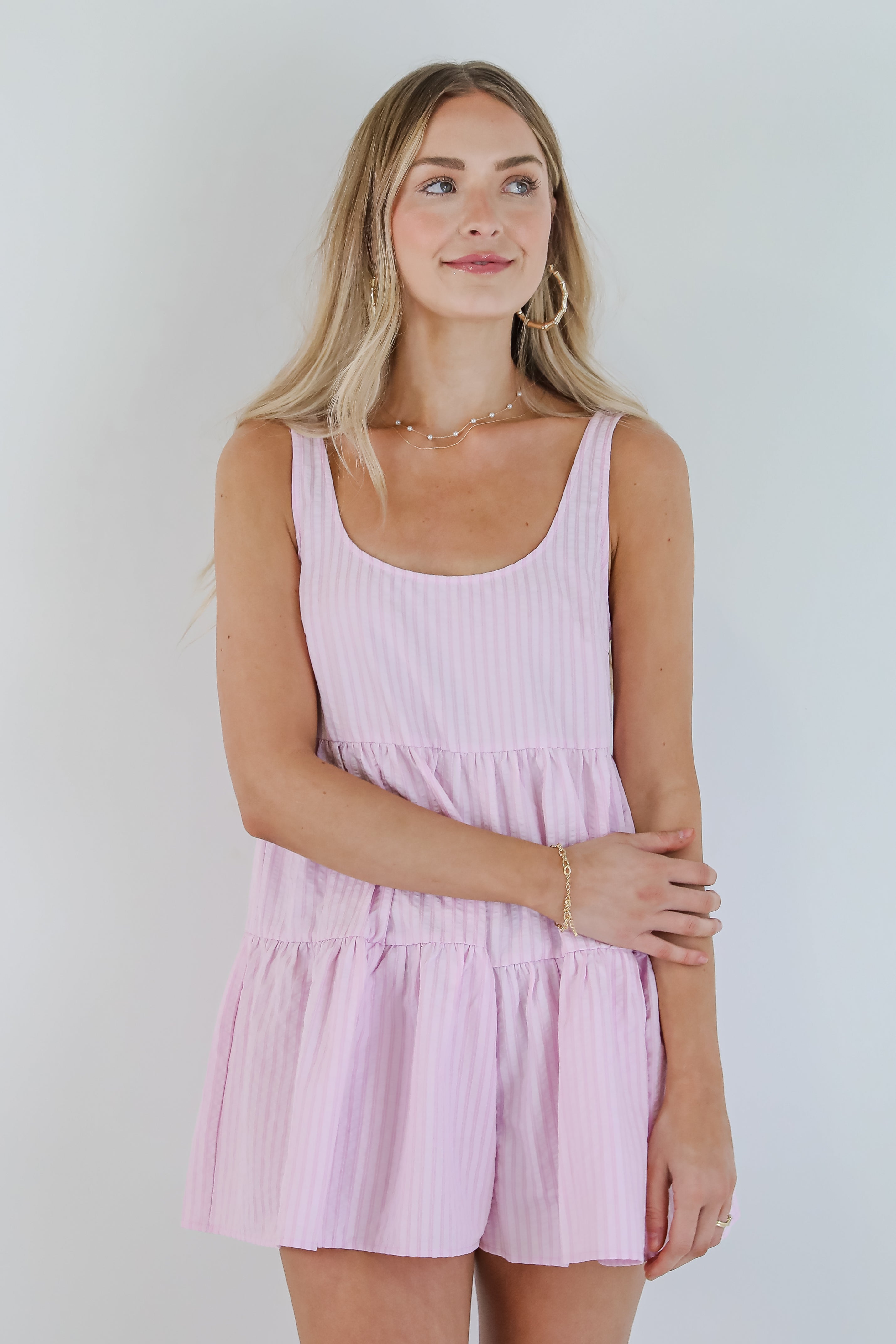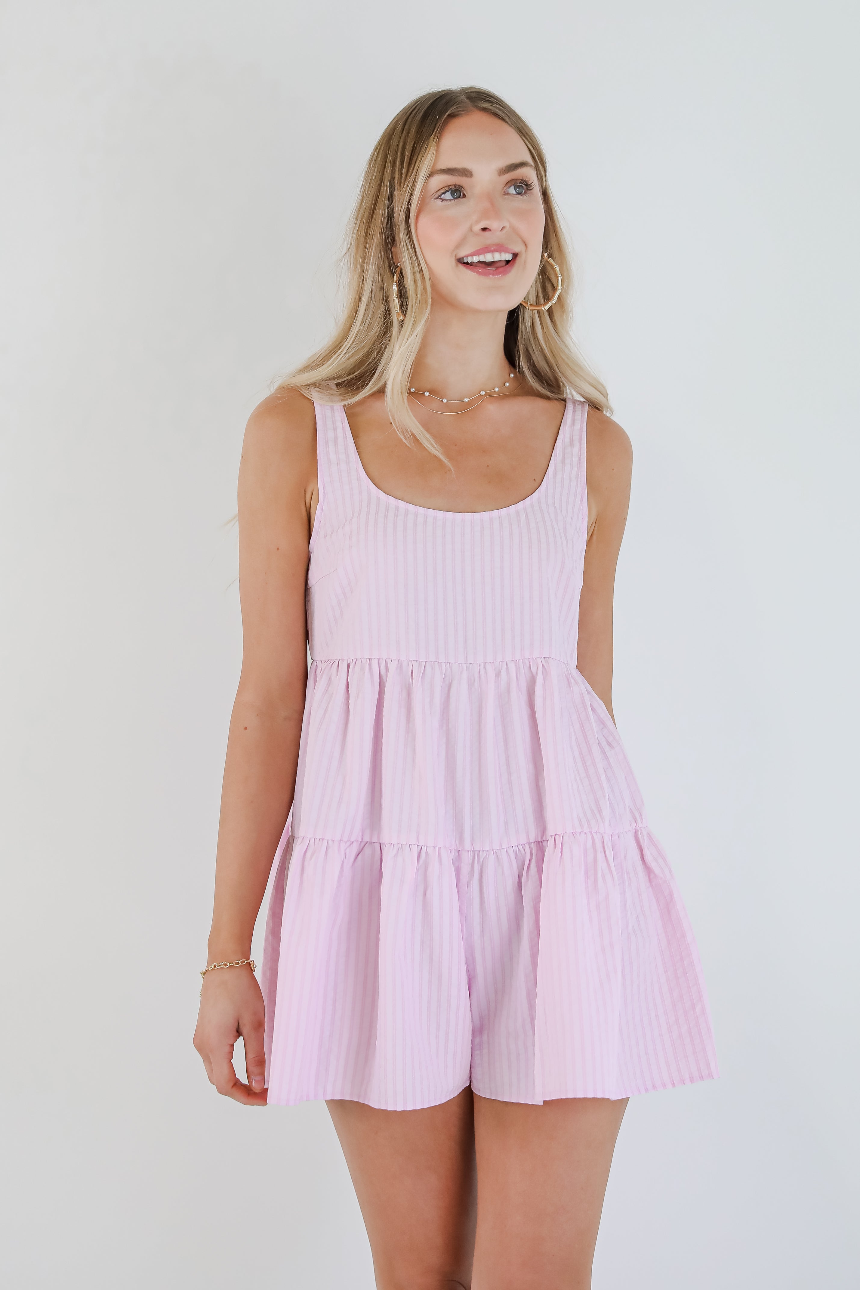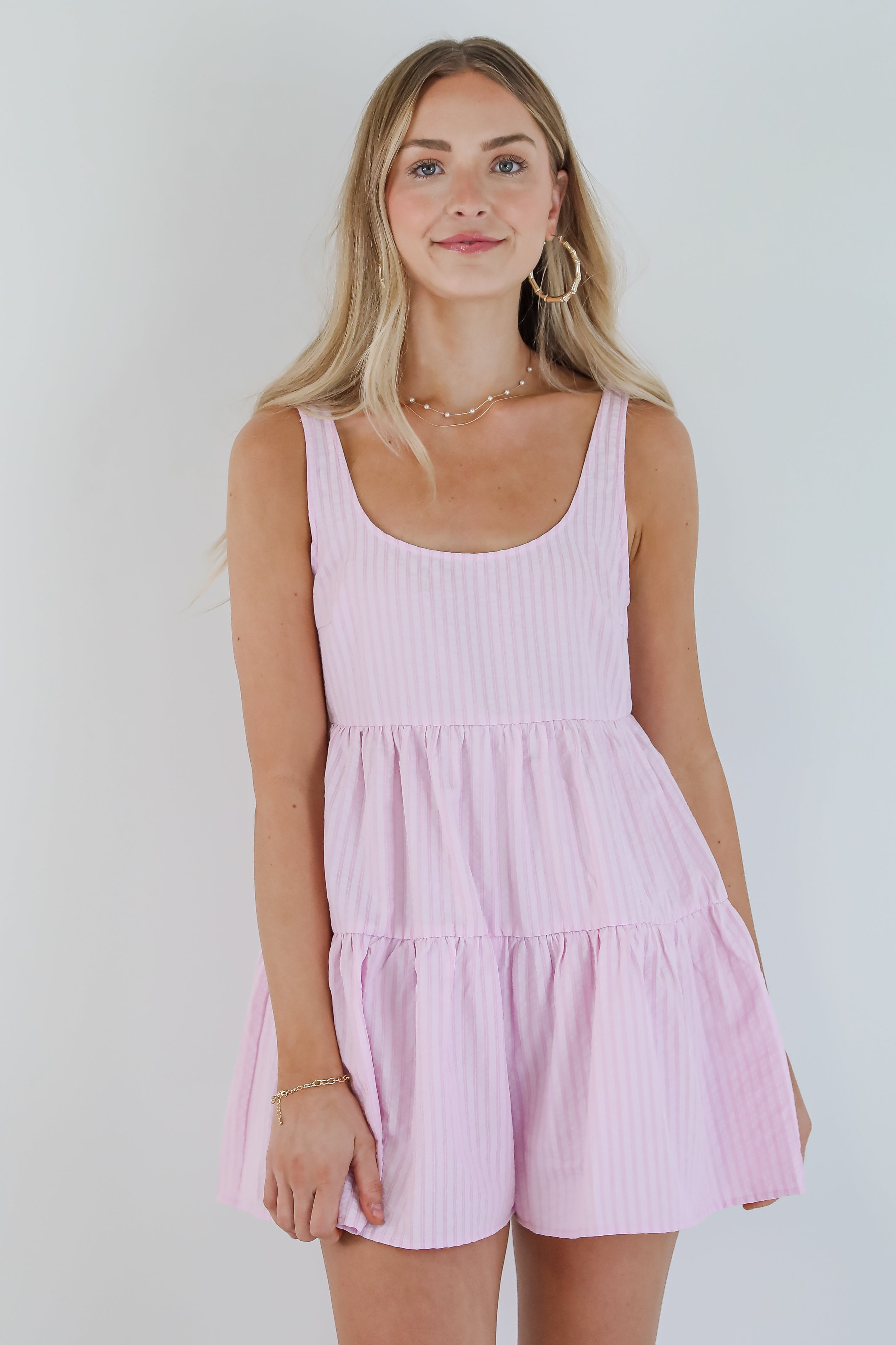 It's easy to fall in love with a look as cute as the Inspiring Love Blush Striped Romper! Featuring soft blush and white stripes, this romper is designed with tiered, flowy layers that add dreamy movement and a flattering silhouette. The sleeveless cut keeps it breezy and lightweight, perfect for sunny days, weekend brunches, or vacay strolls. Just pair it with sandals and a straw hat for an easy, feminine look that feels as good as it looks!