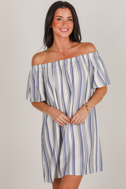 An effortlessly romantic day includes the Just A Theory Blue Striped Mini Dress! Featuring classic vertical stripes in crisp blue and white, this dress is designed with flutter sleeves for a soft, feminine touch. The mini length adds a flirty vibe, while the lightweight fabric keeps it breezy and comfortable all day long. Ideal for brunch dates, weekend outings, or seaside strolls, this dress is a go-to for effortless summer style!