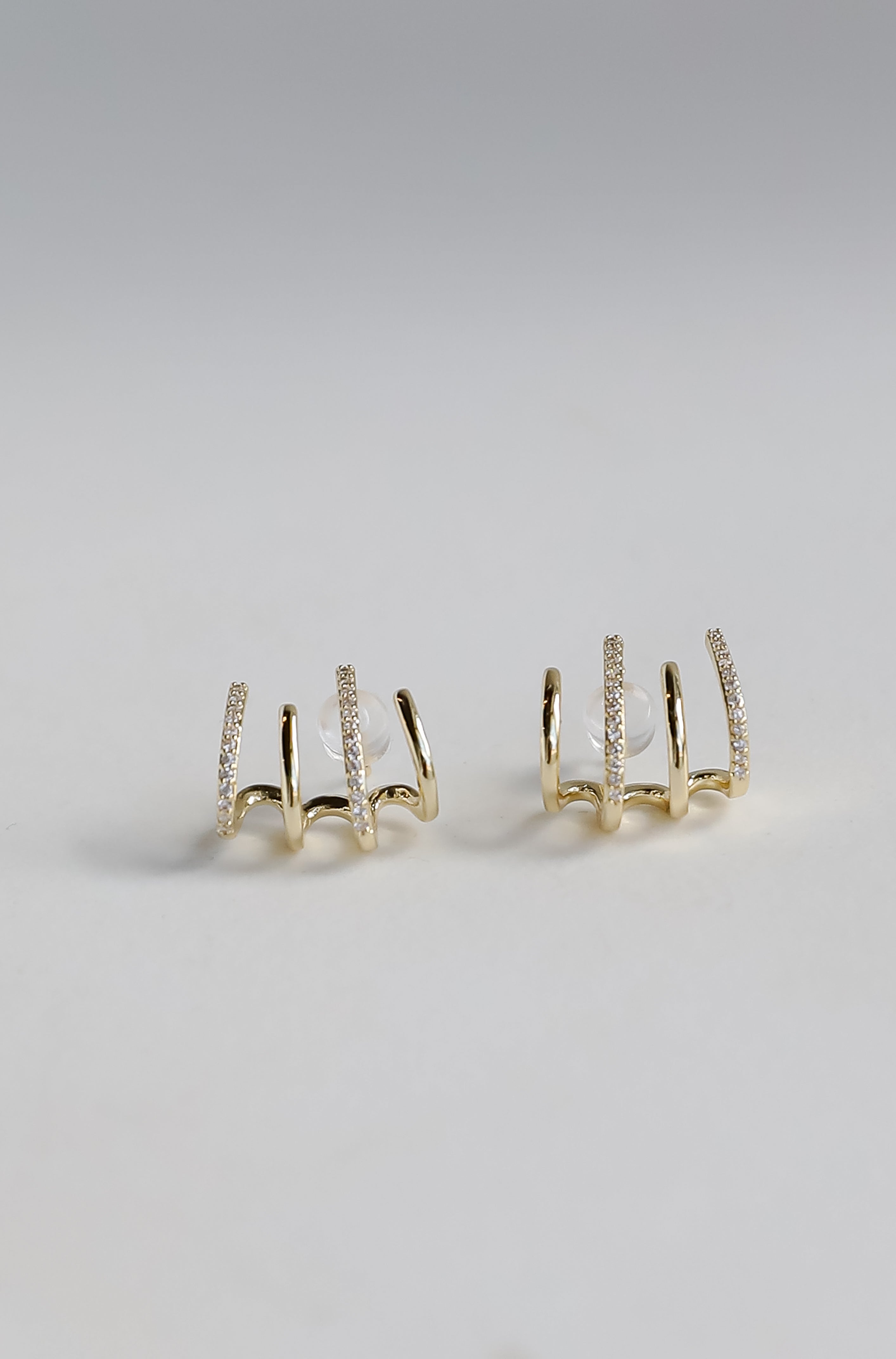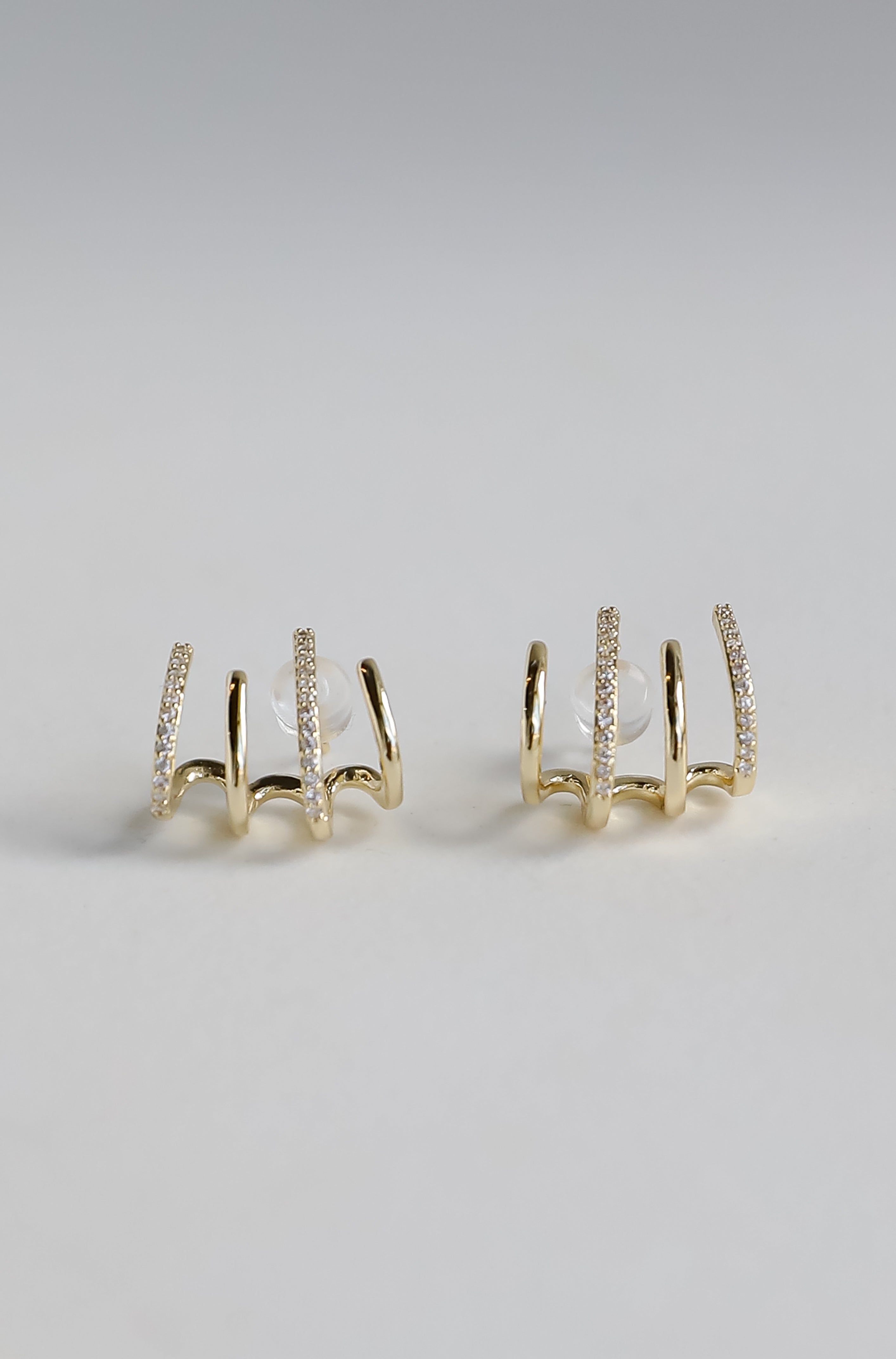 Take any evening look to the next level when you decide to accessorize with a piece like the Kayla Gold Stud Earrings! These dainty earrings feature a quadruple mini hoop shape with rhinestones and a stud post back! Style the Kayla Earrings with a mini dress + heels for a boho look!