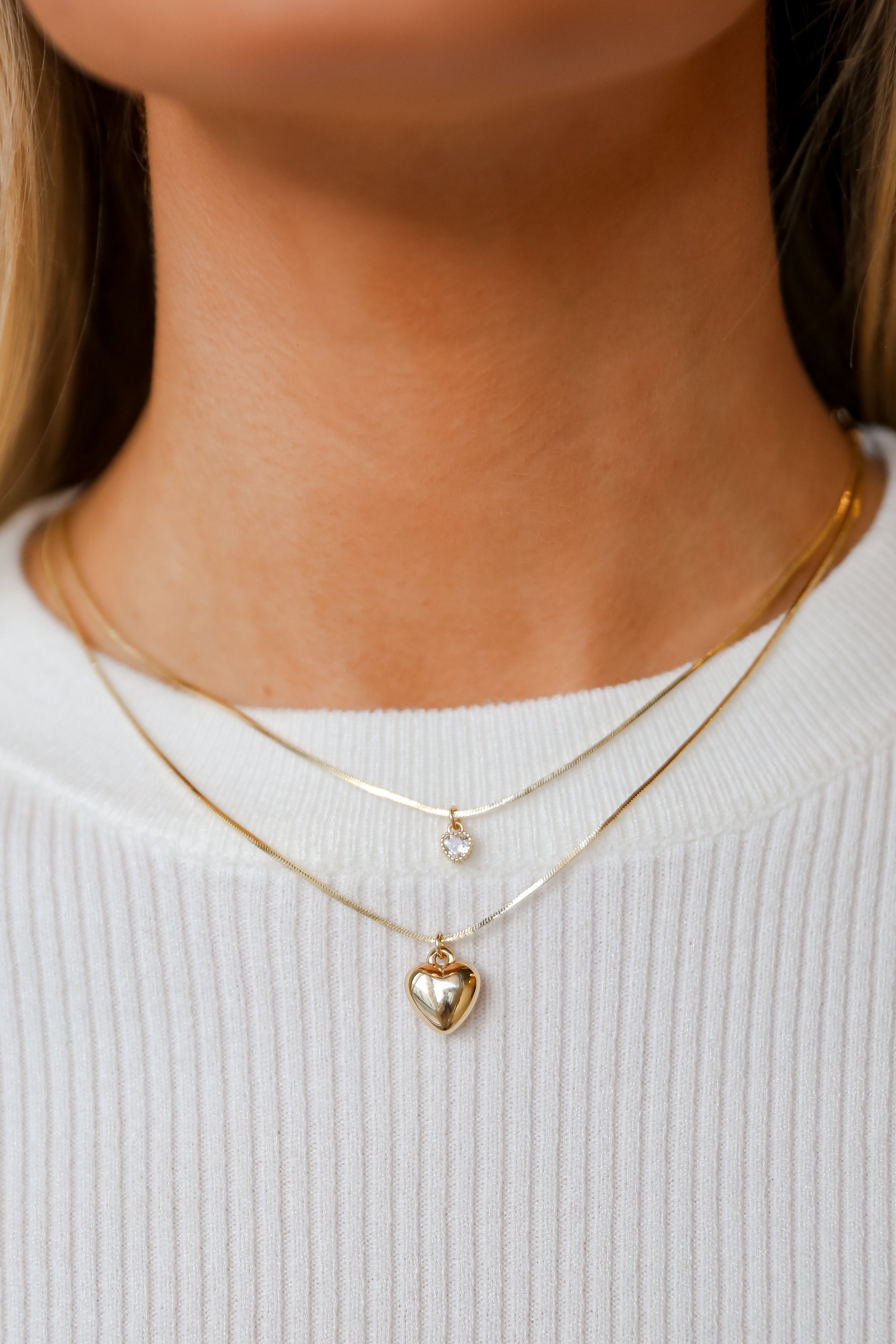 Show your sweet side with the adorably fun Kinsley Gold Heart Layered Chain Necklace! This trendy necklace features two layers of gold chains with a heart charm + a rhinestone heart charm on the end. Style the Kinsley Necklace with any outfit to instantly upgrade your look!