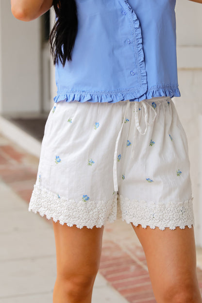 Sunny days strolling seaside towns call for cute lil' looks like the Look This Way White Floral Lace Shorts! These lightweight, breezy shorts feature a comfortable elastic waistband for the perfect fit and all-day ease. Delicate blue floral embroidery adds a soft, romantic touch, while the lace trim along the hem brings in a hint of vintage charm. Whether you're lounging at home or heading out for a sunny day adventure, these shorts pair perfectly with a simple tank or matching top for a look that’s fresh, feminine, and effortlessly chic!