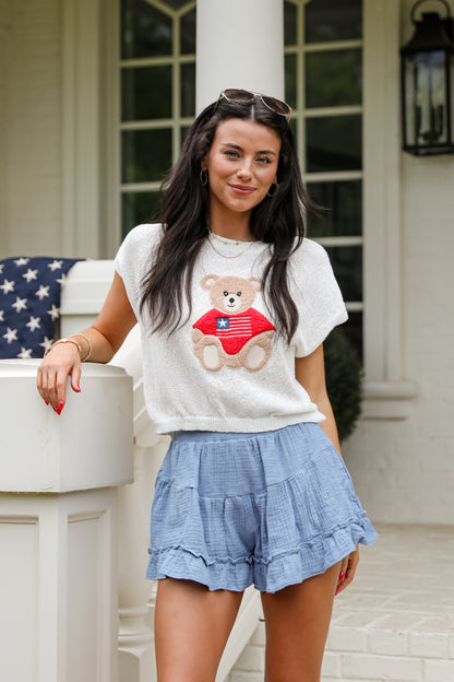 Cozy meets cute in the Made For Celebrating Off White Teddy Bear Knit Top! This soft and breathable knit top offers a relaxed fit with charming cap sleeves, making it perfect for layering or wearing on its own. The playful fuzzy teddy bear graphic paired with a classic American flag adds a fun, patriotic touch to your casual wardrobe. Pair it with jeans or shorts for an easy, laid-back look with a cozy, nostalgic vibe!