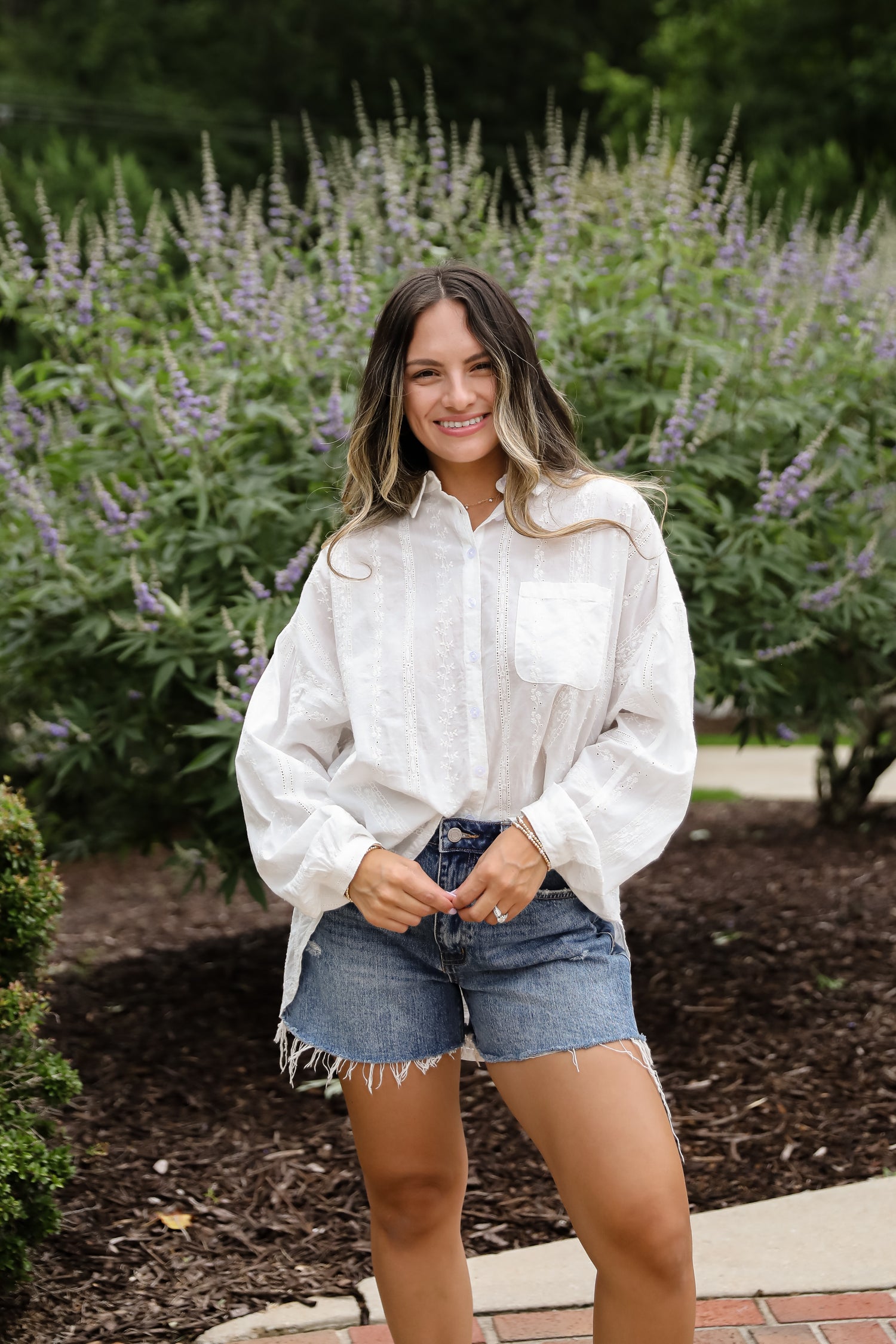 A boho-chic look like the Melodies And Memories White Embroidered Button-Up Blouse is a must-have for creating an endless variety of sweet summer ensembles! This breezy, lightweight top features delicate floral embroidery that adds a soft, feminine flair to the classic button-up style. Designed with an oversized fit, collared neckline, and full-length button front, it’s perfect for wearing tucked, tied, or layered over your favorite tank or bralette. Effortlessly chic and easy to style, this blouse is a must-have for creating laid-back yet polished outfits!