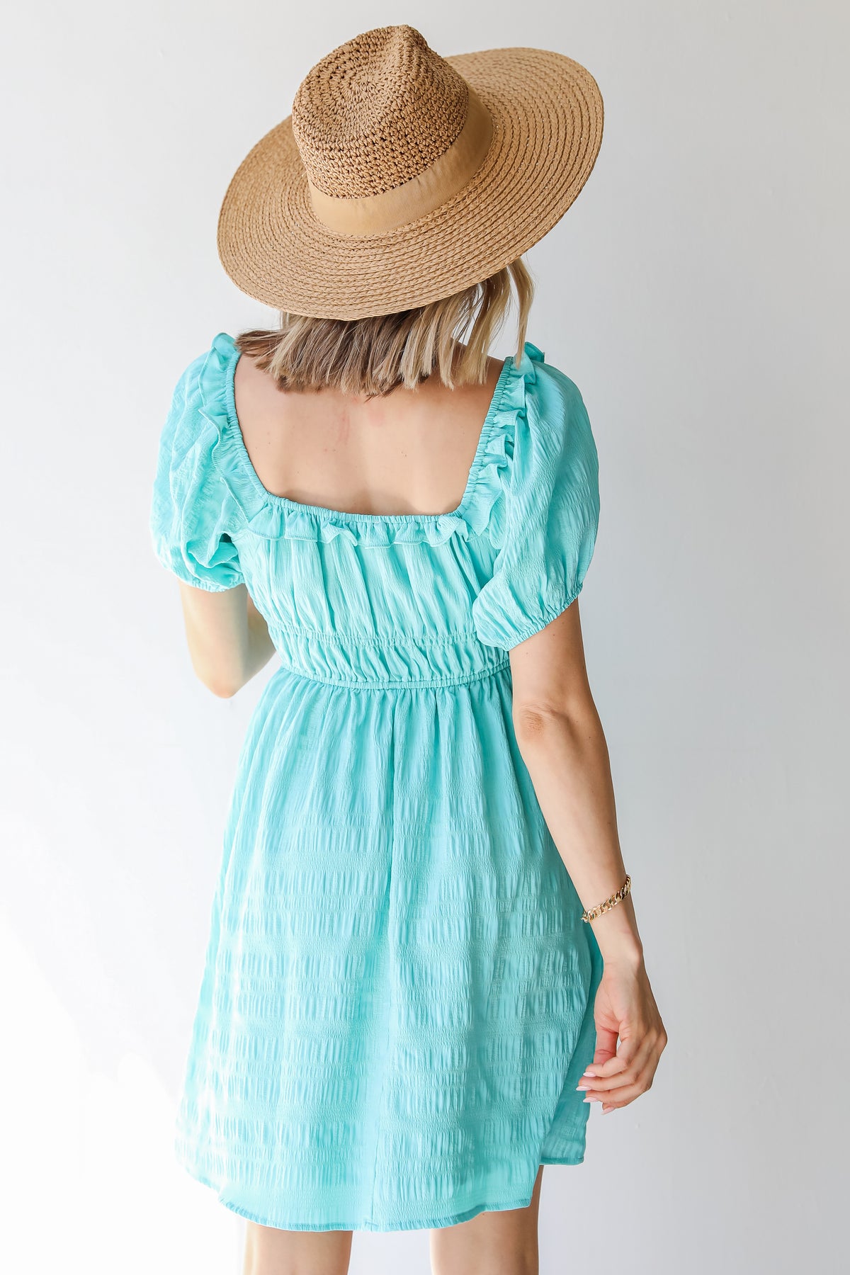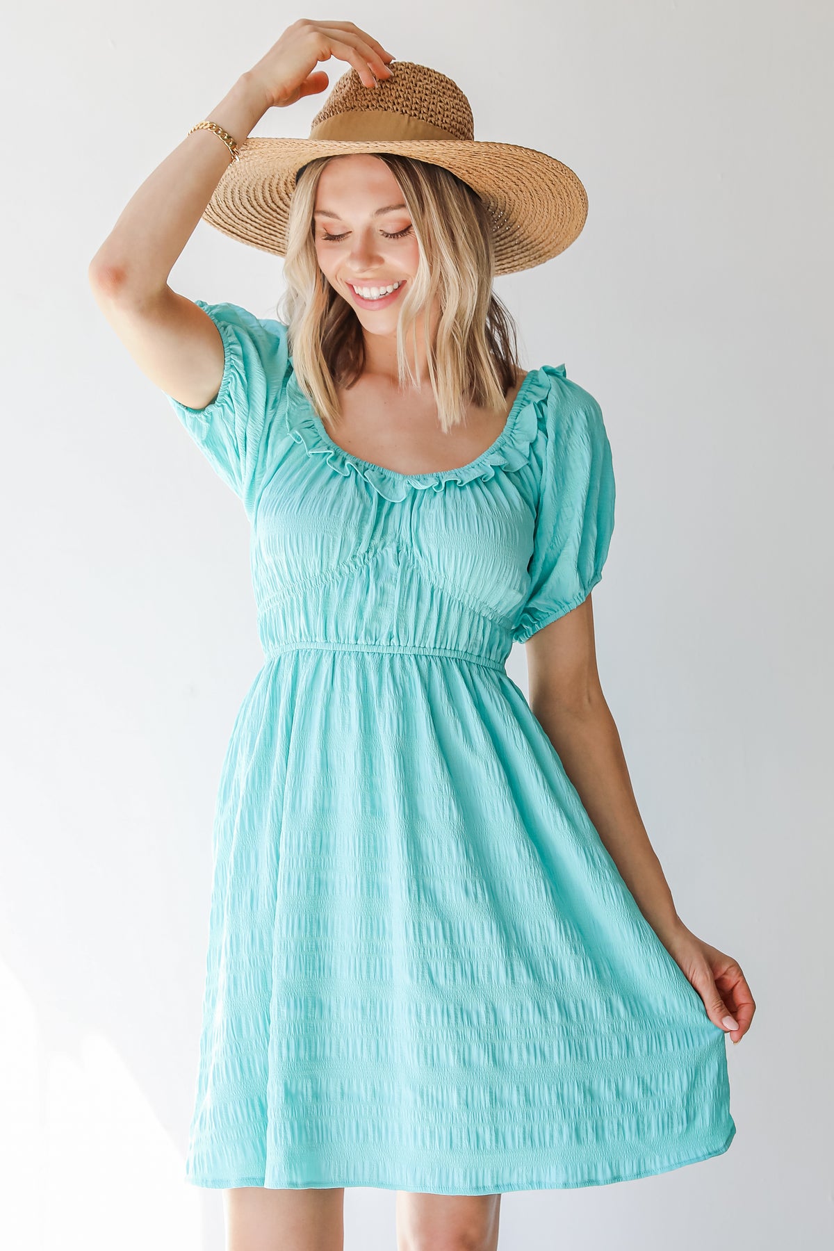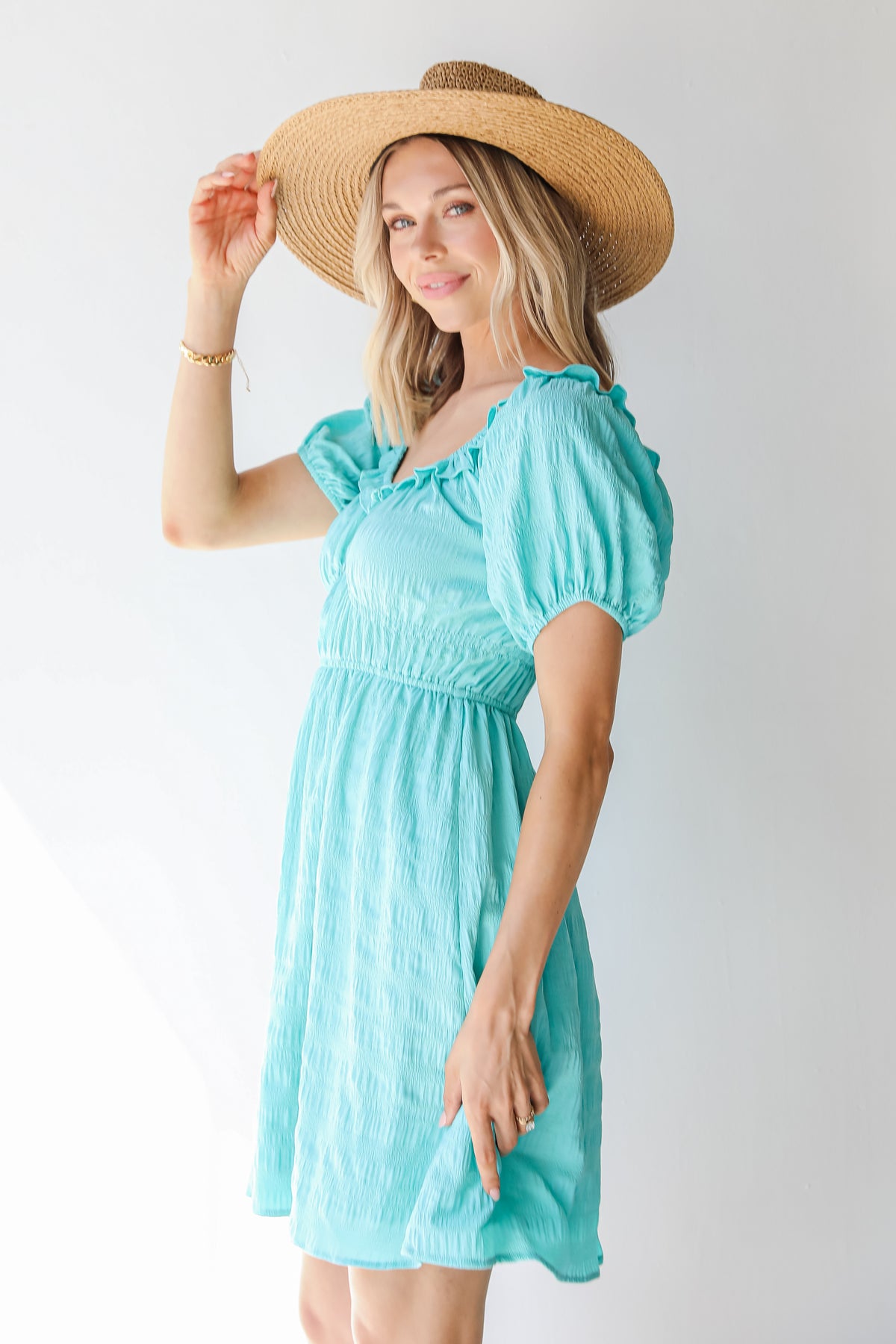Match the beauty of the summer sunset with a beauty of your own when you're wearing the Ocean Skies Mini Dress! This adorable dress is designed with a textured lightweight woven knit. It features a ruffled elastic v-neckline, elastic shoulders, short puff sleeves with elastic cuffs, an elastic waistband, and a relaxed fit that ends at a mini length. Style the Ocean Skies Mini Dress with platform espadrilles and gold jewelry for a girly summer outfit!