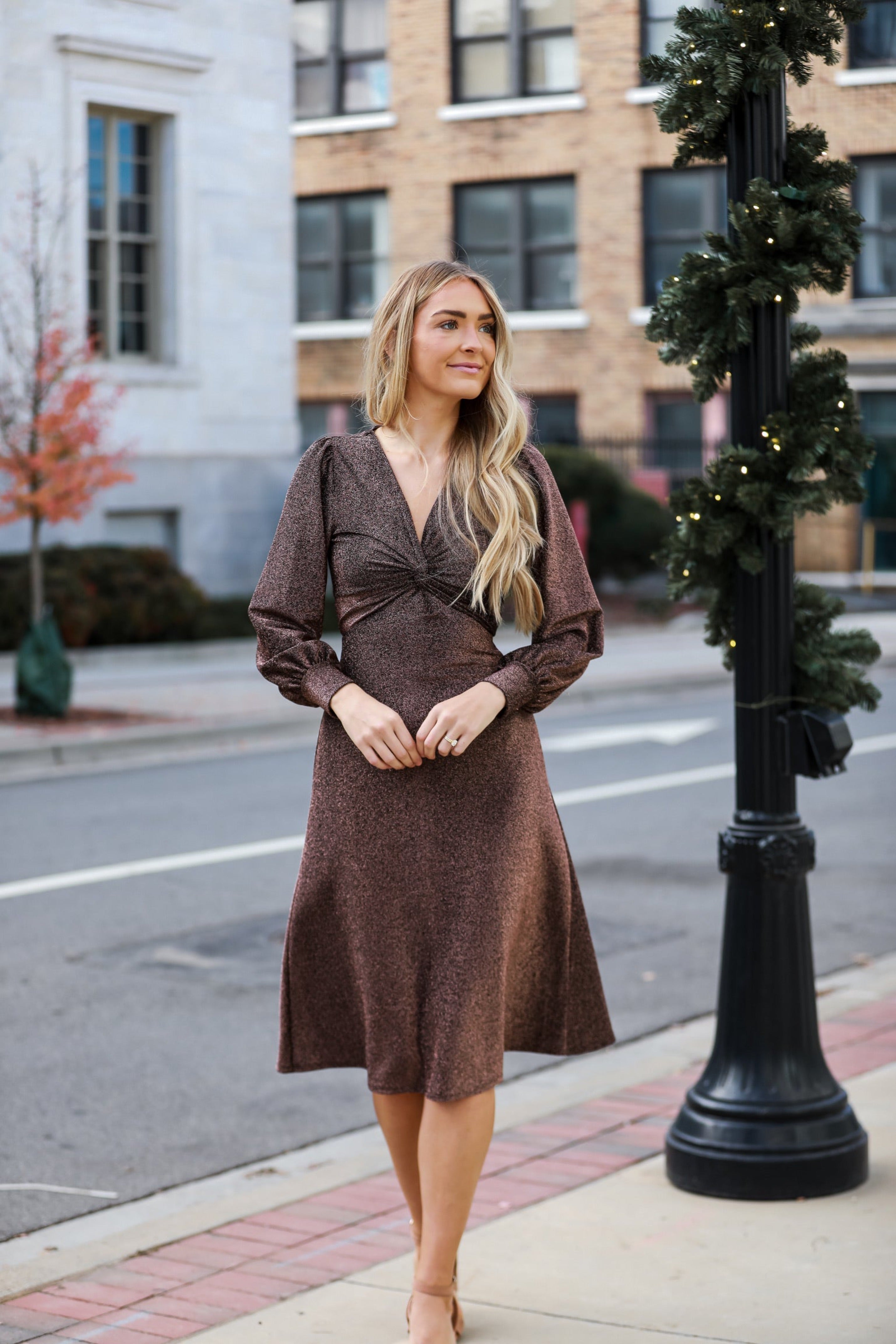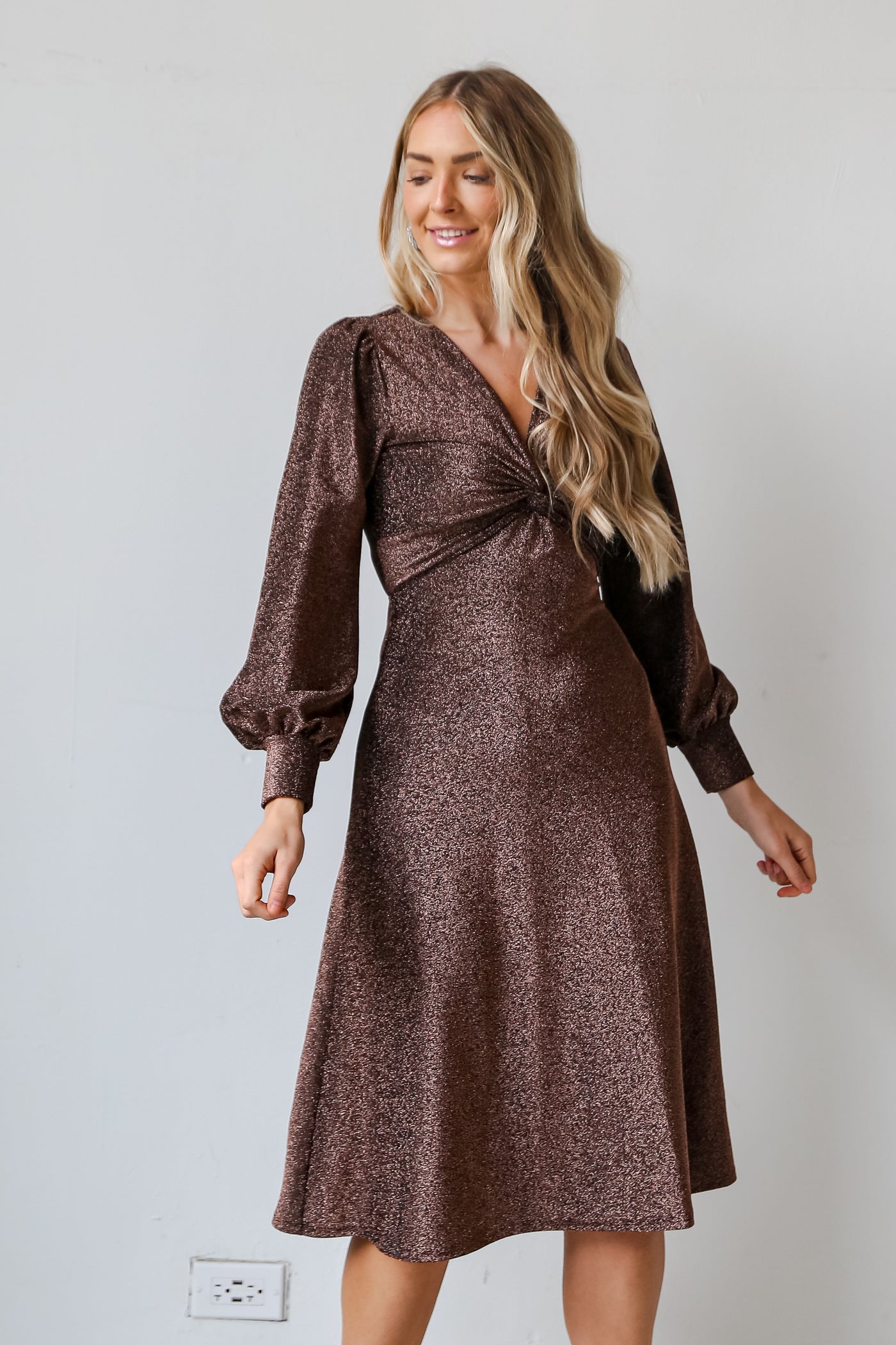 You'll be winning every style ranking when you wear the Precious Prize Black Metallic Midi Dress! Illuminate the night with our women's metallic long sleeve midi dress—a stunning fusion of sophistication and contemporary allure. This dress is a tribute to modern glamour, designed to captivate with its metallic sheen and timeless silhouette. The metallic fabric casts a radiant glow, catching and reflecting light to create a mesmerizing play of shimmer. Whether you're attending a chic evening soiree or a festive celebration, this dress ensures you'll be the embodiment of refined elegance. Whether you're sipping champagne at a cocktail party or dancing the night away at a glamorous event, this dress is your ticket to a radiant and unforgettable evening!