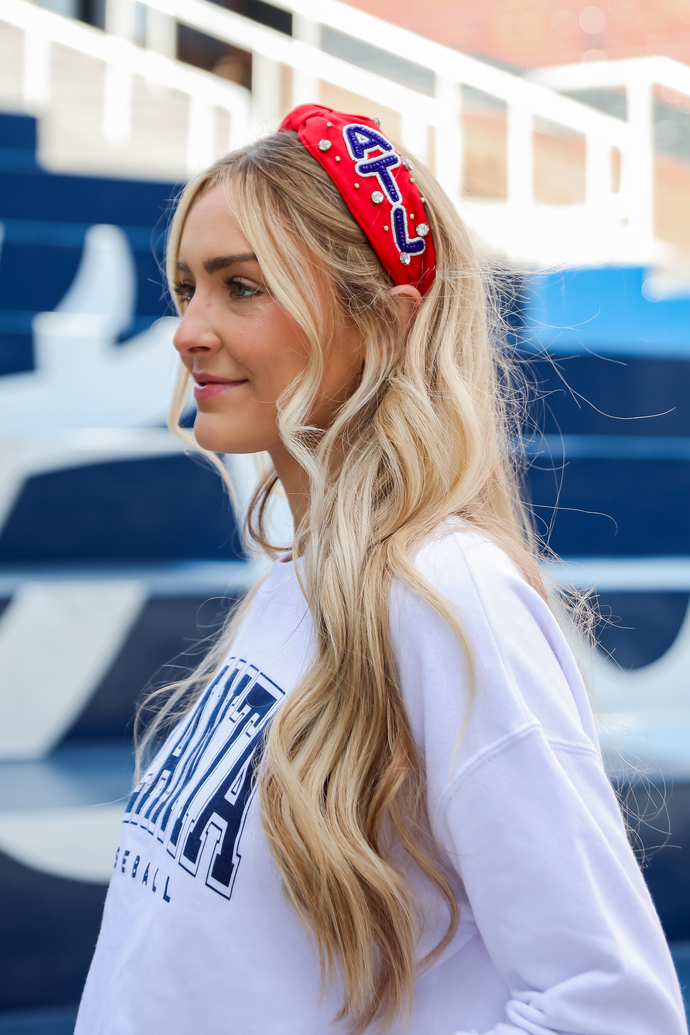 Heading to a baseball game soon? The Red ATL Beaded Knotted Headband would be the perfect finishing touch to your game day look! This adorable headband is designed with a soft knit material with beading that says "ATL", gemstones, + a knot detail on the top!