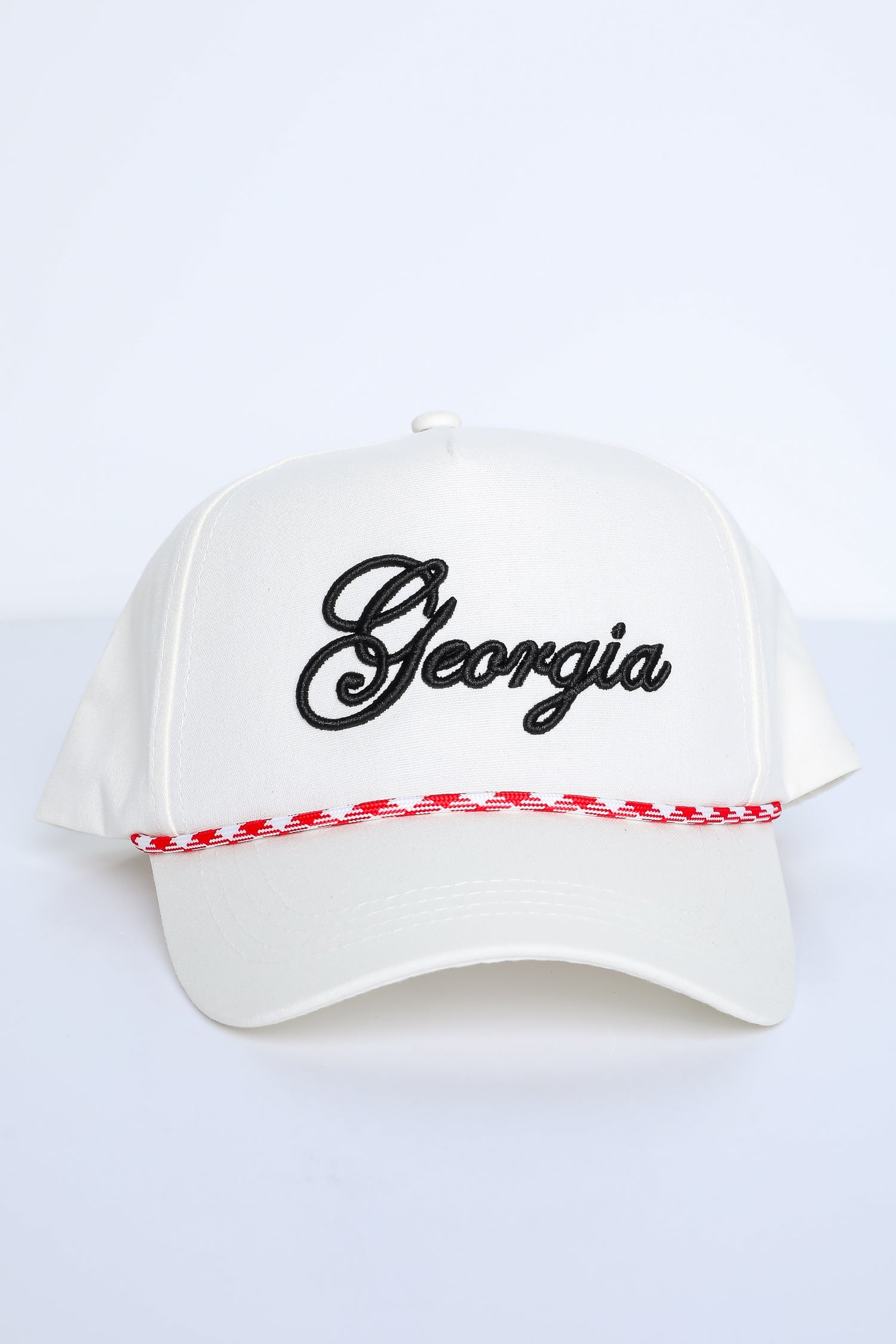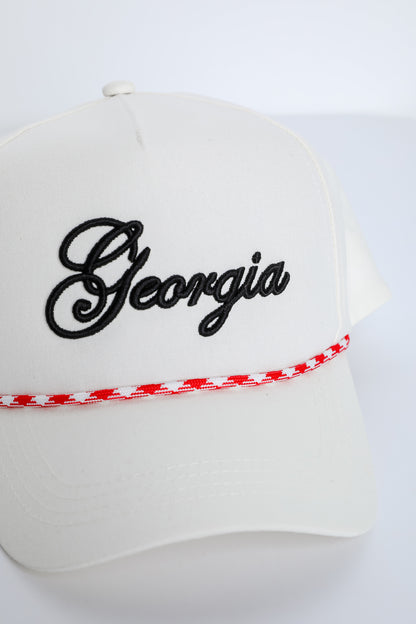 Calling all Dawgs fans, the Red Georgia Script Hat was made just for you! This cute hat is made of a soft cotton construction. It has a rounded top and a slightly rounded brim with "Georgia" embroidered on the front!
