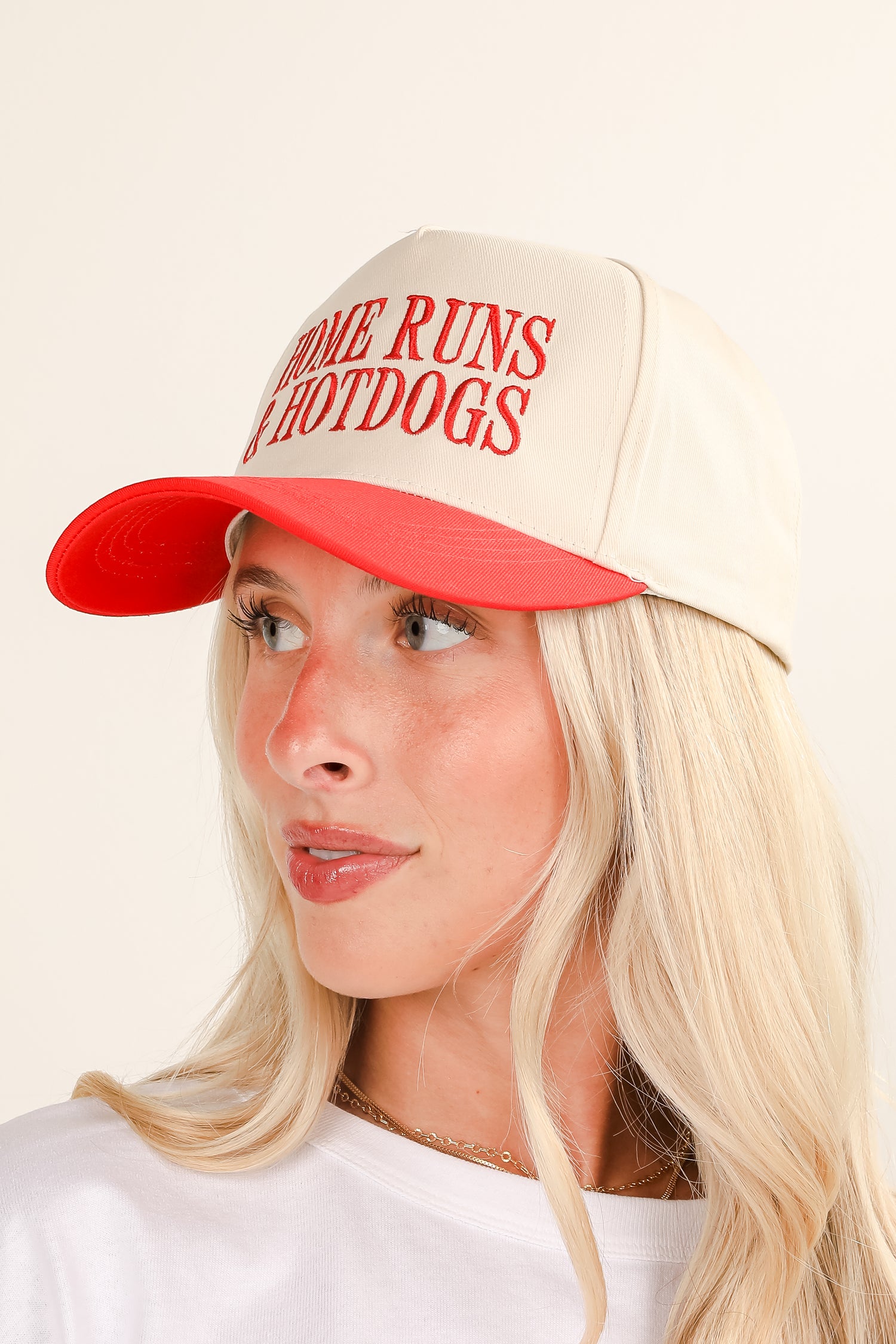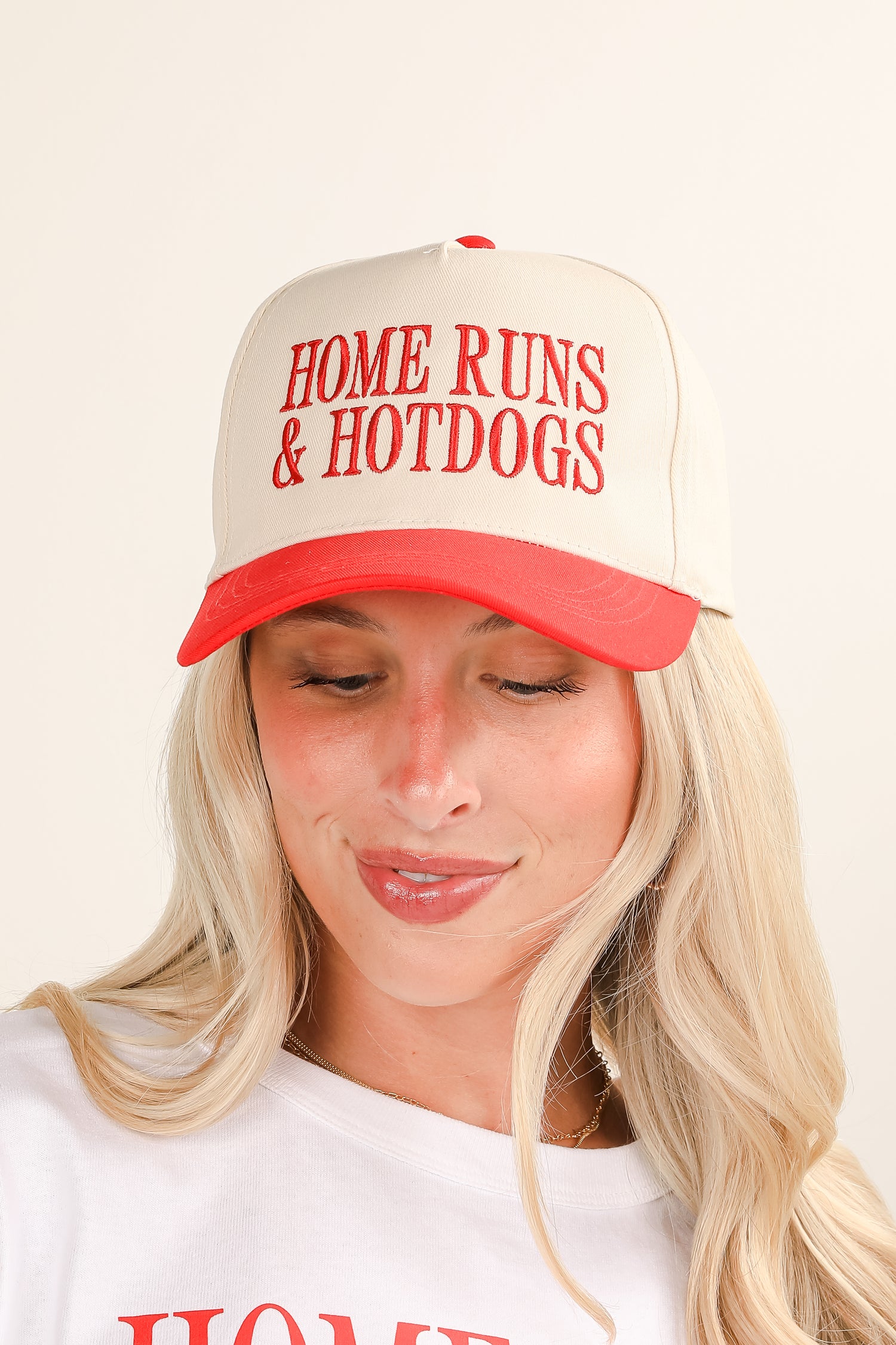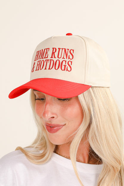 Calling all Atlanta residents, the Red Home Runs & Hot Dogs Embroidered Hat was made just for you! This cute hat is made of a soft cotton construction. It has a rounded top and a slightly rounded brim with "Home Runs & Hot Dogs" embroidered on the front!