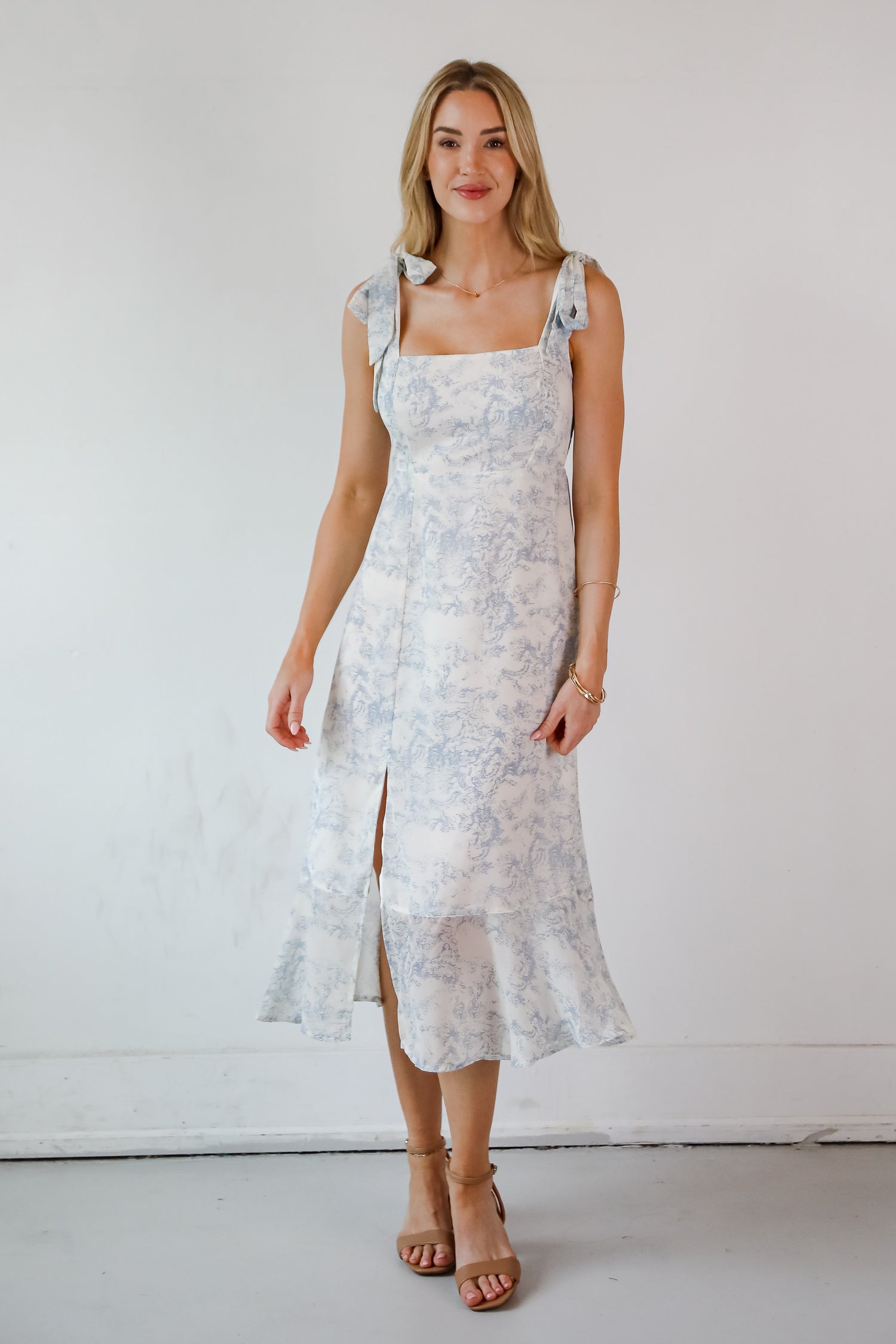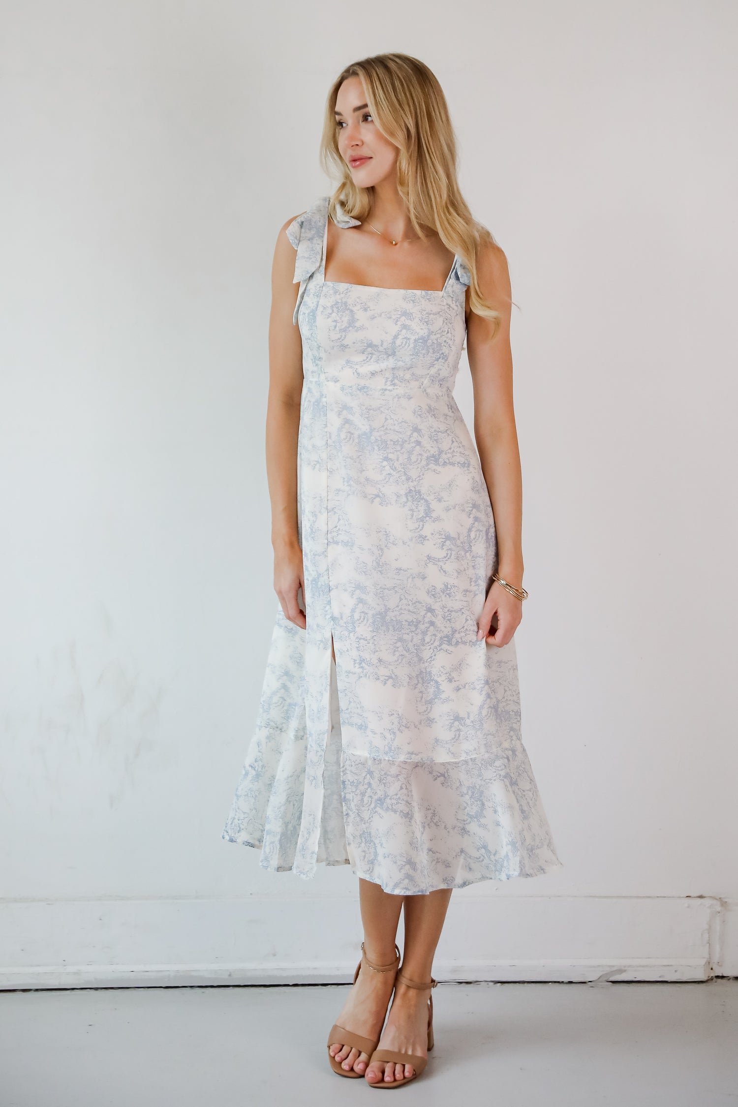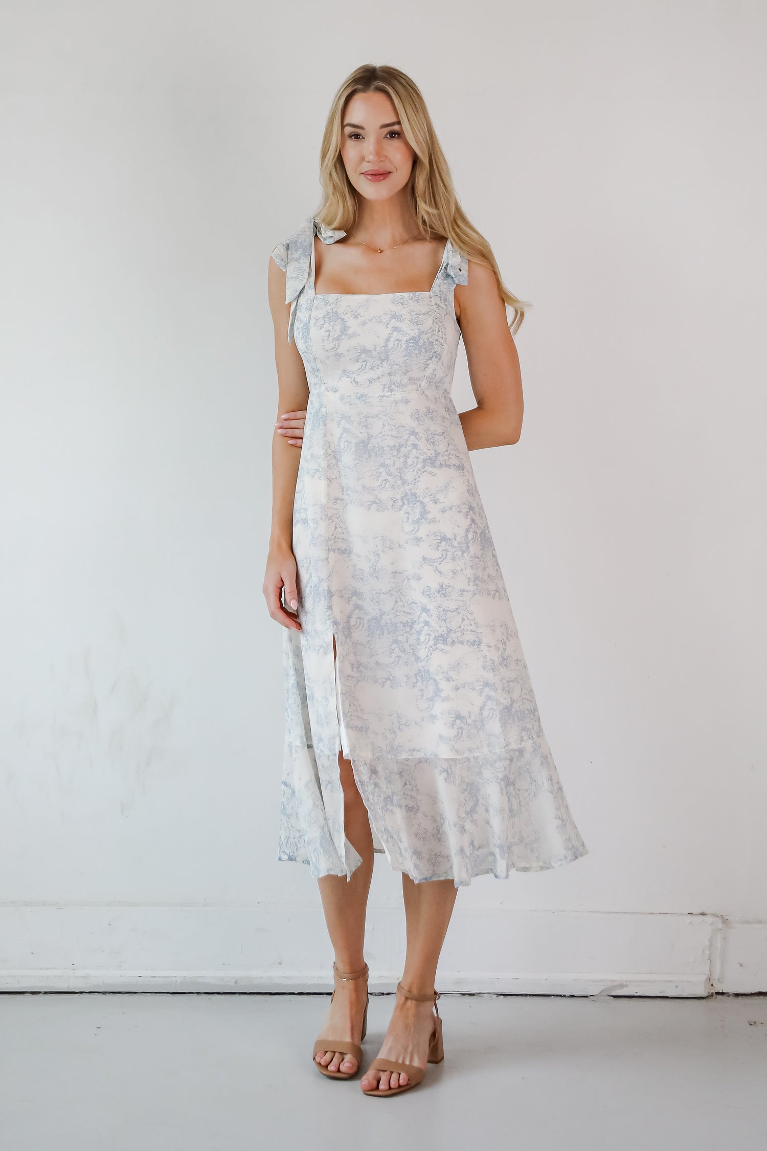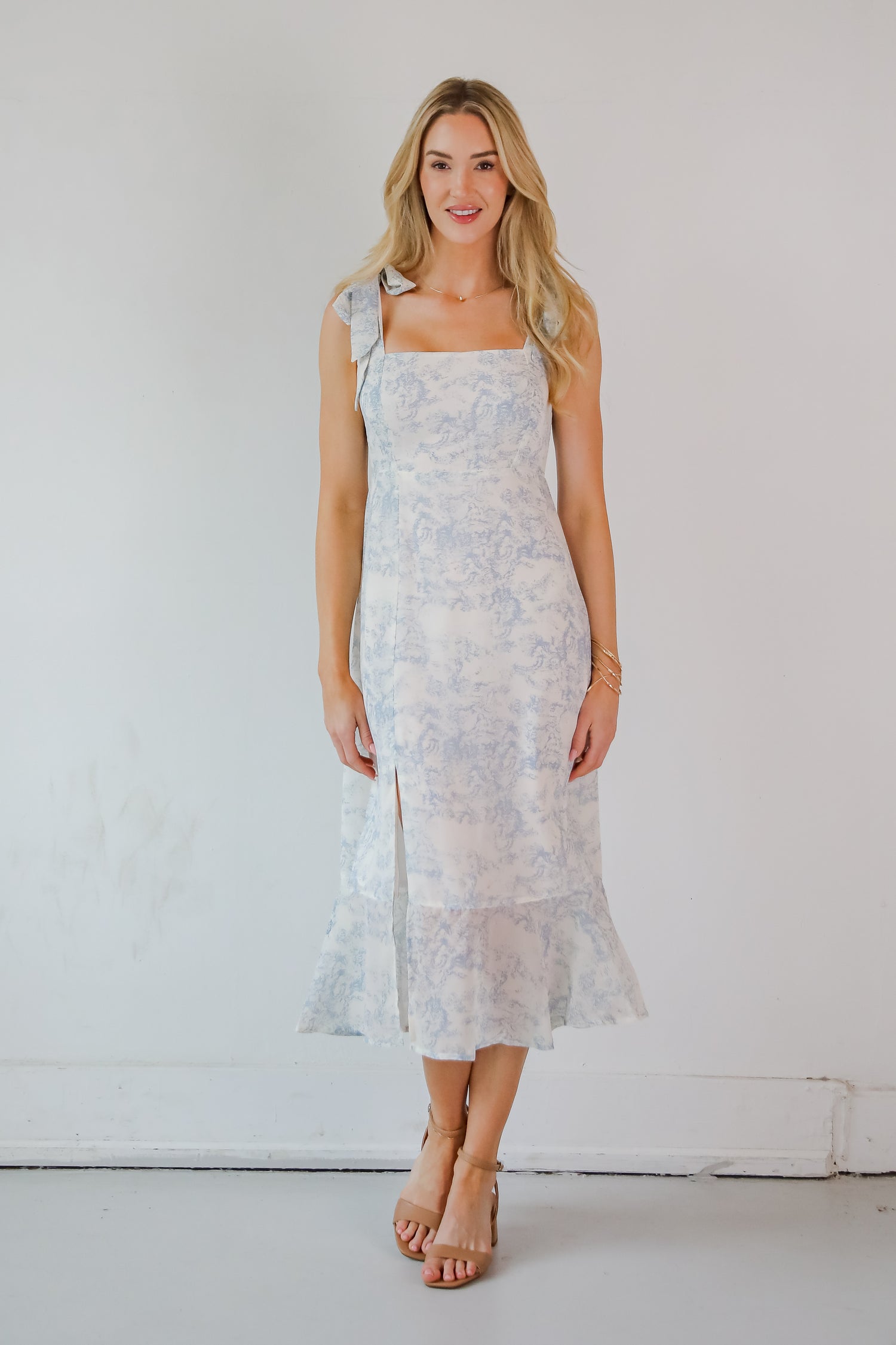 Step on the scene like a daydream in the Signature Sweetie Ivory Midi Dress! The unique abstract print in soothing blue tones adds an eye-catching touch, while the adjustable tie straps allow for a customizable fit. A sultry slit on the right leg adds a hint of allure, making it the perfect choice for an evening out or a special occasion. With its flattering midi length and versatile style, this dress can easily transition from day to night with the right accessories!
