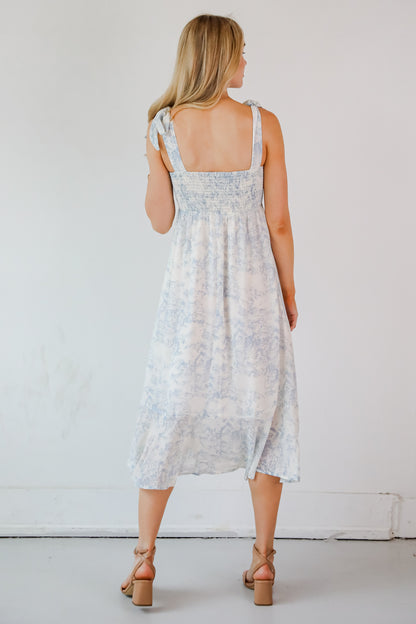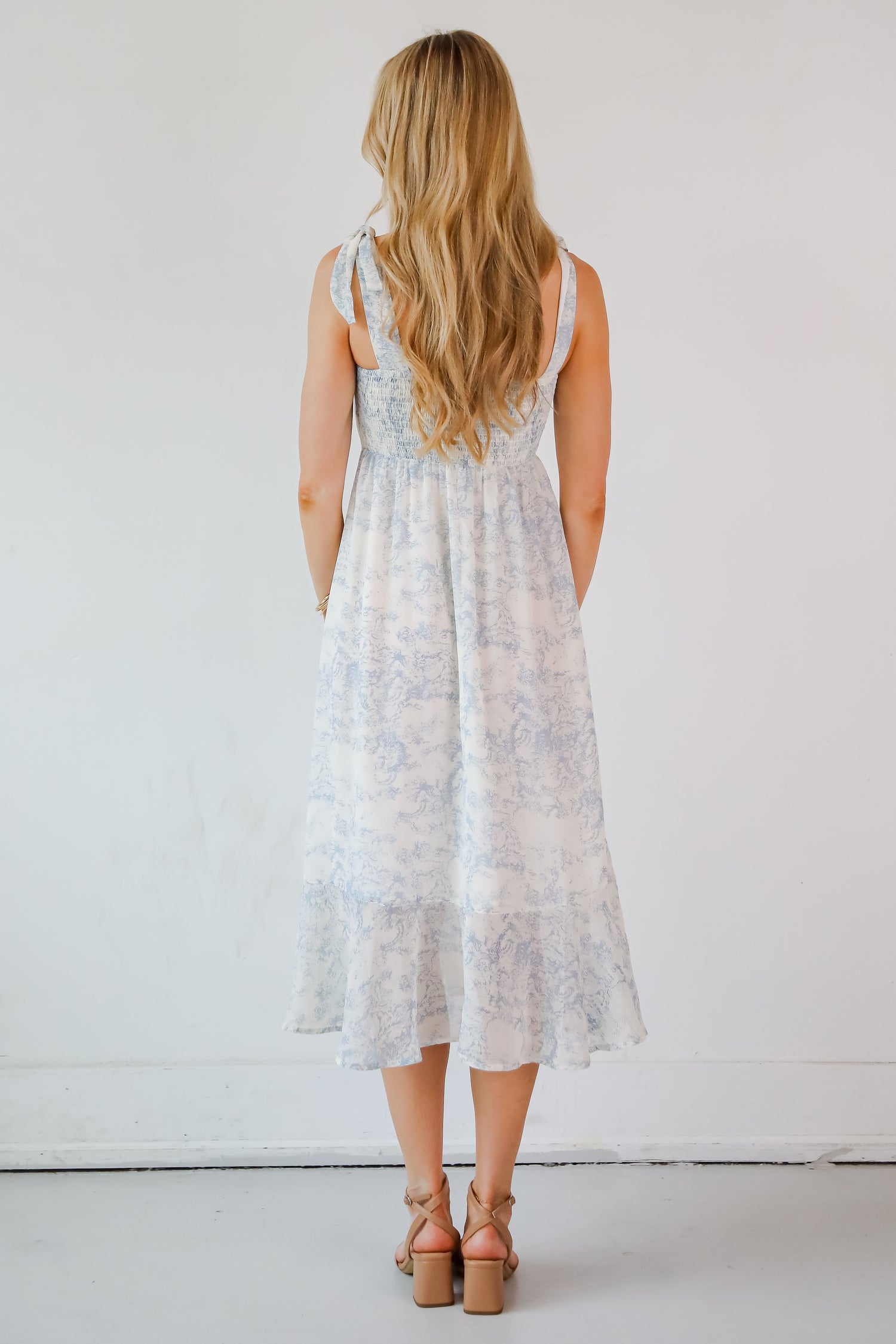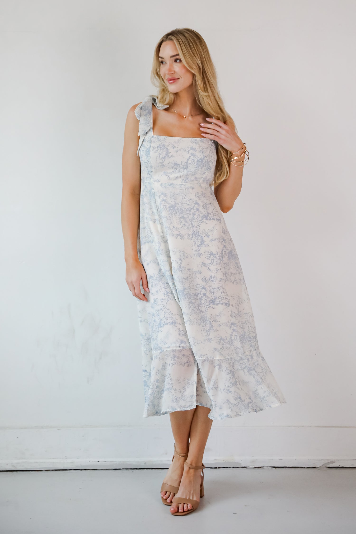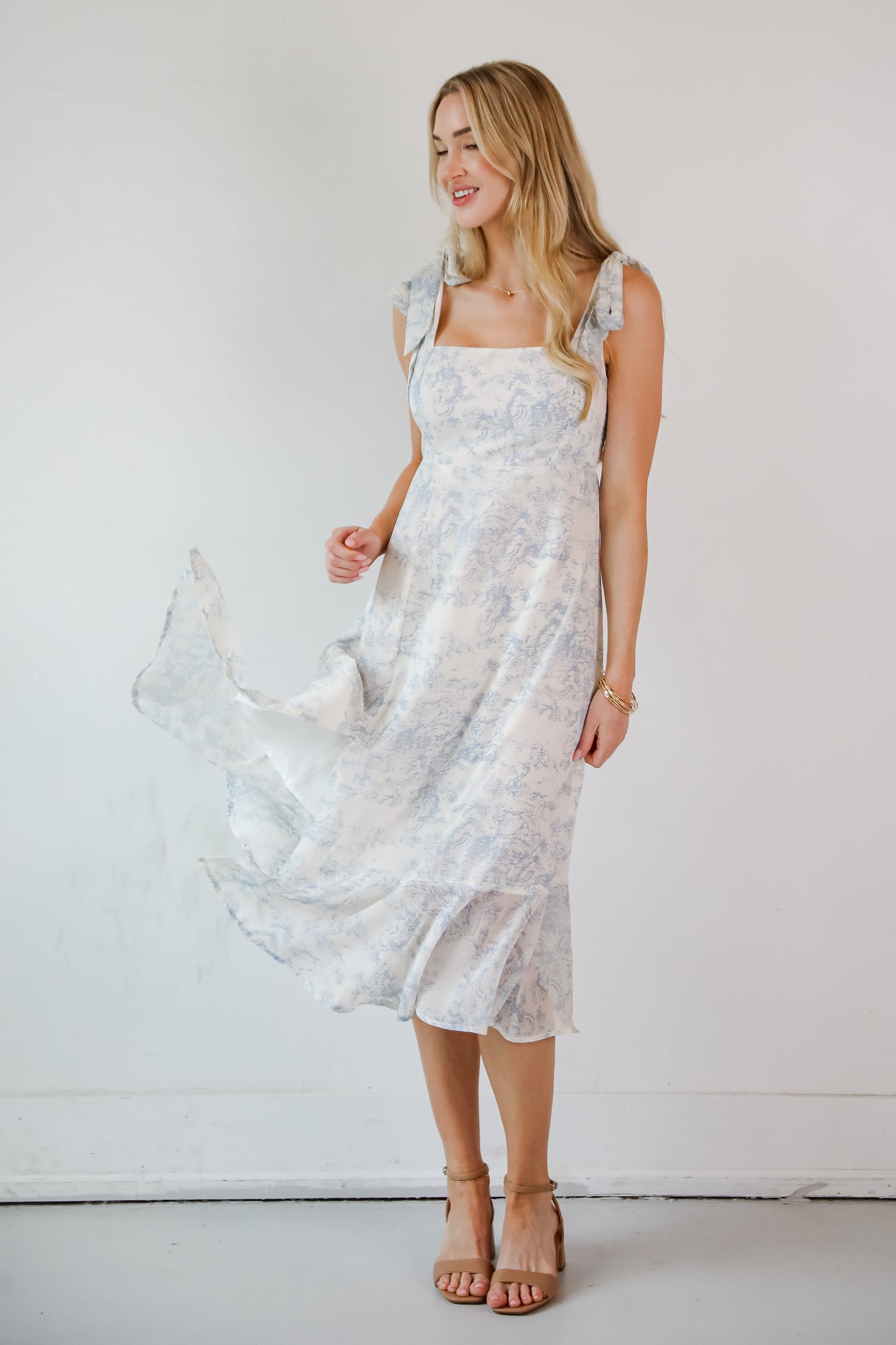 Step on the scene like a daydream in the Signature Sweetie Ivory Midi Dress! The unique abstract print in soothing blue tones adds an eye-catching touch, while the adjustable tie straps allow for a customizable fit. A sultry slit on the right leg adds a hint of allure, making it the perfect choice for an evening out or a special occasion. With its flattering midi length and versatile style, this dress can easily transition from day to night with the right accessories!