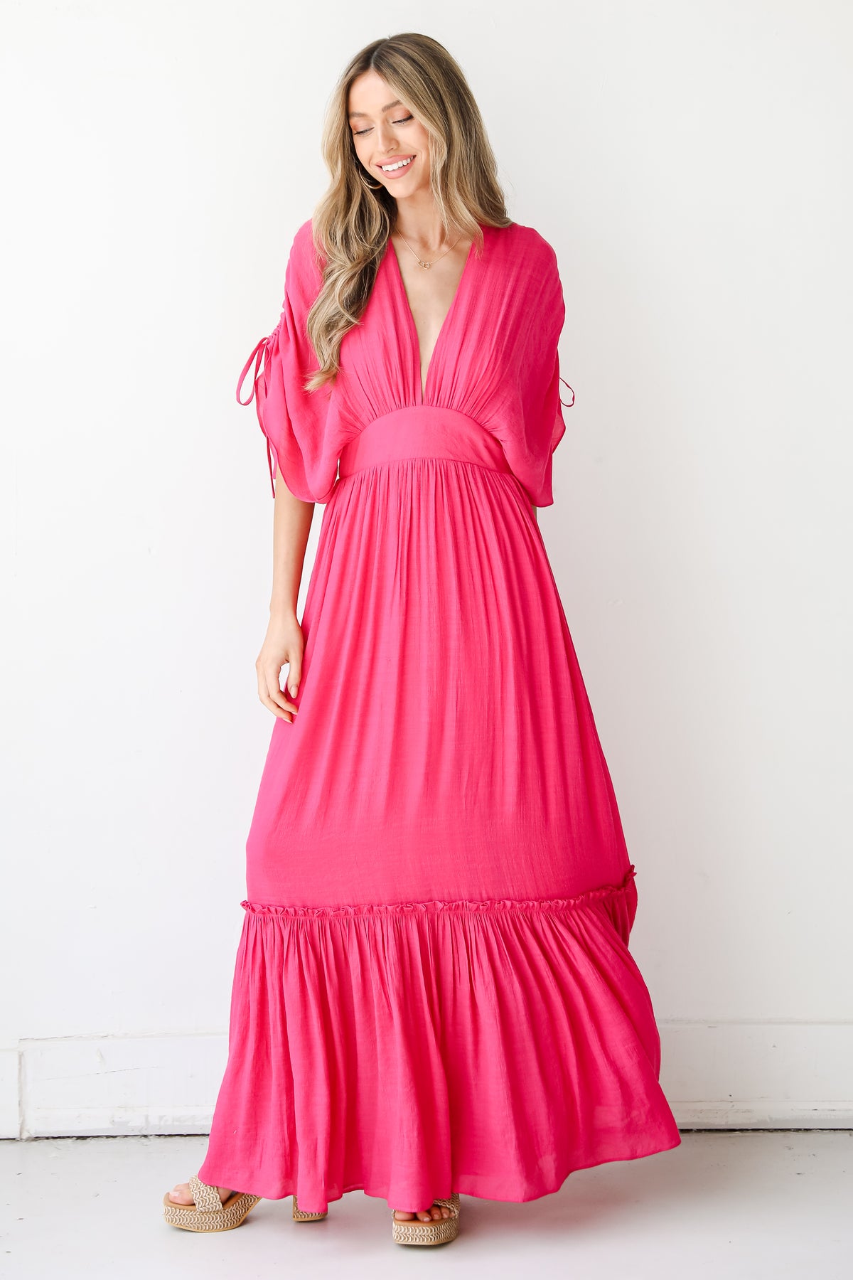 Summer is on the way, so make sure you're prepared with the Signs Of Sunshine Maxi Dress! This stunning dress is designed with a lightweight woven knit. It features a deep v-neckline, short drop sleeves with functional drawstring ruching on the shoulders, and a flowy fit with a ruffle hem that ends at a maxi length. It also has an open back with a back zipper + functional button + keyhole! Style the Signs Of Sunshine Maxi Dress with espadrilles and gold jewelry for a beachy outfit!
