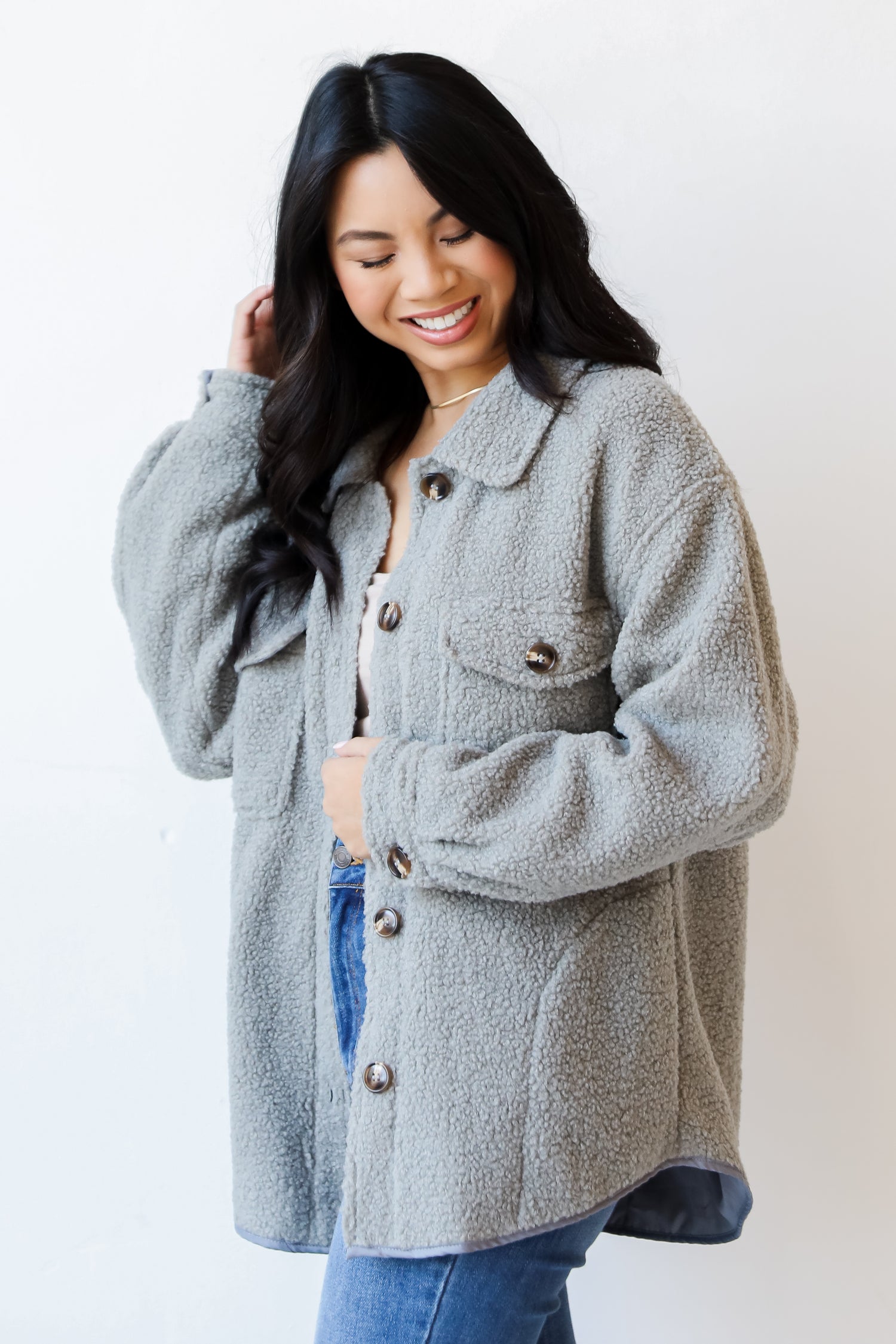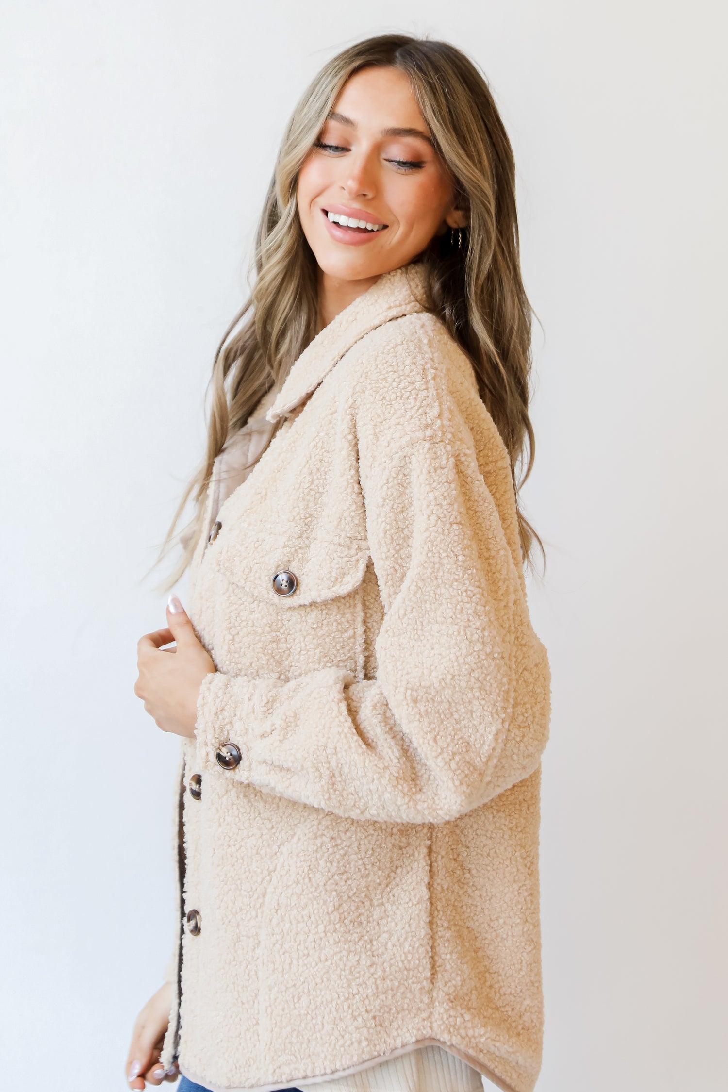 We're feeling the love for the Warmly Yours Teddy Jacket this season! This cozy jacket is made of a soft and fuzzy teddy material. It features a collared neckline, a functional button front, long sleeves with functional button cuffs, and a relaxed fit with side pockets + front flap pockets. Style the Warmly Yours Teddy Jacket with sweaters and denim for a cozy winter look! Available in 3 colors.