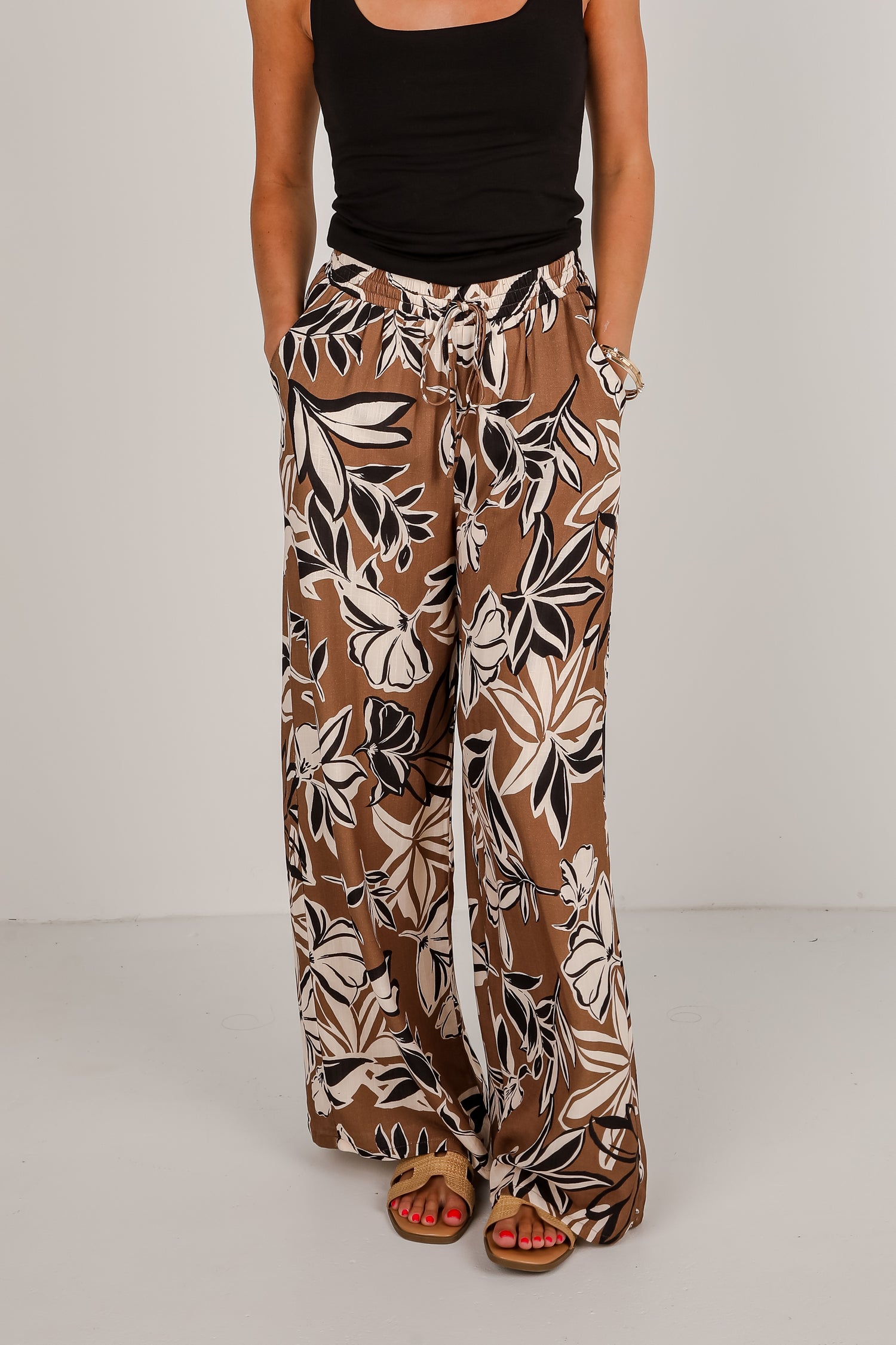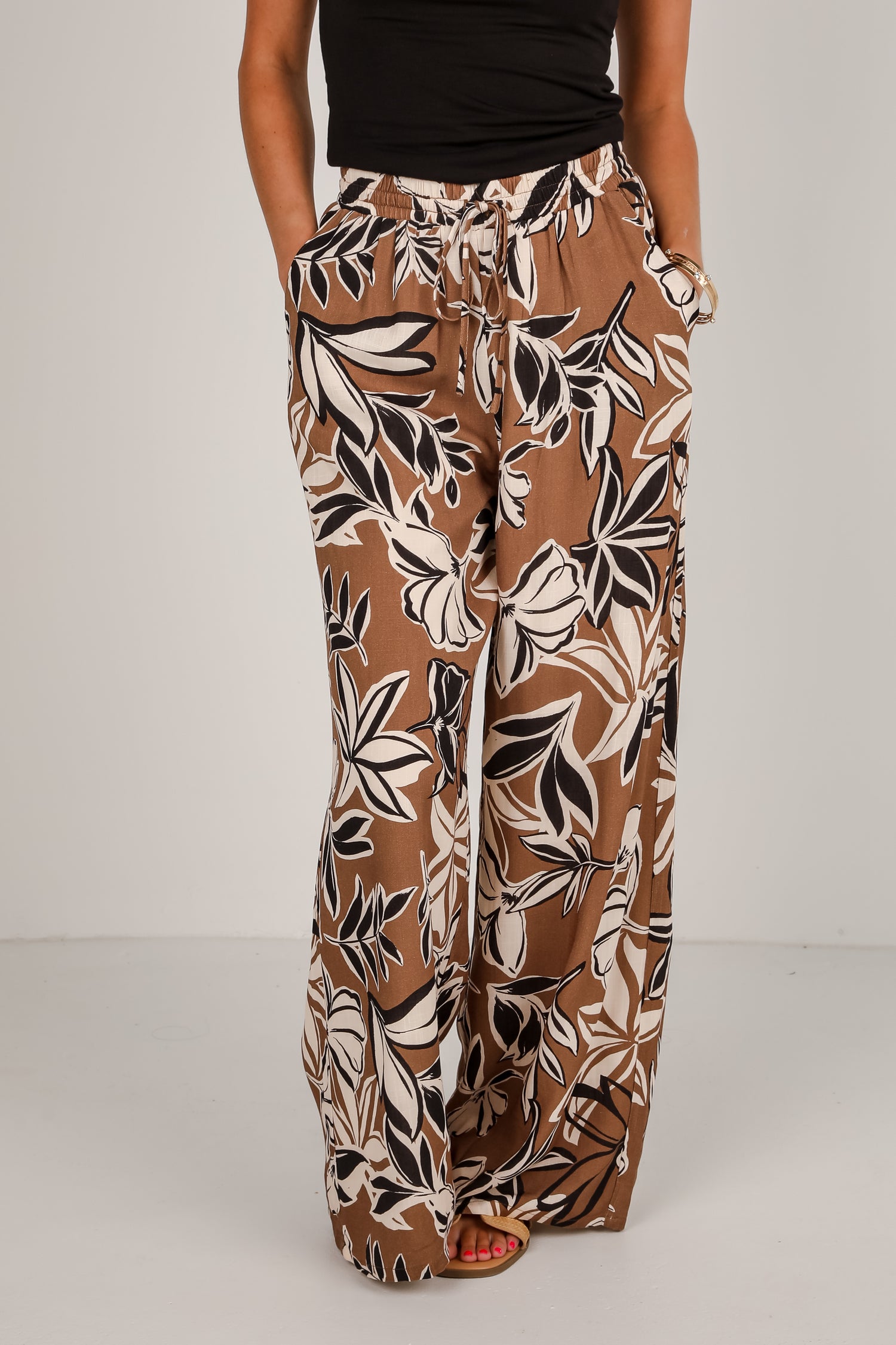 The Spend Some Time Taupe Floral Wide Leg Pants are bound to be an instant crowd-pleaser! Designed with a soft, neutral taupe hue and a beautiful floral print, these pants combine comfort and style. The wide-leg silhouette creates a flattering, flowy look, while the elastic waistband and adjustable drawstring tie ensure a perfect fit. Whether you're dressing them up for a dinner out or keeping it casual for weekend outings, these pants are the perfect blend of relaxed and chic!