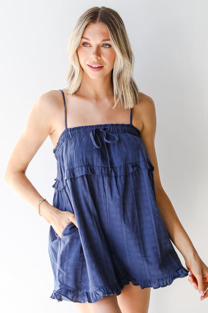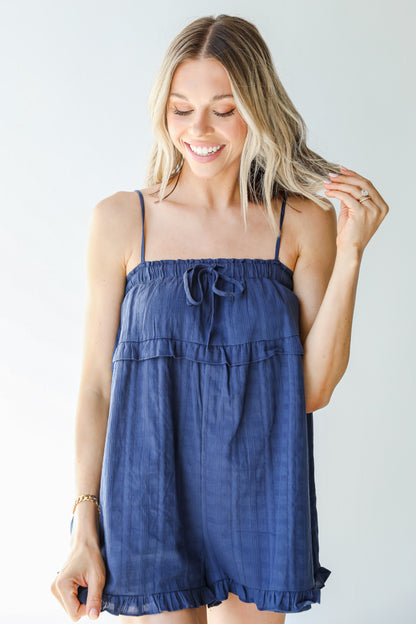 Throw on the Summer Fling Romper and make it a summer to remember! This cute romper is designed with a textured lightweight woven knit. It features an elastic ruffled straight neckline with a functional drawstring tie, adjustable spaghetti straps, and a relaxed fit with ruffle hems. It also has side pockets! Style the Summer Fling Romper with heels and a straw clutch for a trendy beach look! Available in 2 colors.